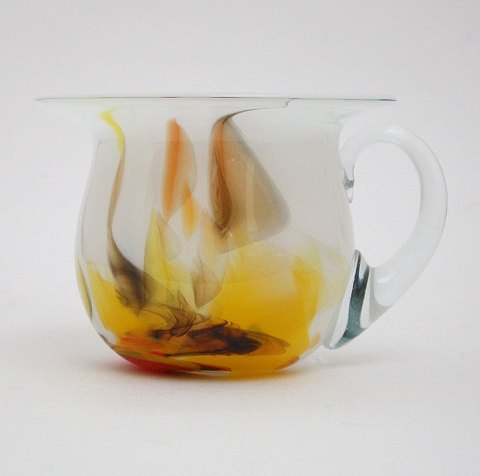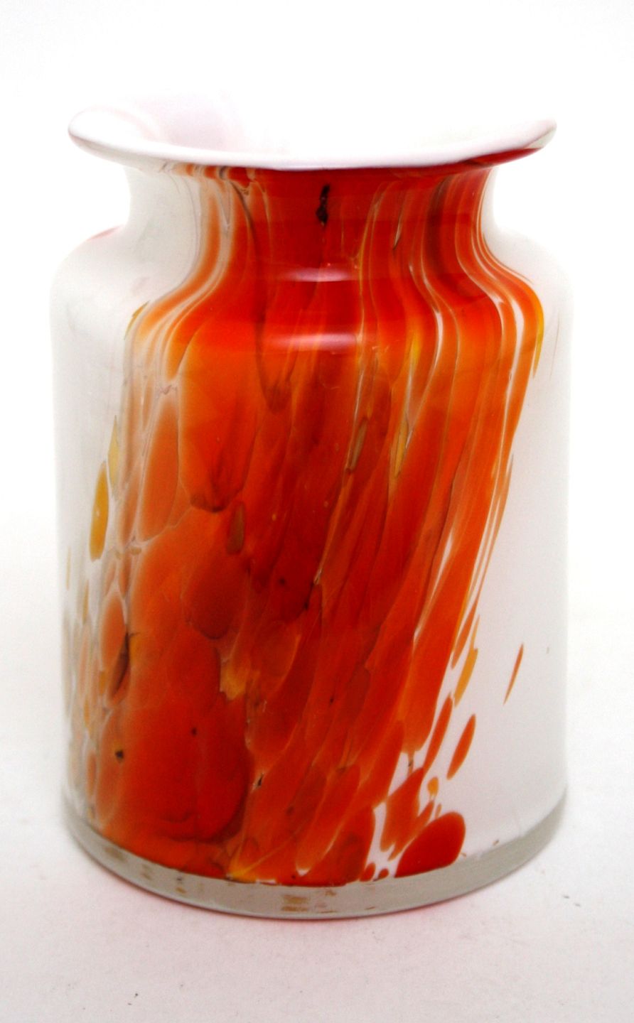 Holmegaard, Cascade vase designet af Per Lütken i 1970. Mundblæst opalhvid glas med indlagte skår i røde og orange farver. Ikke signeret. Højde 13,8 cm. Diameter 10 cm. Pris: SOLGT