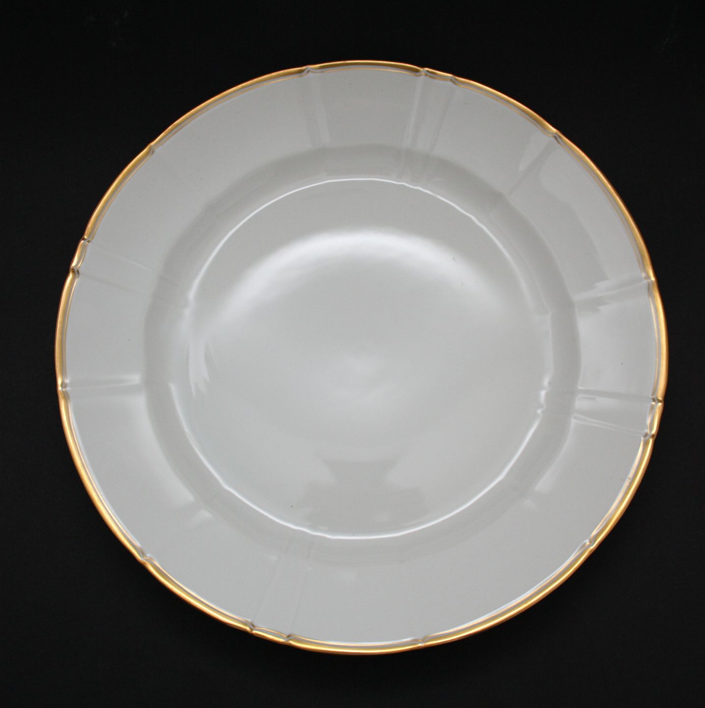 Bing & Grøndahl, Offenbach, hvidt porcelæn med knækkede kanter og guld. Rundt fad. Dek.nr. 376. Diameter 32 cm. I. sortering. Pris: SOLGT