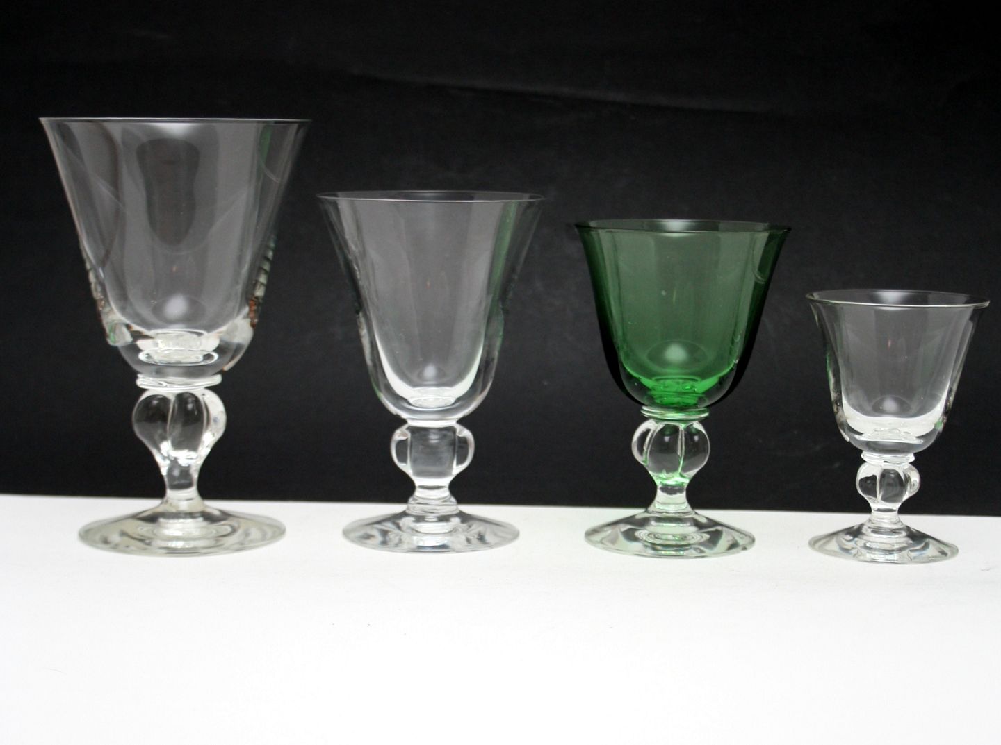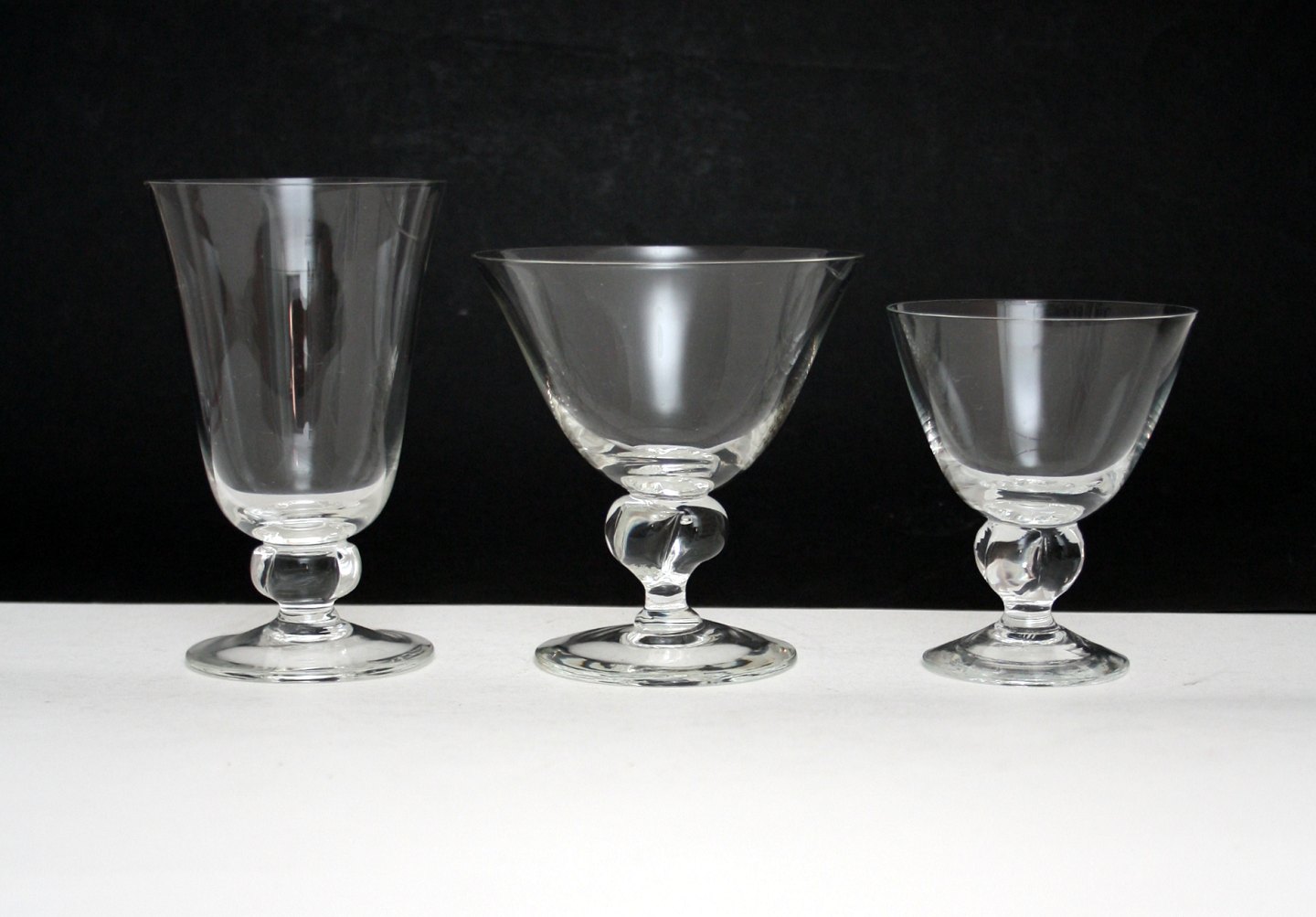 Holmegaard glasværk 1938-60, Gammelholm designet af Per Lütken. Kugleformet stilk klemt med en 4 eller 5 benet saks. Der er tvivl om oprindelsen på rødvin, vandglas, champagne og likør.