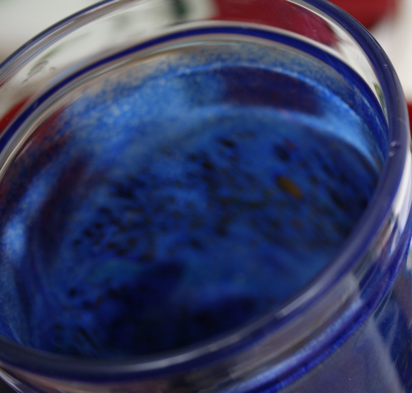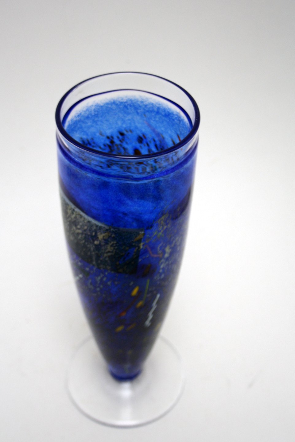 Kosta Boda, Satellit, Blå vase med indlagt glas i forskellige farver. Designet af Bertil Vallien. Signeret Kosta Boda artist studio B Vallien 49252. Højde 29 cm. Øverste diameter 9 cm. Flot stand, men med mikroskopisk chip på øverste kant. Pris: SOLGT