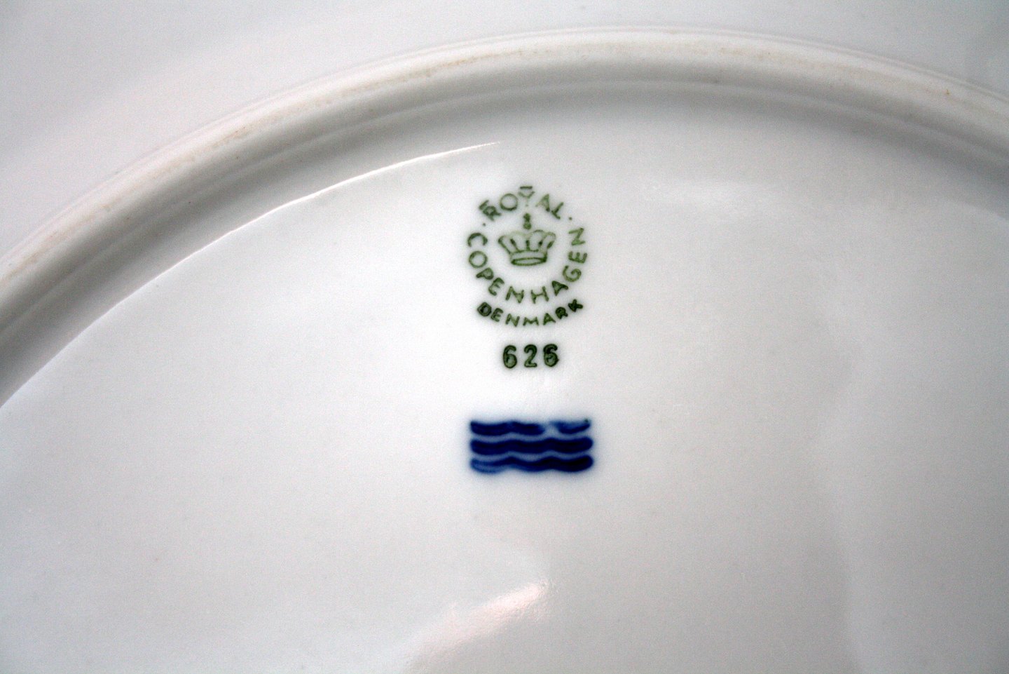 Royal Copenhagen, (normalt B&G) Offenbach, hvidt porcelæn med knækkede kanter og guld. Rundt fad eller dækketallerken. Dek.nr. 626. Diameter 27 cm. I. sortering. Pris: SOLGT