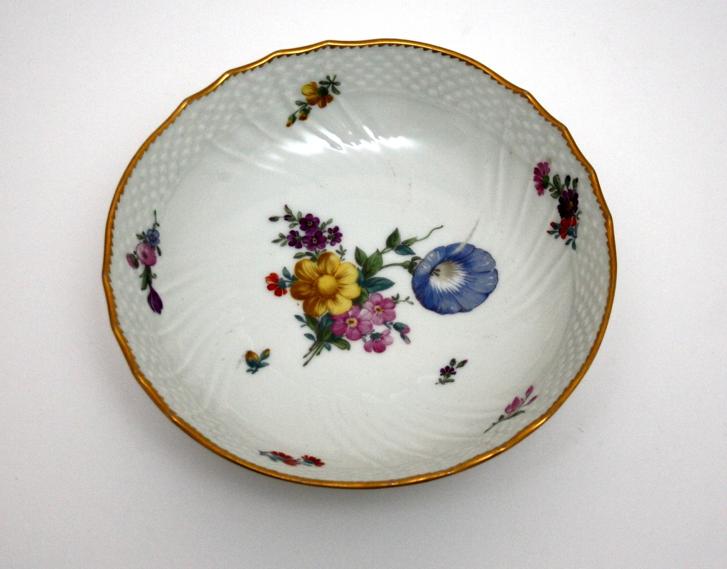 Royal Copenhagen, Saksisk Blomst, Lav kageopsats. Hvidt svejfet porcelæn med guldkant/bort og forskellige blomster. Dek. nr. 1532. I. sortering. Diameter 17 cm. Højde 6 cm. Flot stand. Pris: SOLGT