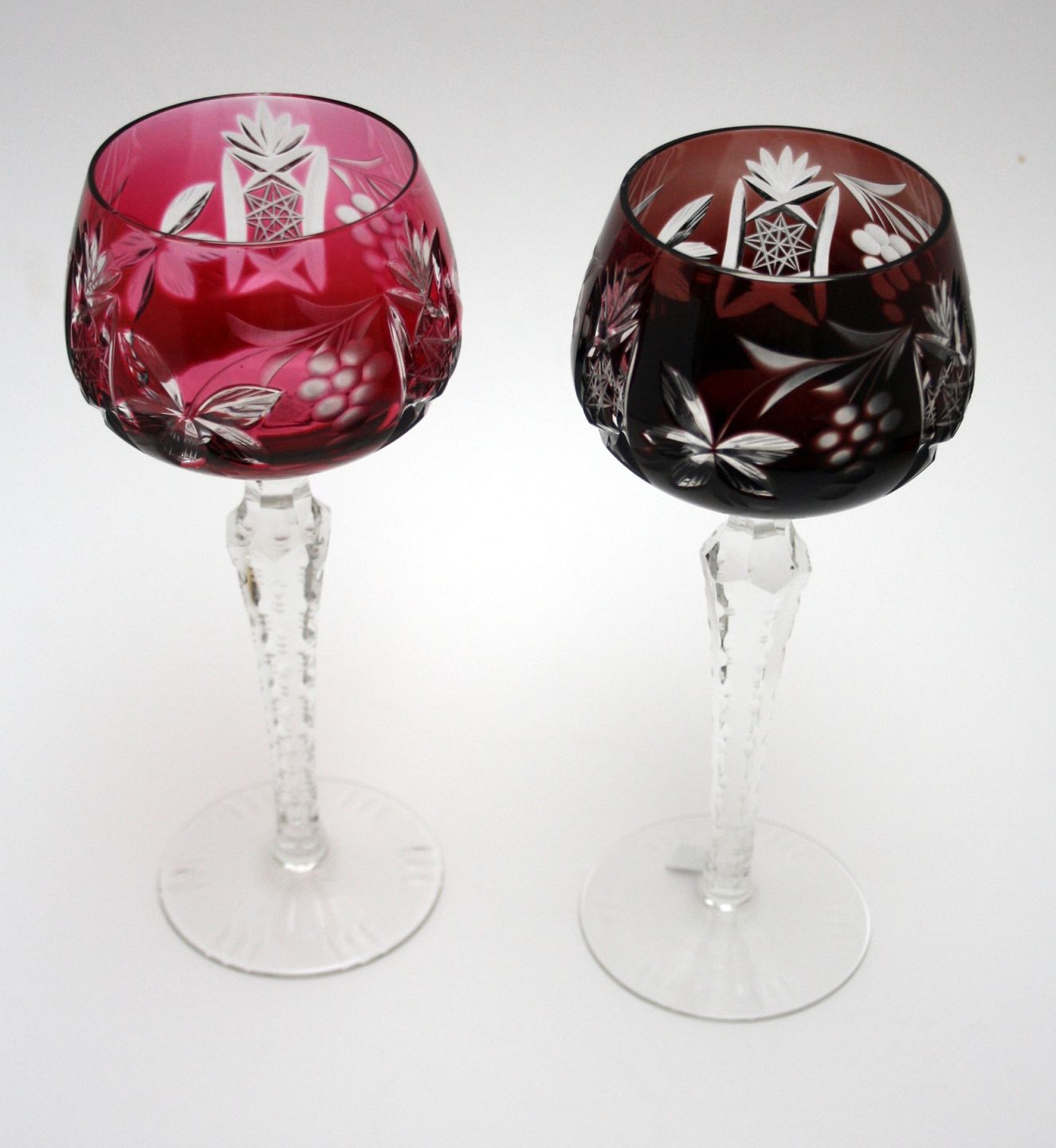 Bøhmisk krystal, Vinglas med slebet kumme med vinklaser, blade og stjerne, samt slebet stilk. Højde 19,5 cm. Pris: 250 kr. stk. Rød. Lager: SOLGT Aubergine. SOLGT B2