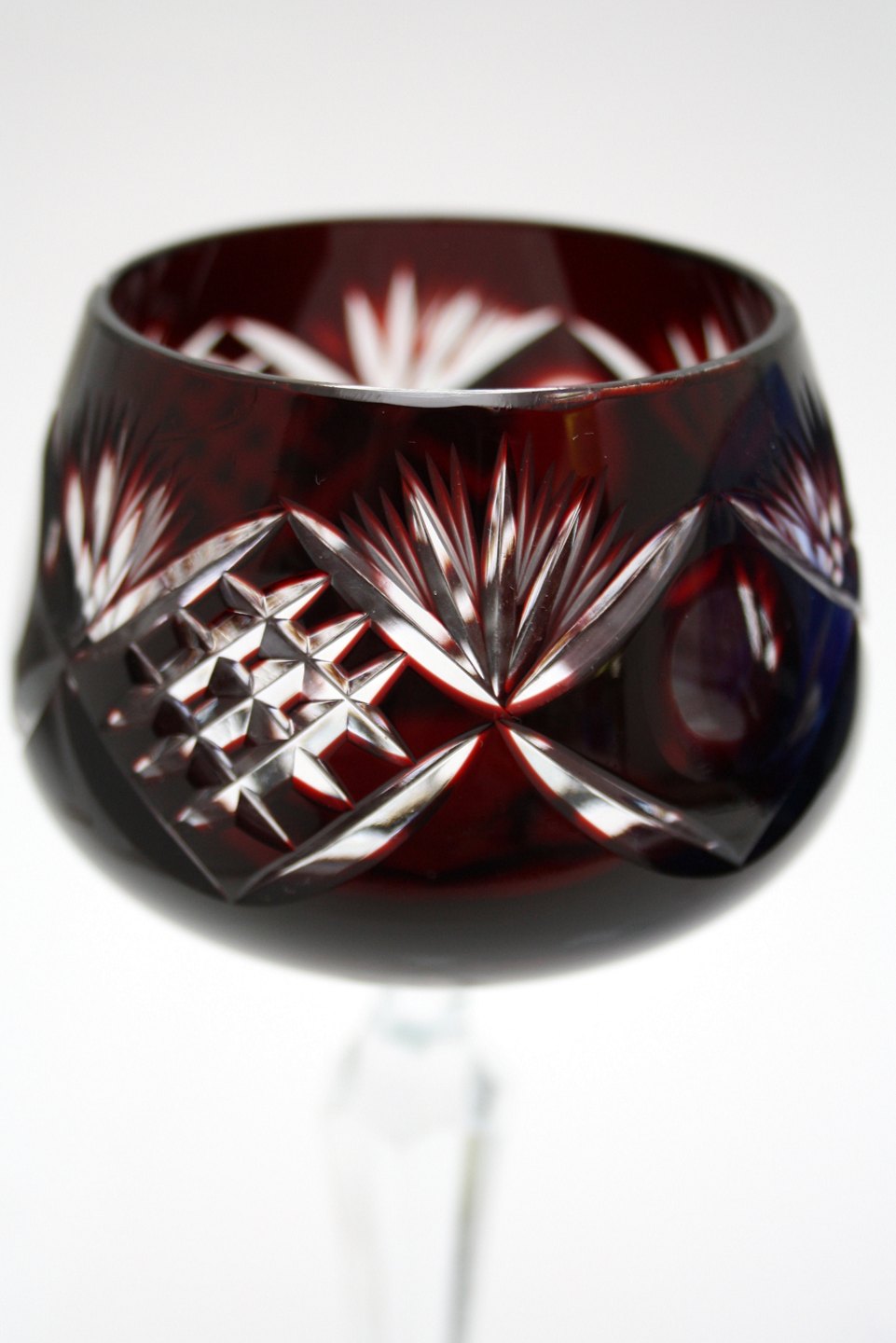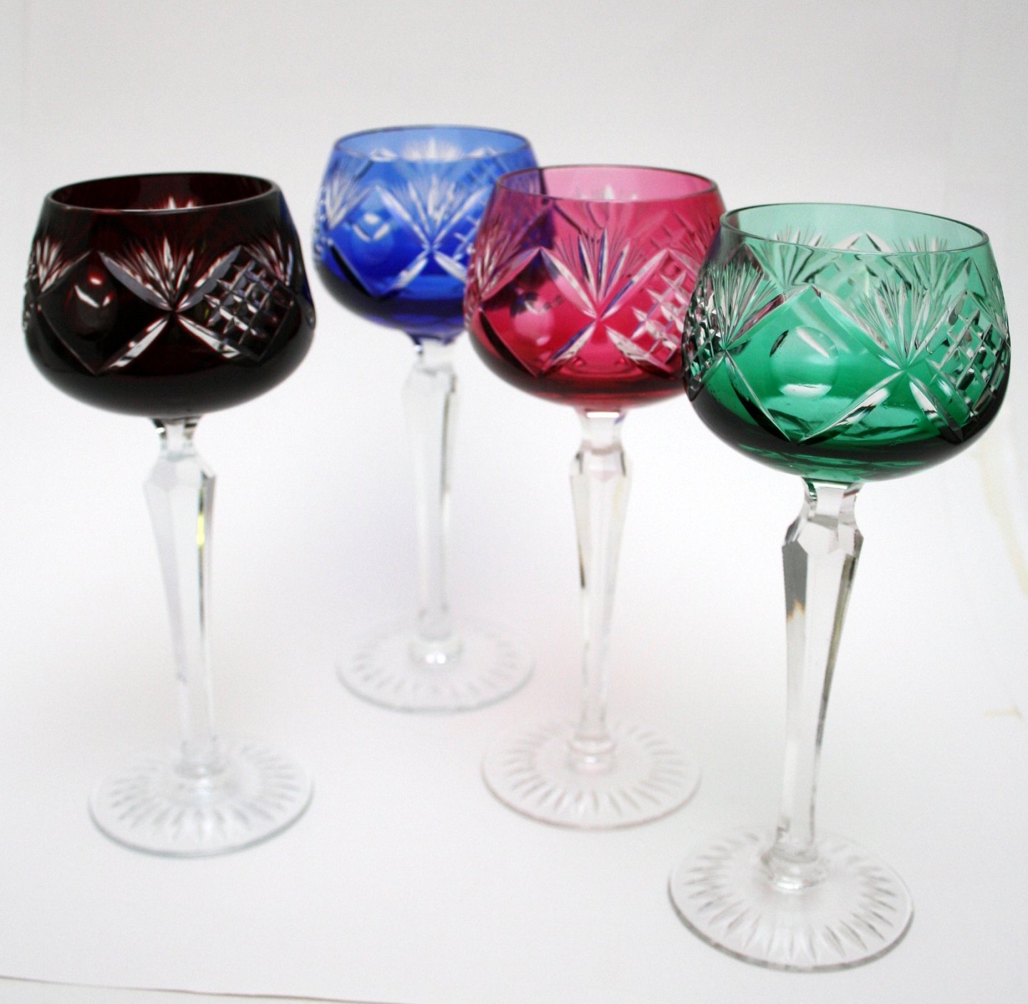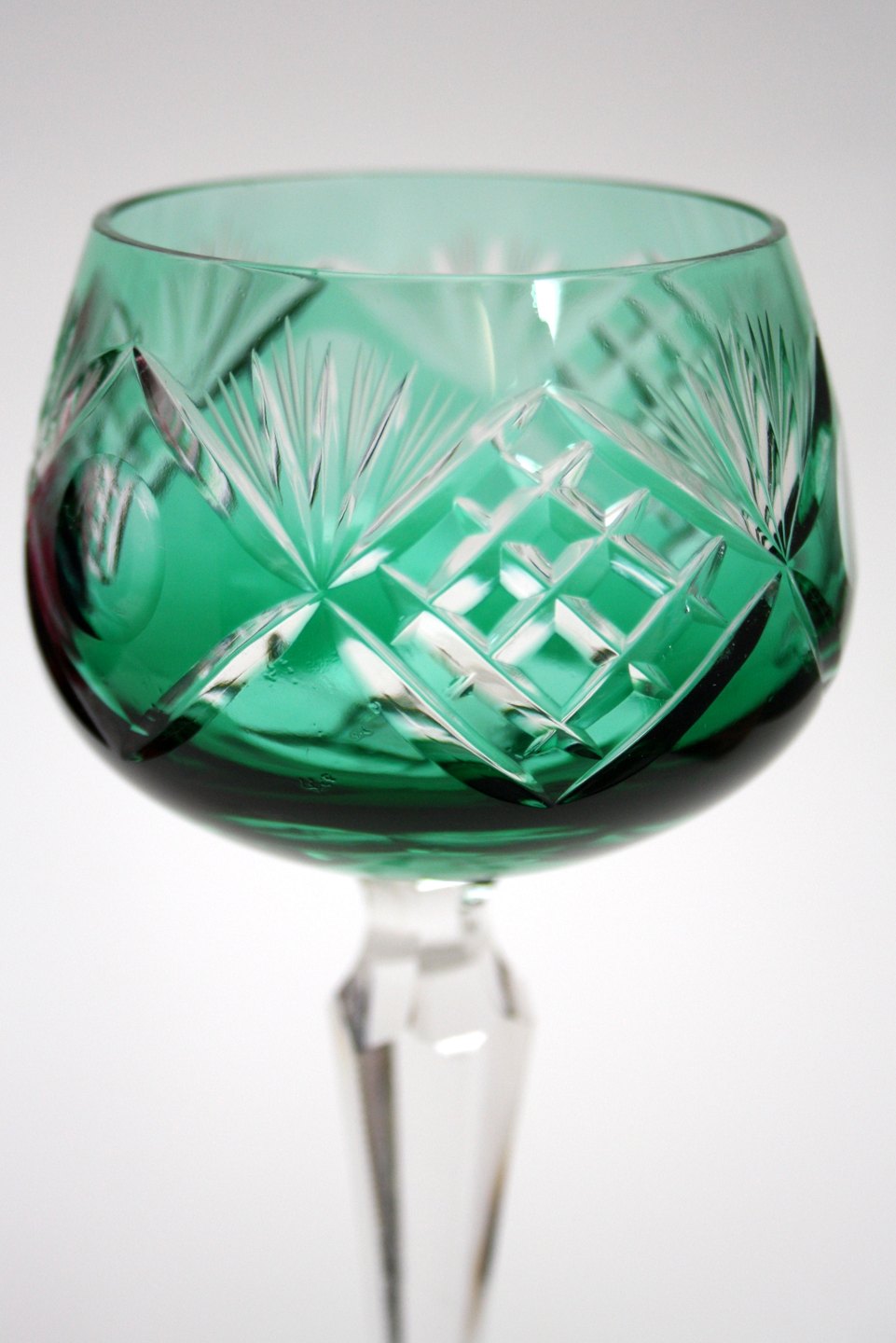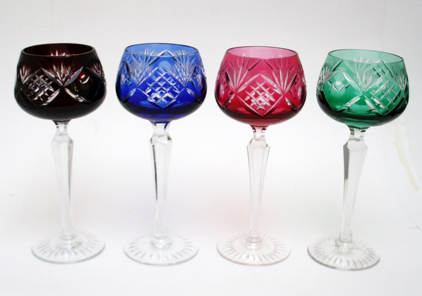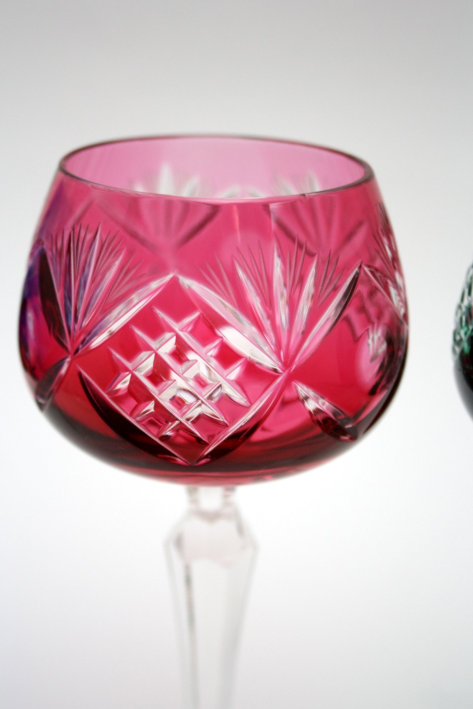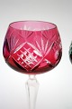 Bøhmisk krystal, Vinglas i farver. Slebet kumme og stilk. Højde 19,5 cm. Pris: SOLGT Grøn. Lager: solgt Aubergine. Lager: solgt Blå. Lager: solgt Rød. Lager: SOLGT C4