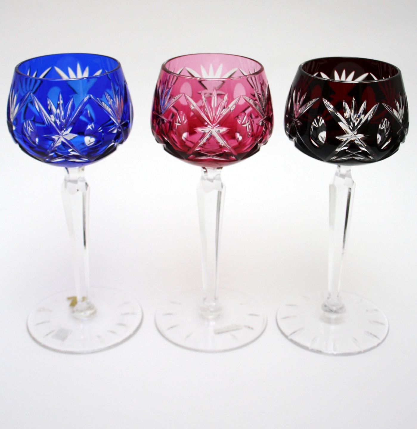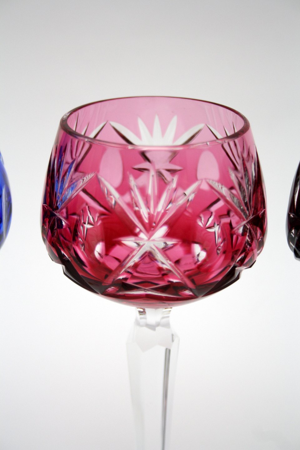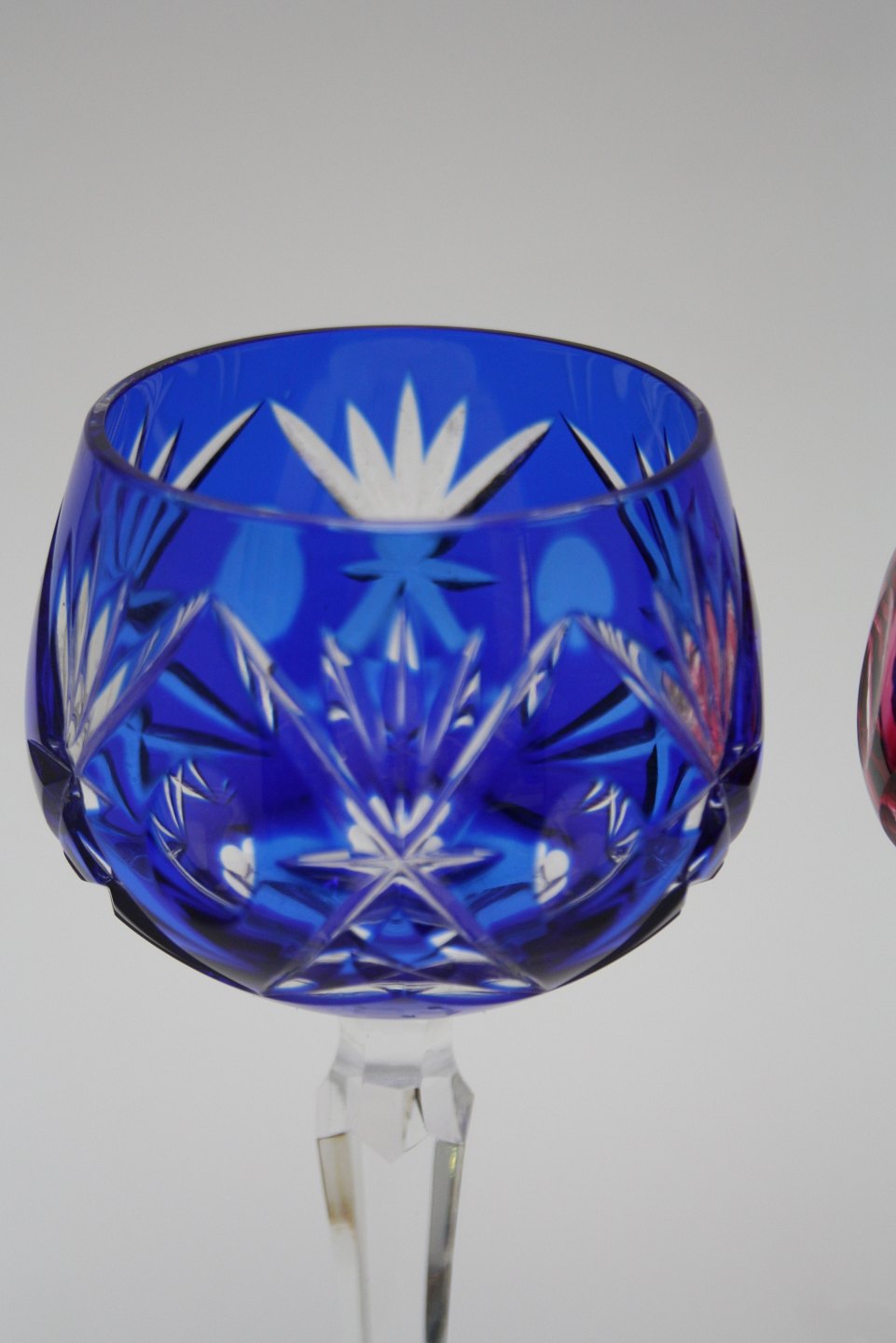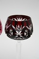 Bøhmisk krystal, Vinglas i farver. Slebet kumme og stilk. Højde 19 cm. Pris: 250 kr. stk. Aubergine. Lager: SOLGT Blå. Lager: SOLGT Rød. Lager: SOLGT D3