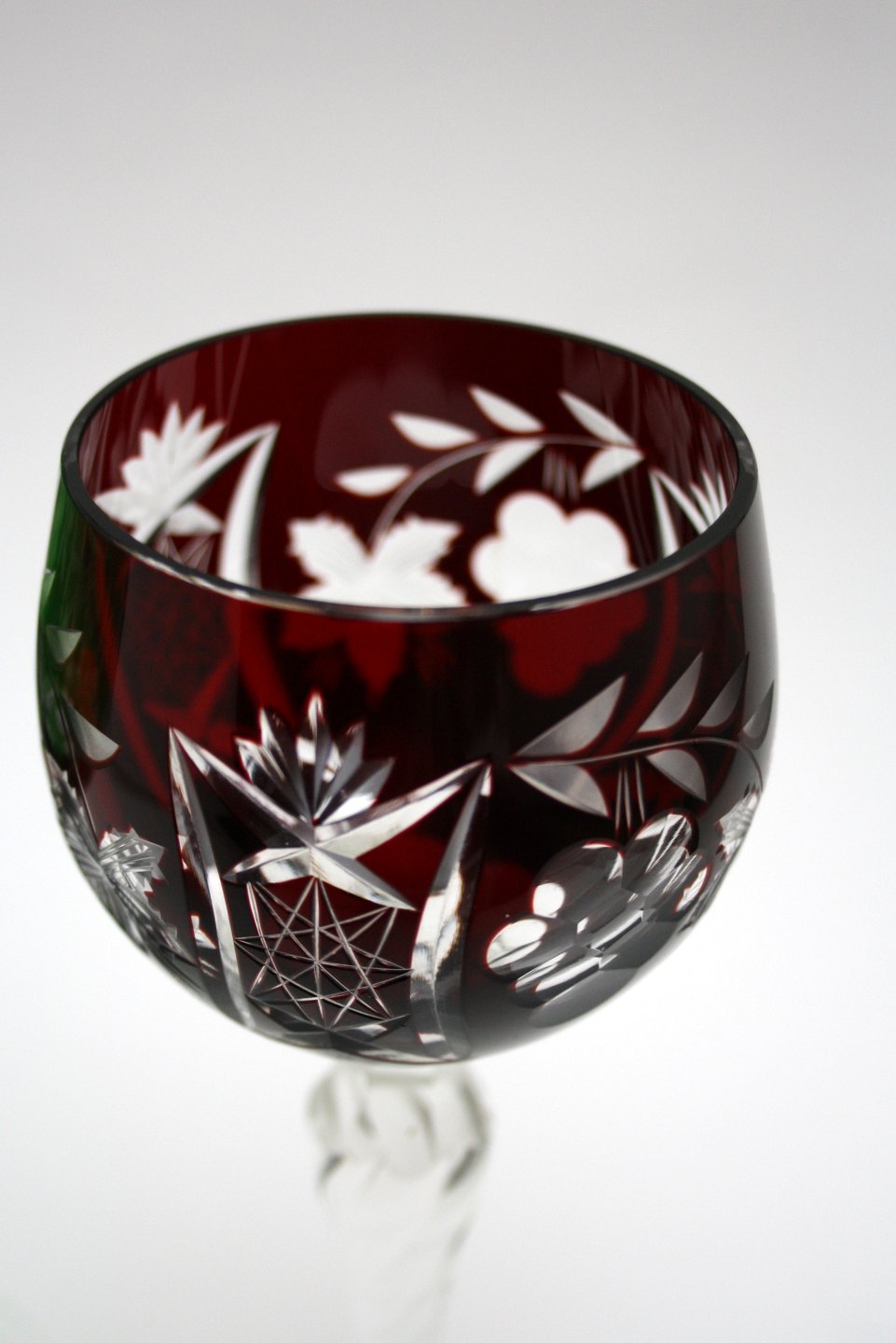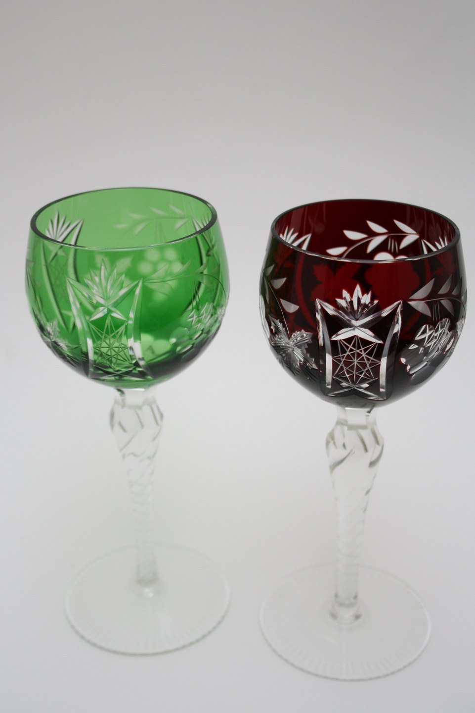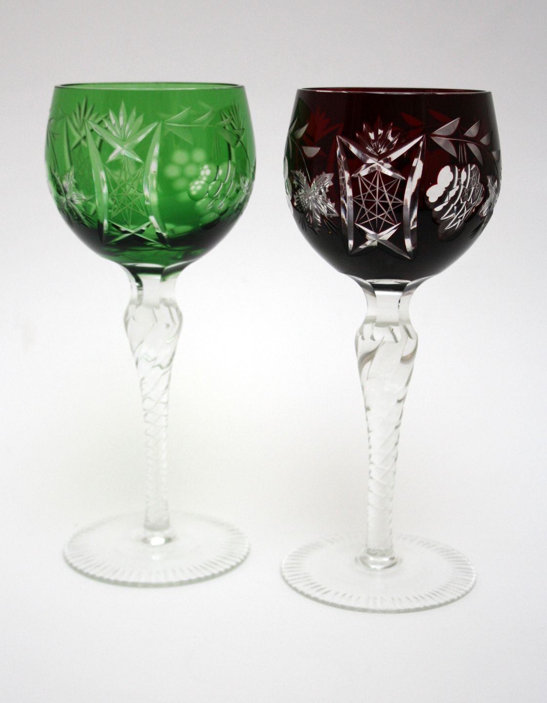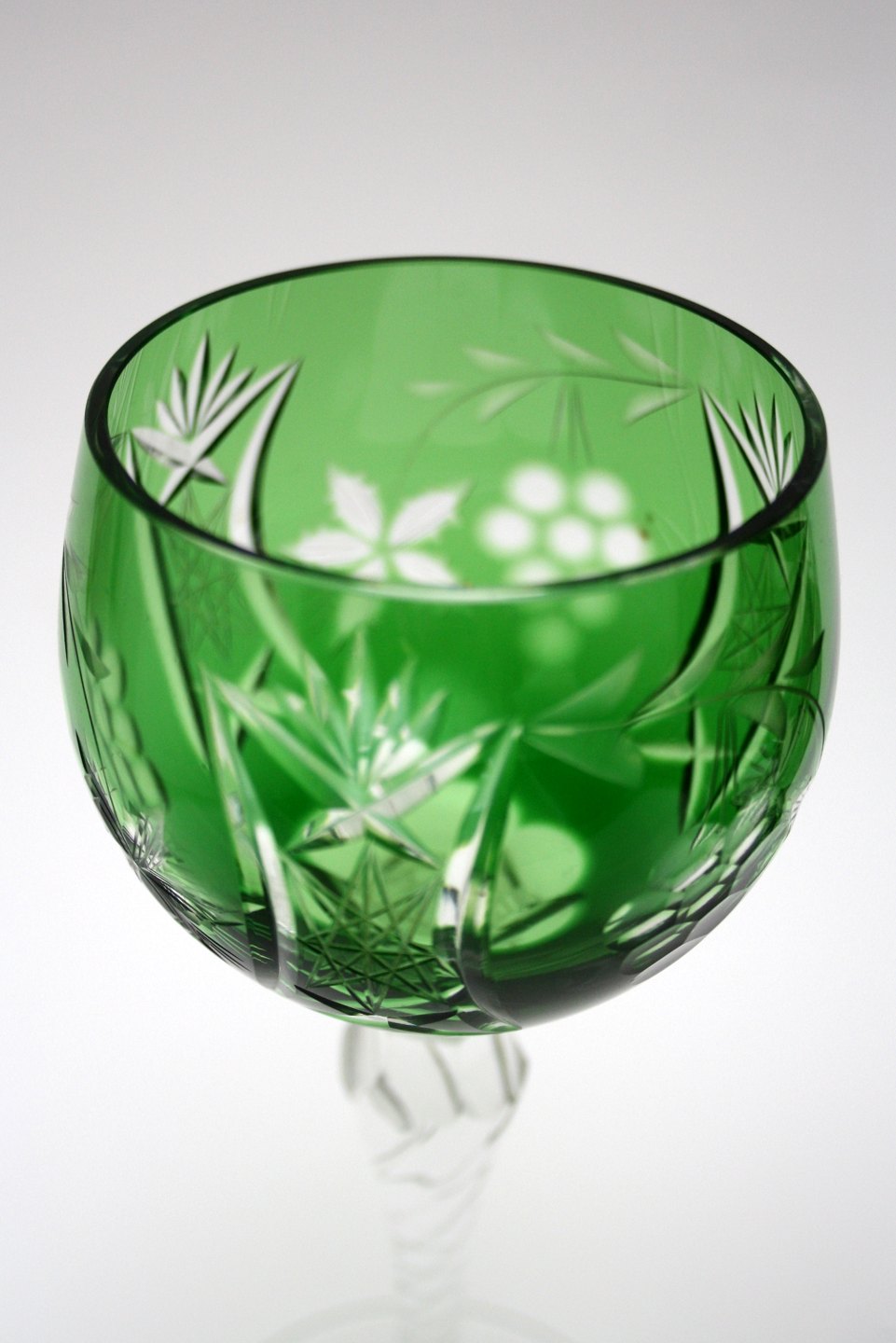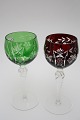 Bøhmisk krystal, Vinglas. Slebet kumme og snoet stilk. Højde 19,5 cm. Pris: SOLGT Grøn. Lager: SOLGT Dybrød. Lager: SOLGT Blå. Lager: SOLGT E2