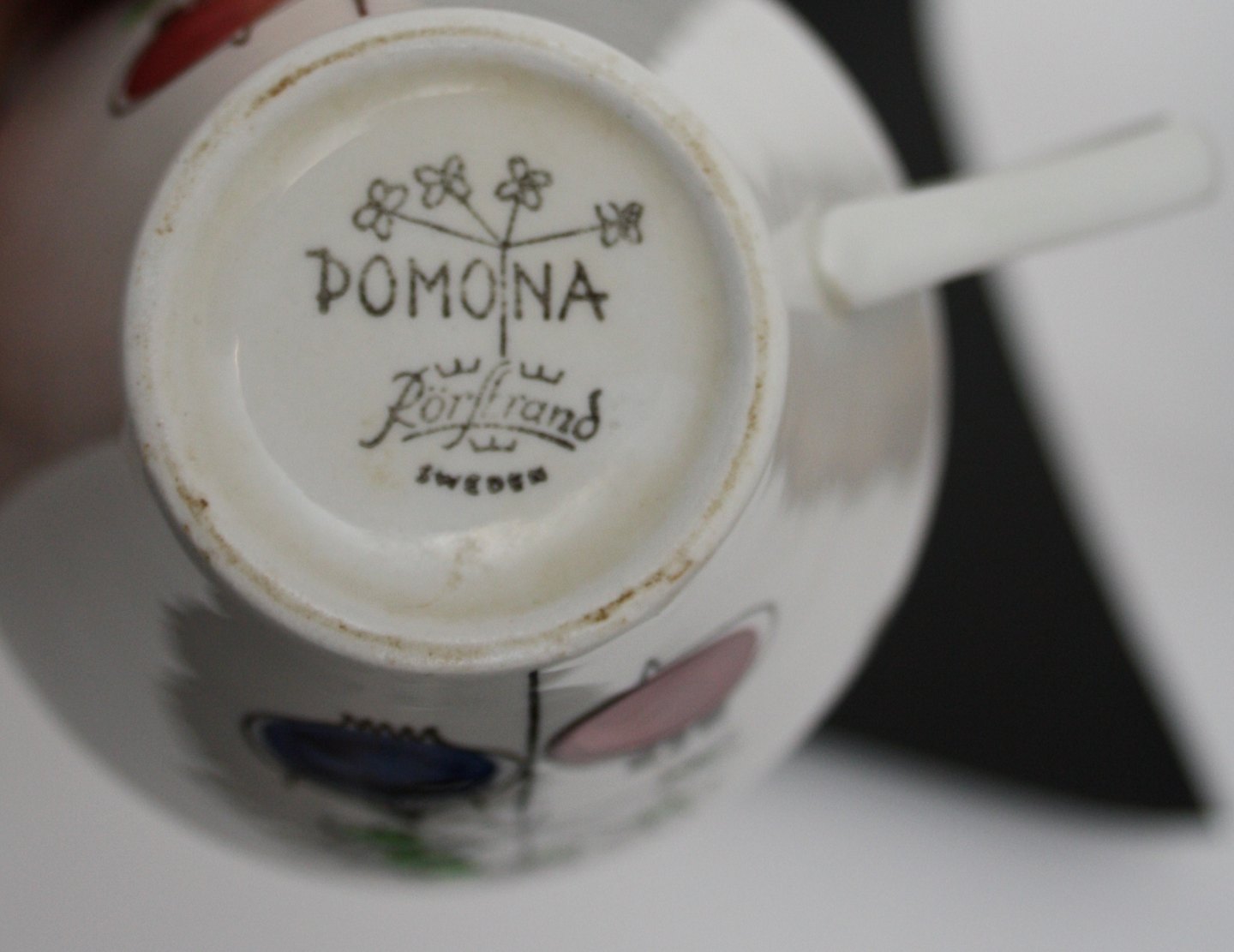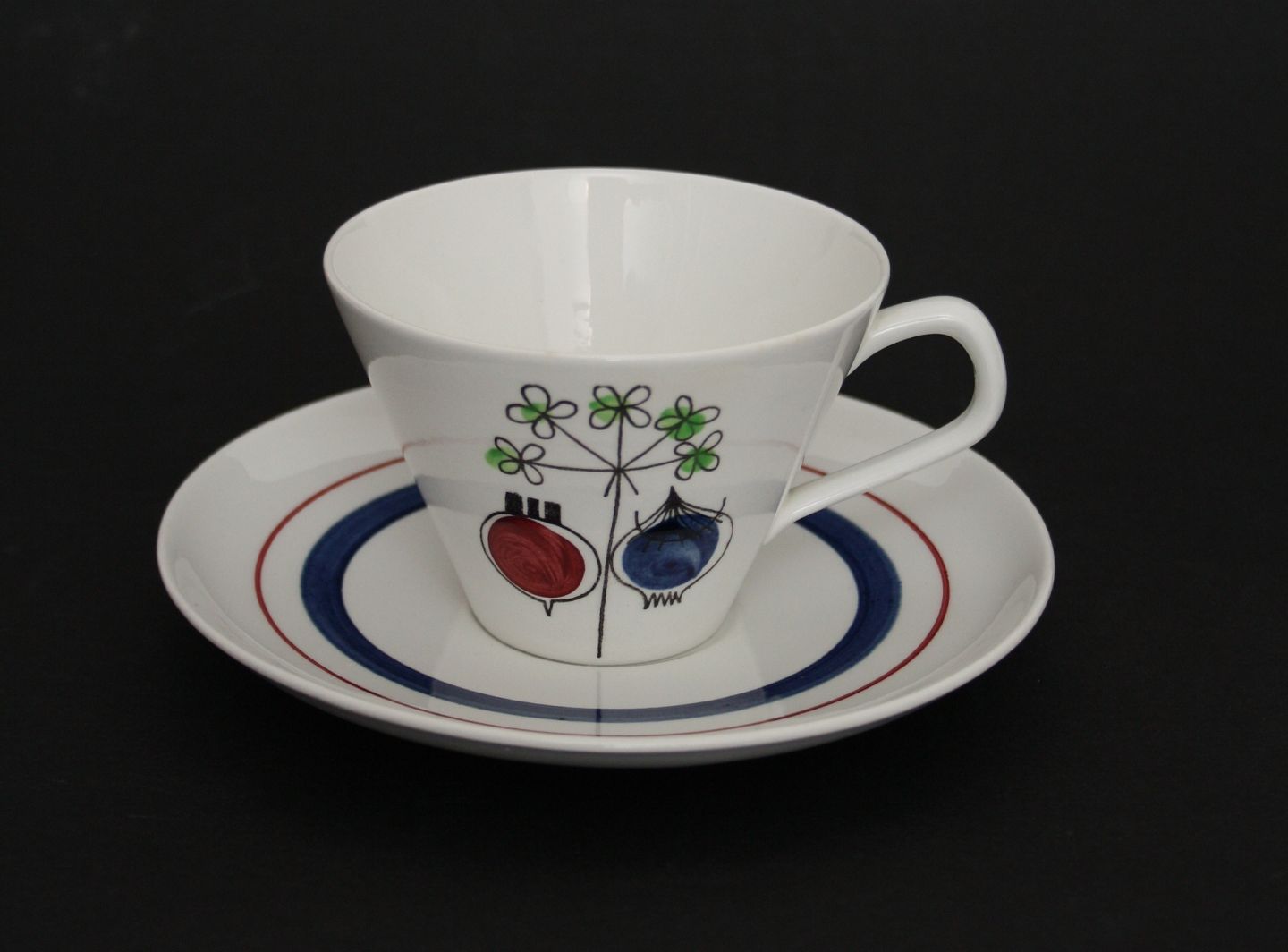 Rørstrand, Pomona, Stellet er designet af Marianne Westman og produceret samtidig med Picknick serien i perioden 1956-69. Kaffekop med underkop. Højde 6,5 cm. Øverste diameter 9,5 cm. Perfekt stand. Pris: solgt