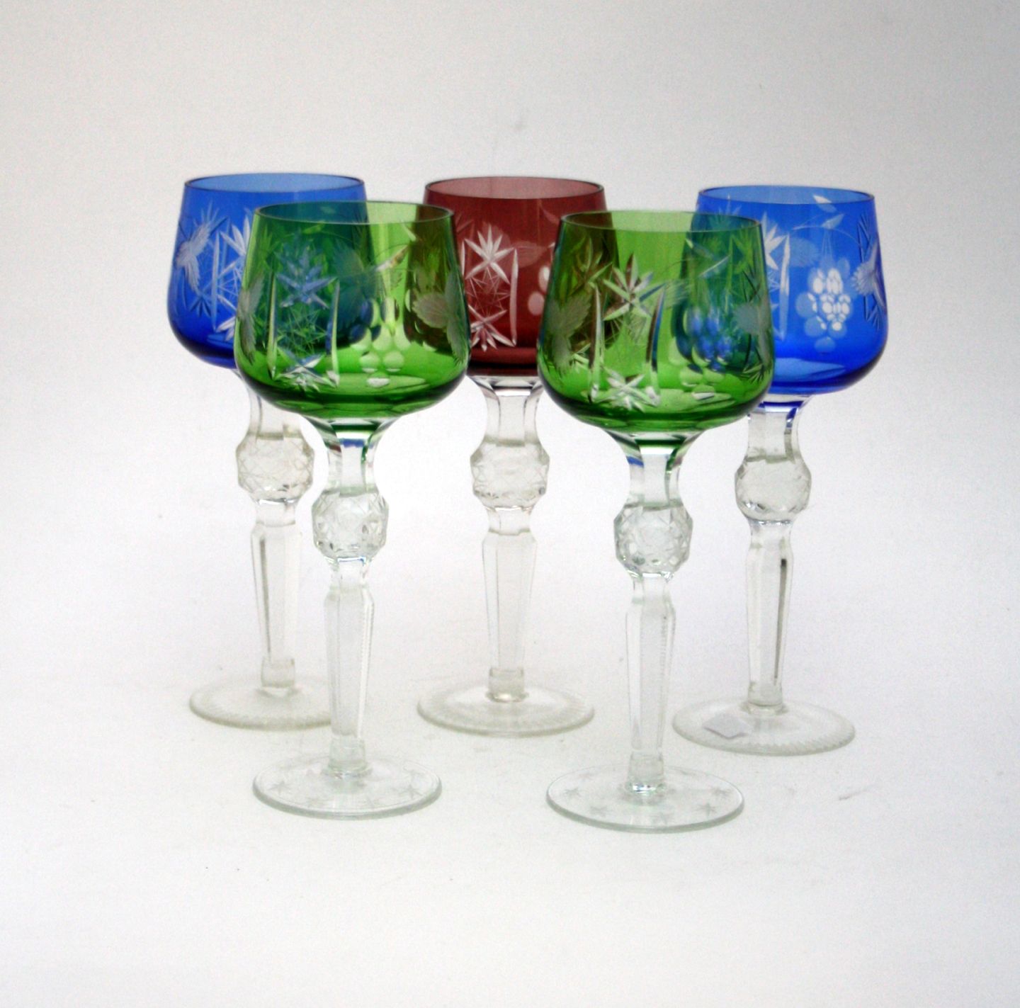 Bøhmisk krystal, Vinglas i flere farver. Kumme med druer, blade og stjerner. Slebet stilk. Højde 21,5 cm. Pris: 250 kr. stk.