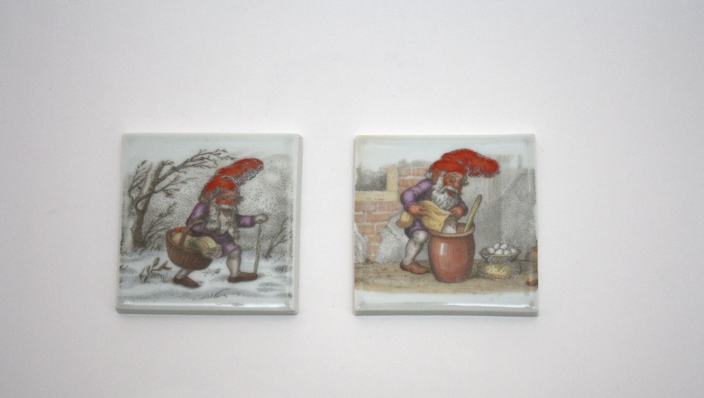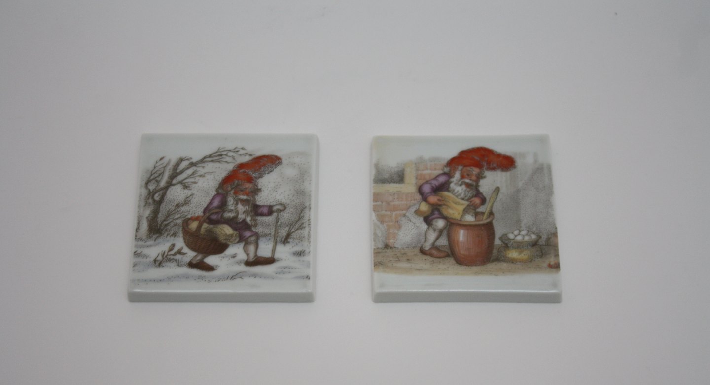 Bing & Grøndahl, Harald Wiberg kakler med gamle nisser. Mål 7,5 x 7,5 cm. I. sortering. Pris: SOLGT