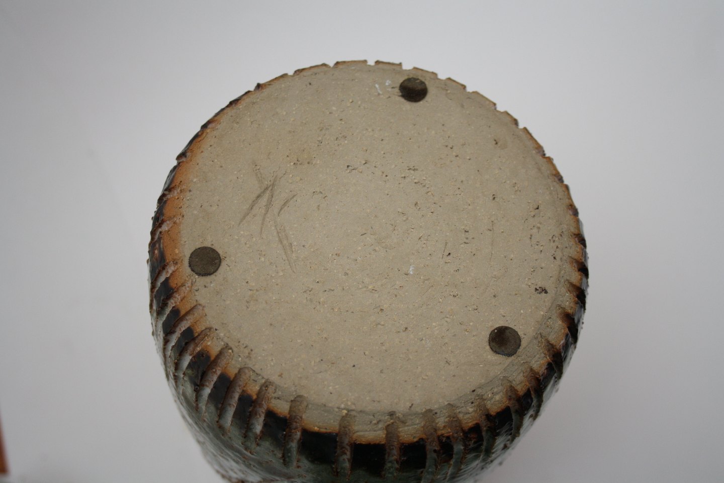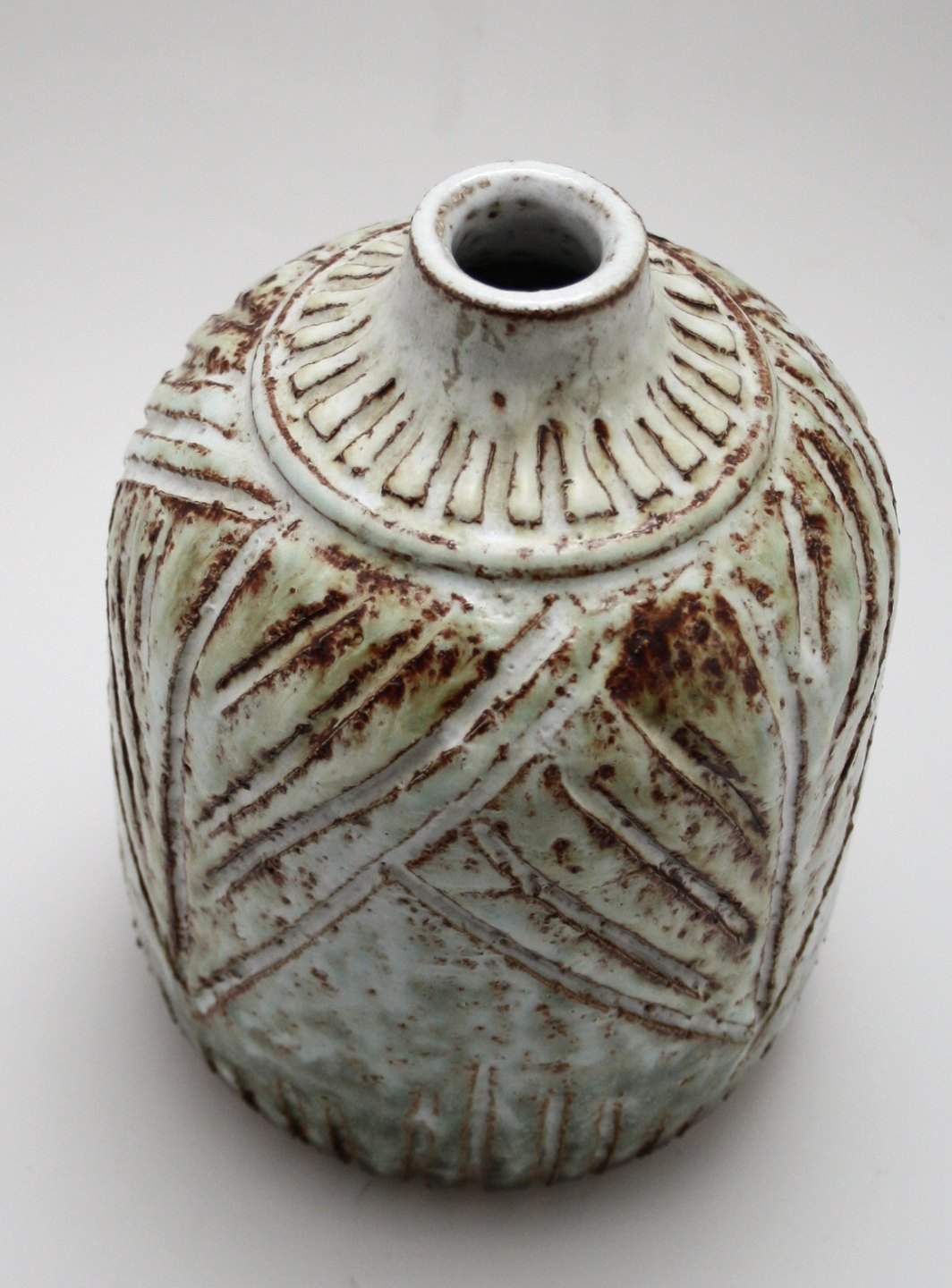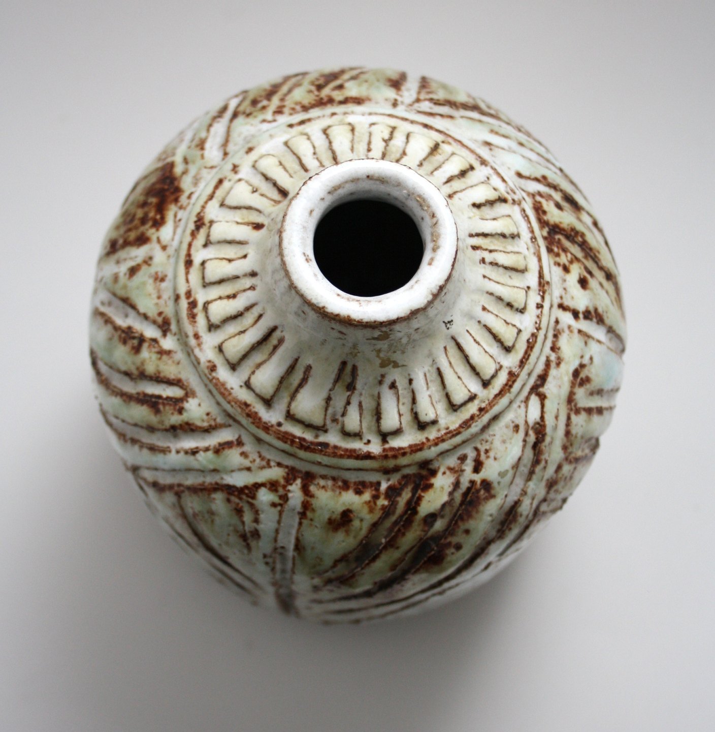 Kingo Keramik, Fyn, Vase i chamotte ler med hvid/brun glasur. Signeret KK. Højde 22 cm. Diameter 14,5 cm. Flot stand. Pris: SOLGT