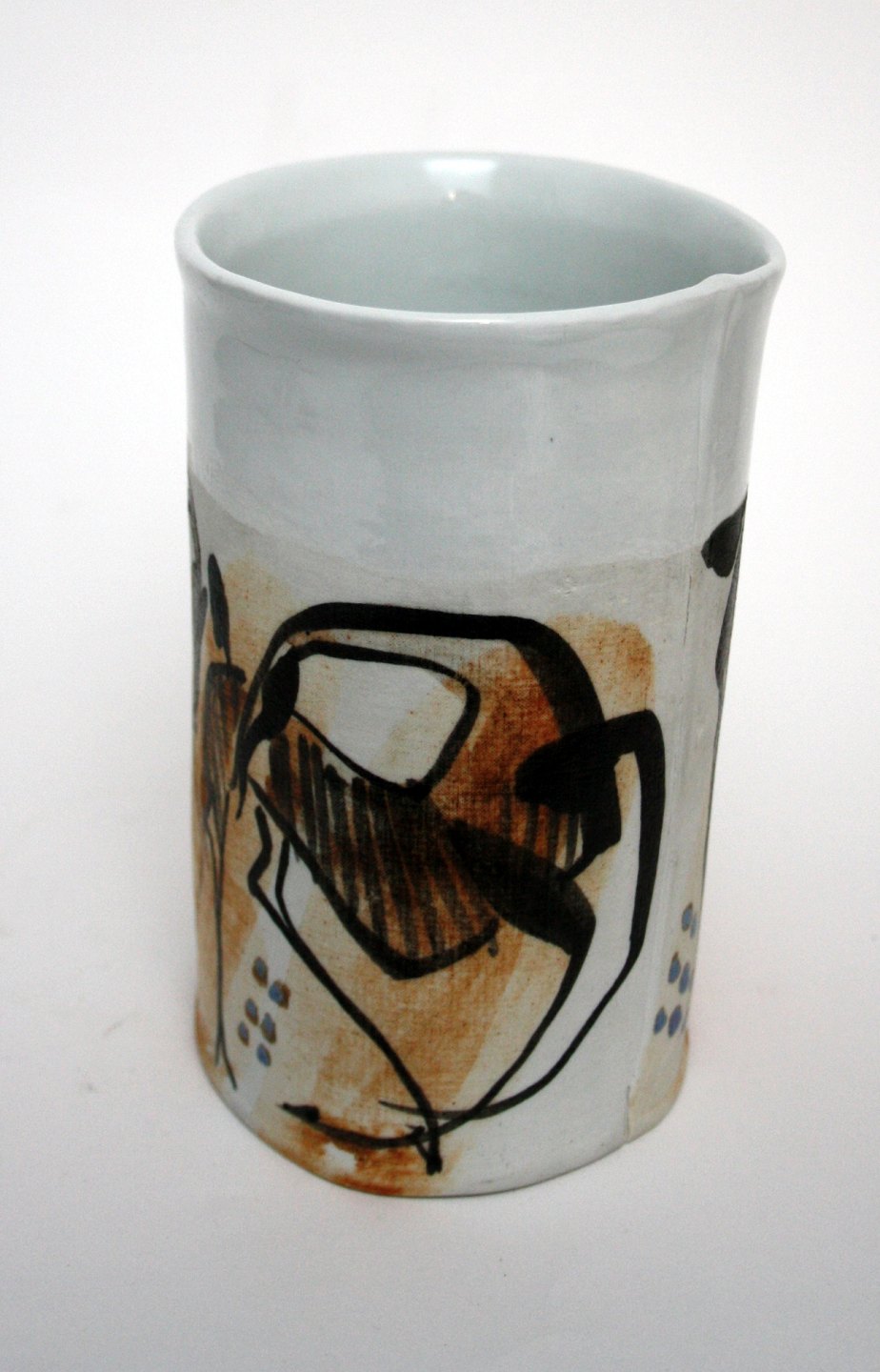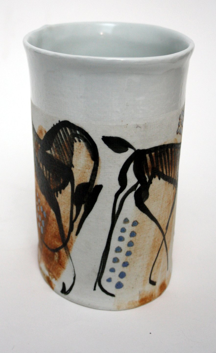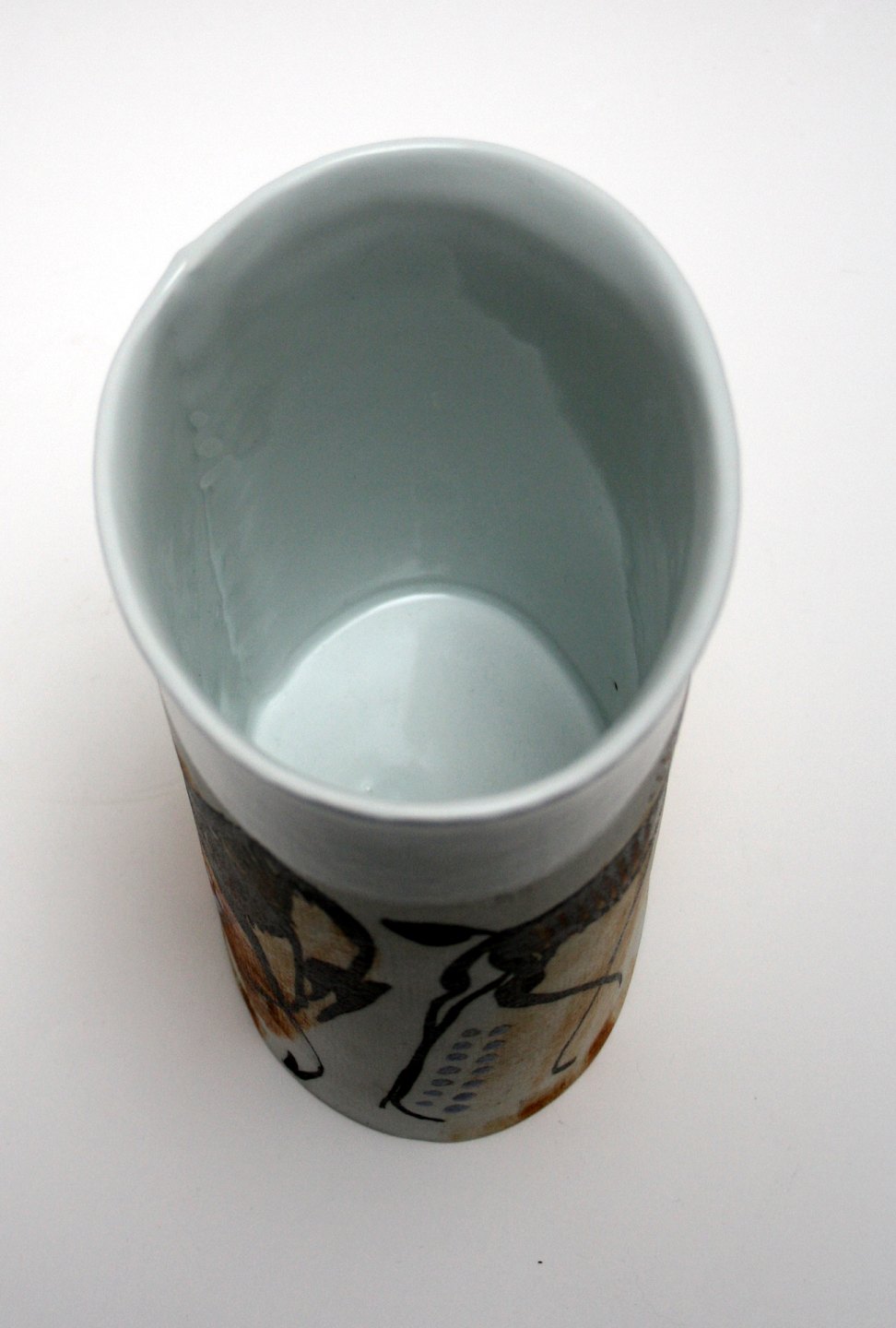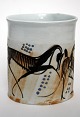 Oval keramikvase med hestemotiver. Designet af Birgit Krogh, Nykøbing Sjælland, Odsherred. Højde 16,5 cm. Længde 14 cm. Bredde 11 cm. Flot stand. Signeret Birgit Krogh. Pris: SOLGT