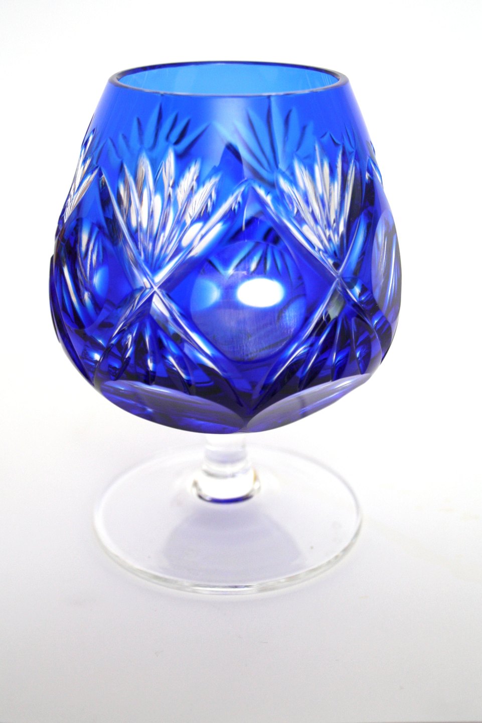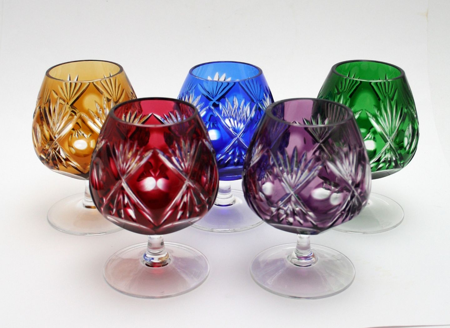 Bøhmiske cognac glas, højde 12 cm. øverste diameter 6 cm. i farverne rød blå grøn lilla gylden. Pris: SOLGT