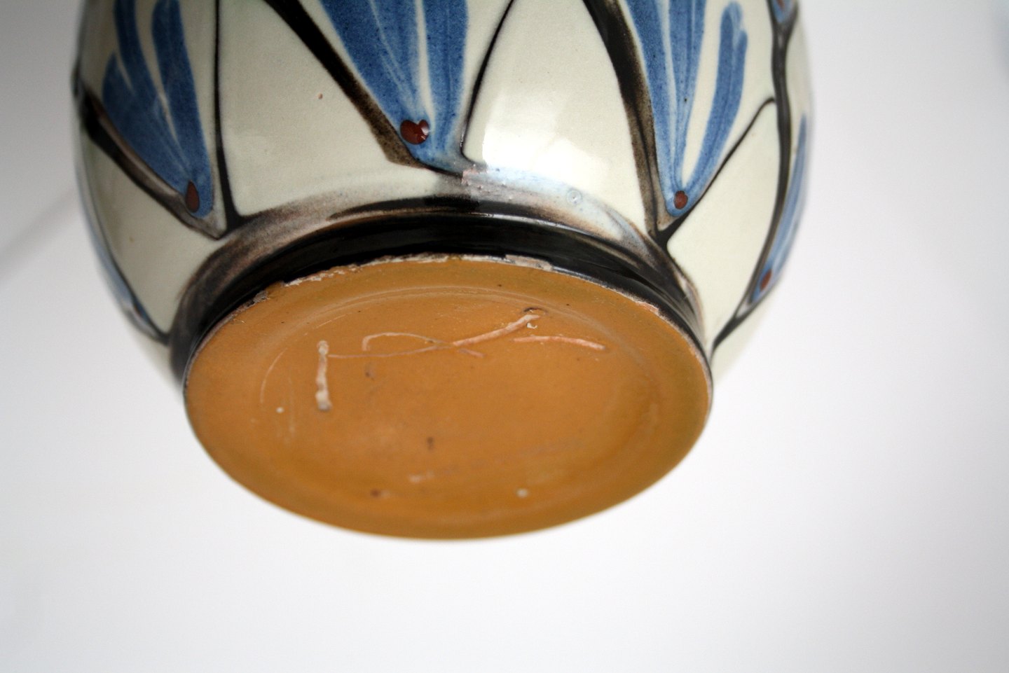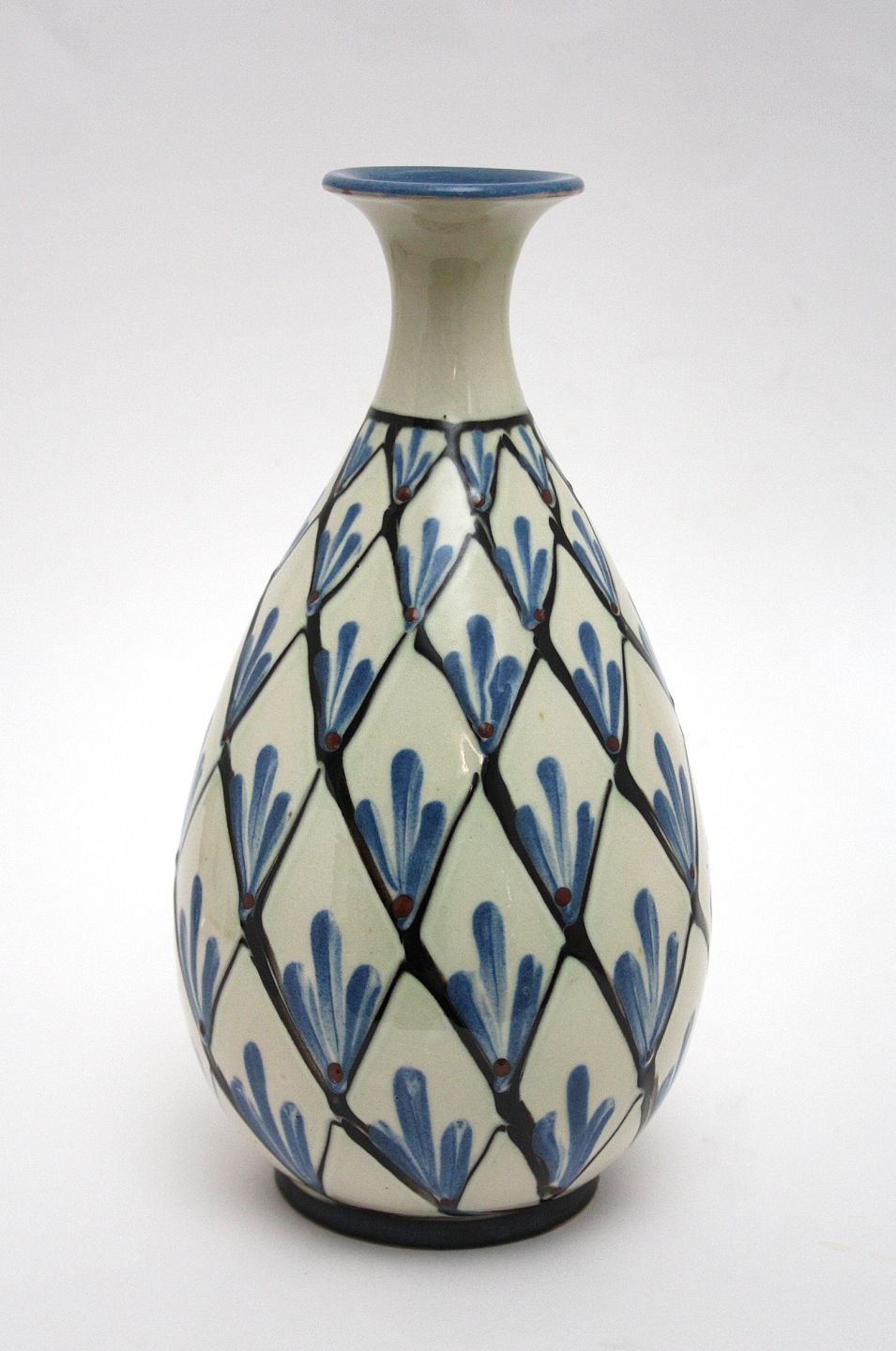 Kähler, smuk vase i cremet og lyseblå glasur. Signeret HAK made in Denmark. Højde 23,5 cm. Flot stand. De 2 mindre glasurafslag i bunden er formentlig fra fremstillingen. Pris: solgt