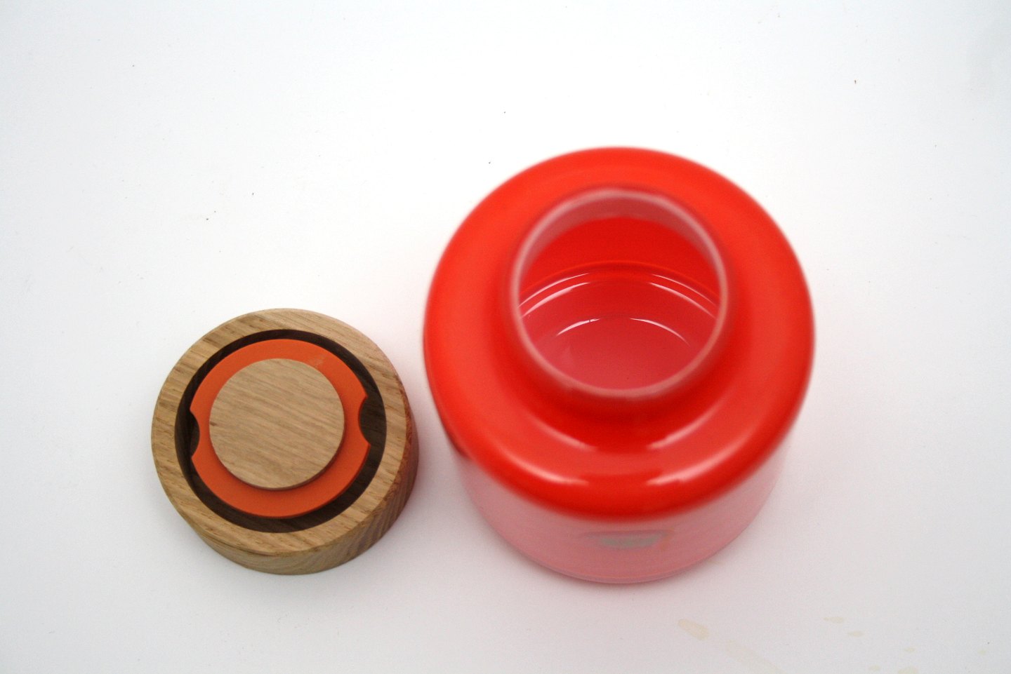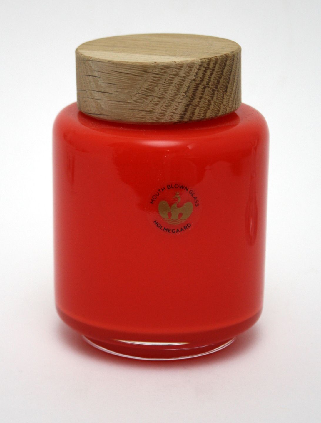 Holmegaard, Palet, Orange opbevaringskrukke med massivt egetrælåg. Designet af Michael Bang. Holmegaard kollektion 2016/2017. Højde 11,5 cm. Diameter 8 cm. Flot stand. Pris: SOLGT