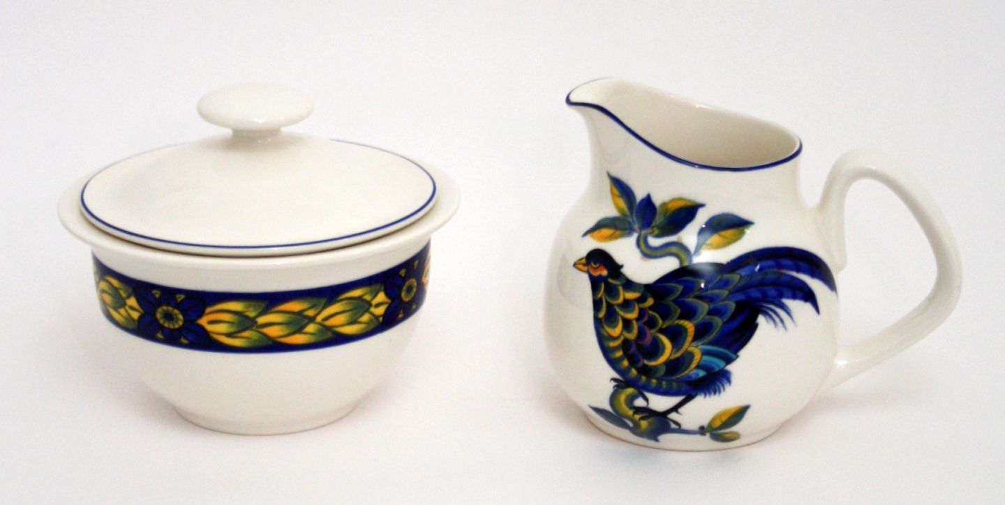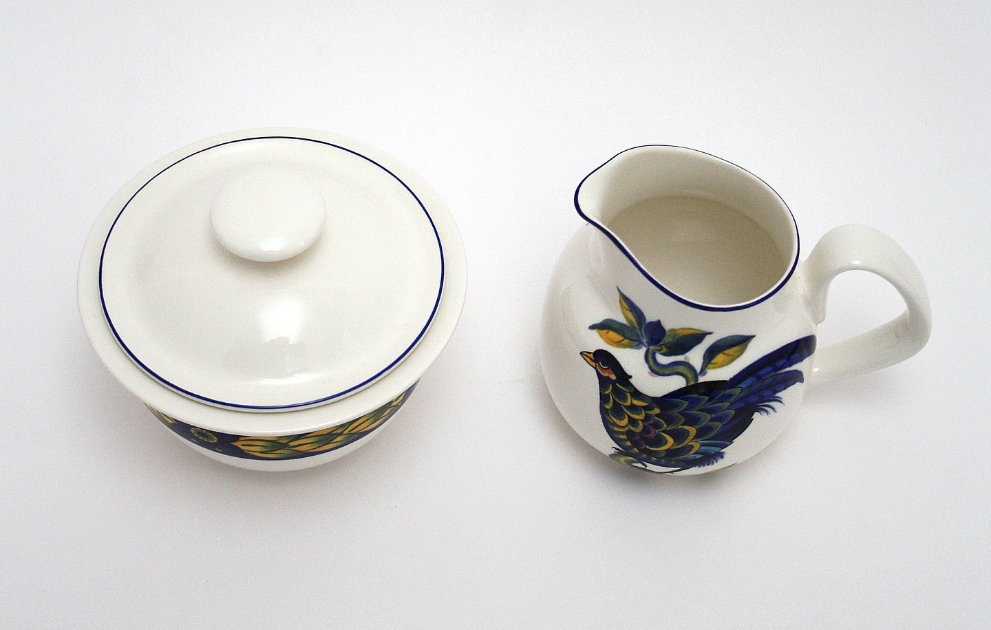 Royal Copenhagen, Blå Fasan (Blue Pheasant) designet af Chr. Joachim. Sukkerskål. Diameter 12 cm. Højde 11 cm. I. sortering. Dek. nr. 1737 161. Pris: SOLGT Flødekande. Højde 9,5 cm. I. sortering. Dek. nr. 1737 394. Pris: SOLGT