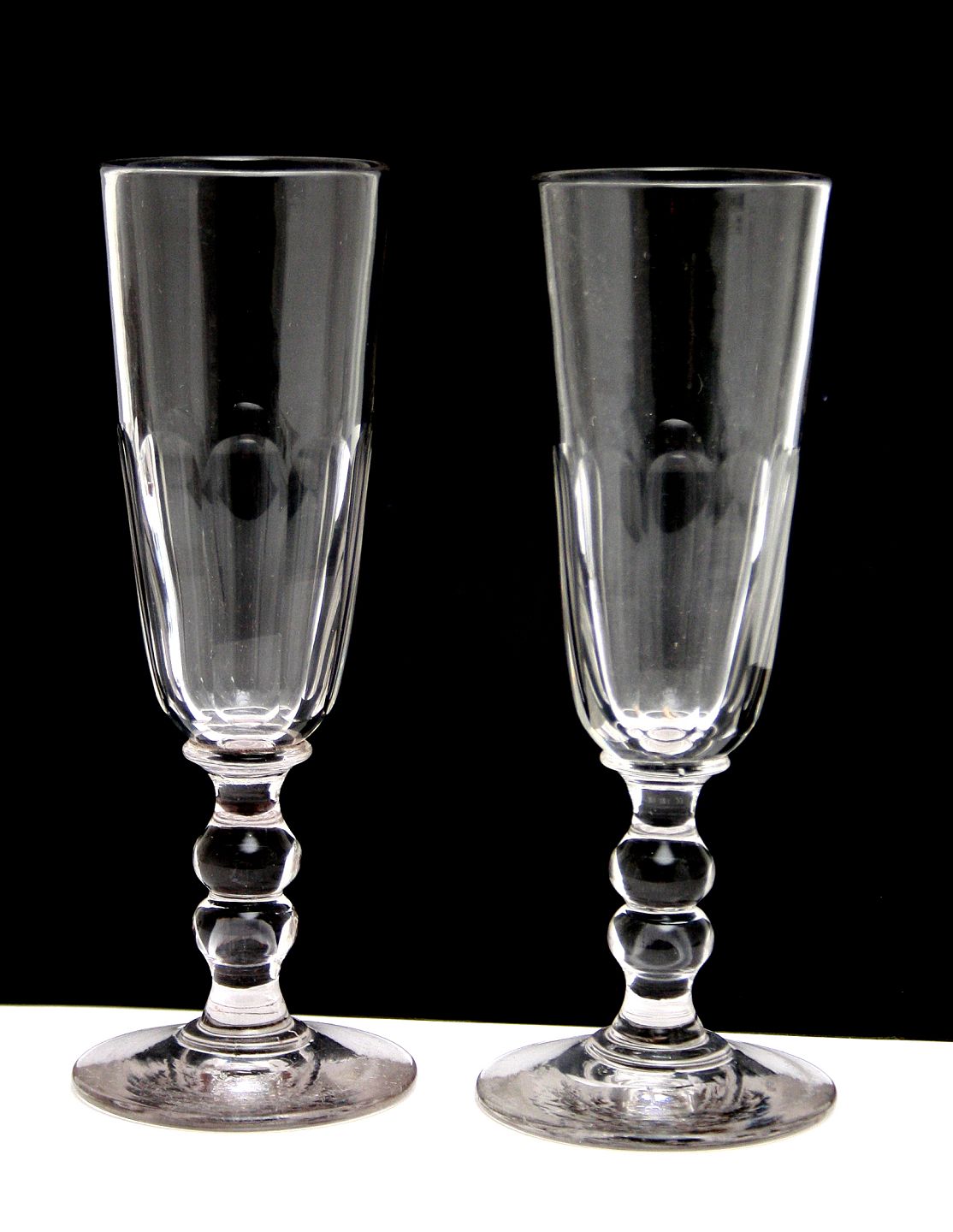 Holmegaard, Toupie champagnefløjter fra 1900. Facetslebet kumme og dobbelt kugle på stilk, rundslebet bund. Højde 17,3-17,5 cm. Sælges samlet SOLGT