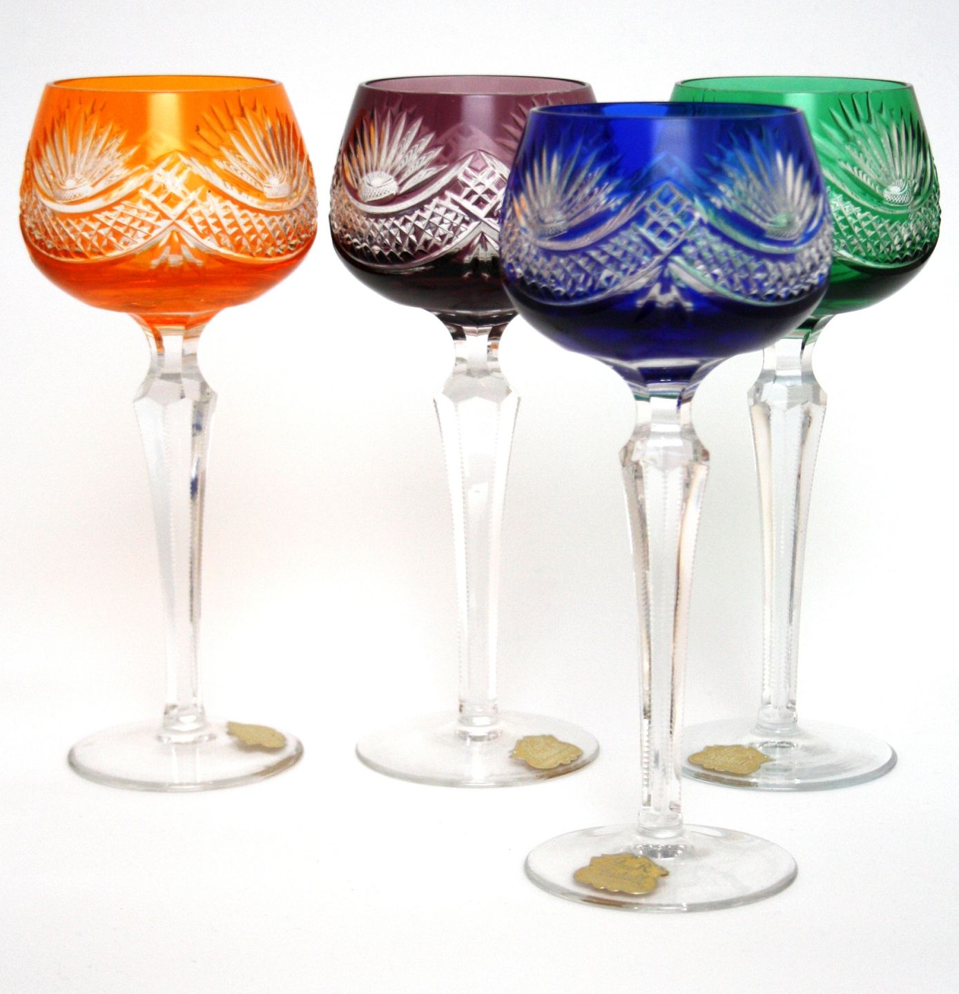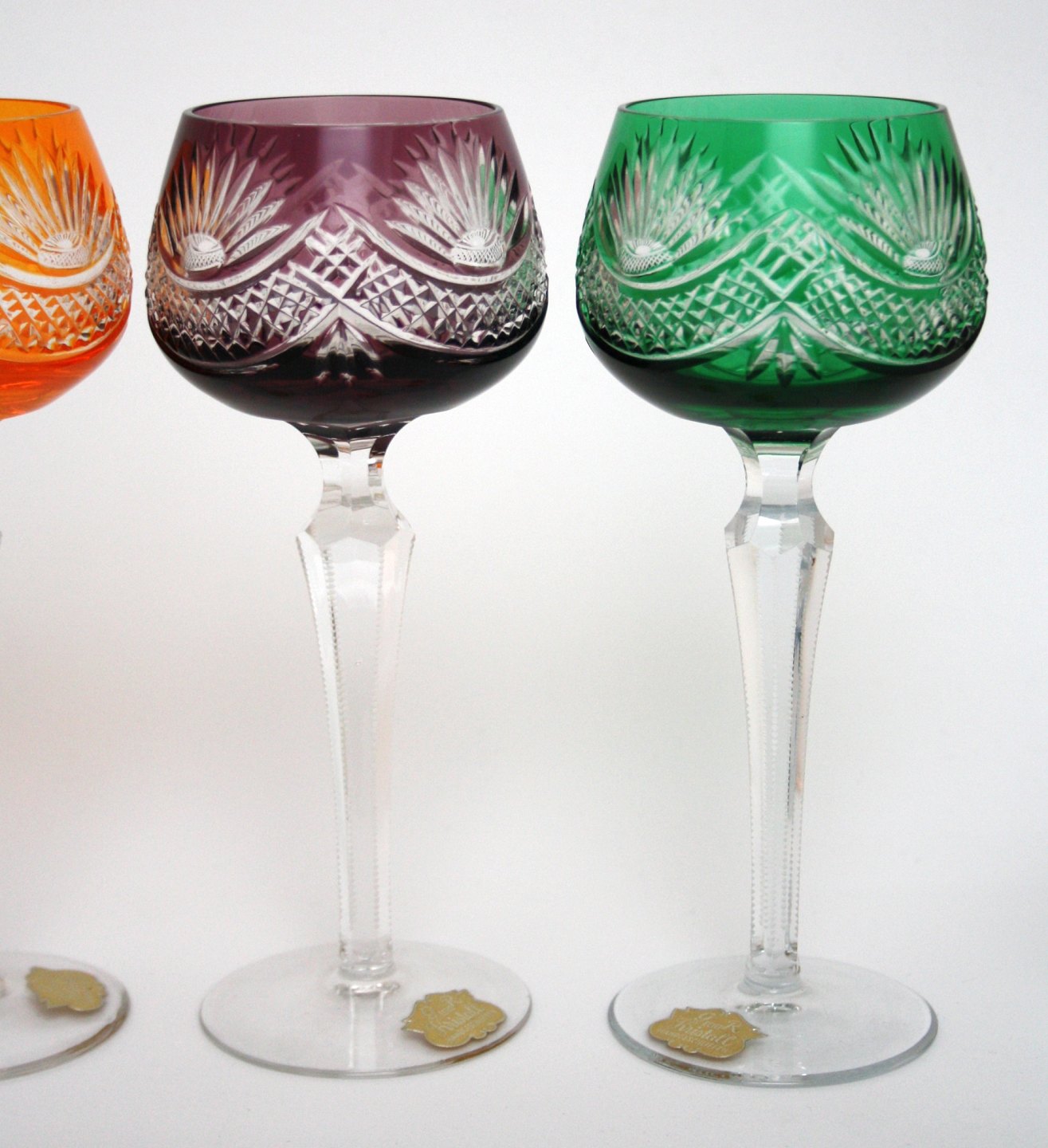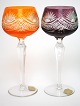 Bøhmisk krystal, Vinglas med håndslebet stilk og kumme. Højde 19,5 cm. Øverste diameter 6,5 cm. Pris: 225 kr. stk. Grøn. Lager: SOLGT Blå. Lager: SOLGT Orange. Lager: SOLGT Lilla. Lager: SOLGT