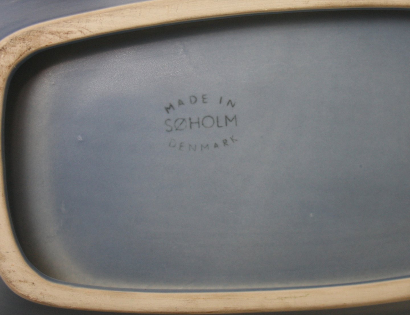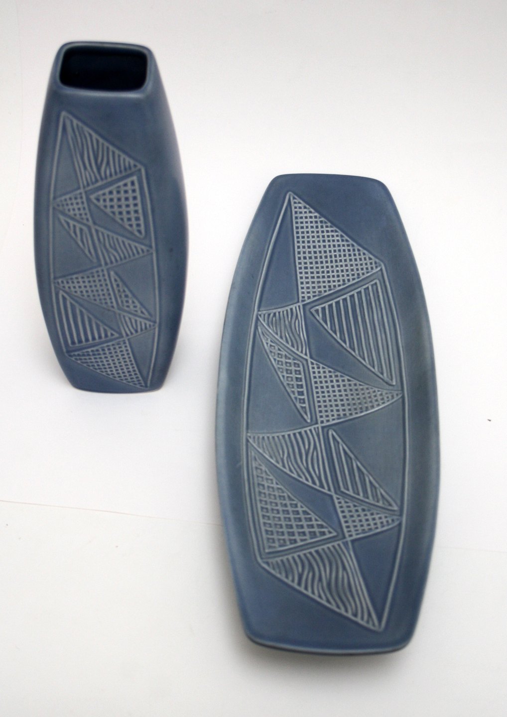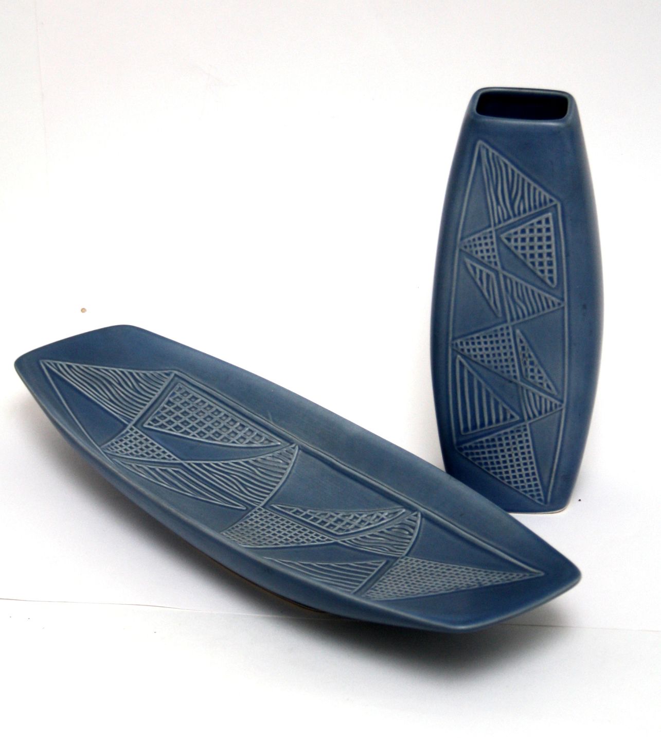 Søholm, støvblå serie fra starten af 1960'erne. Perfekt stand. Vase. Formnr. 2058. Højde 24 cm. Pris: SOLGT Fad. Længde 42 cm. Bredde 14,5 cm. Højde 5 cm. Pris: SOLGT
