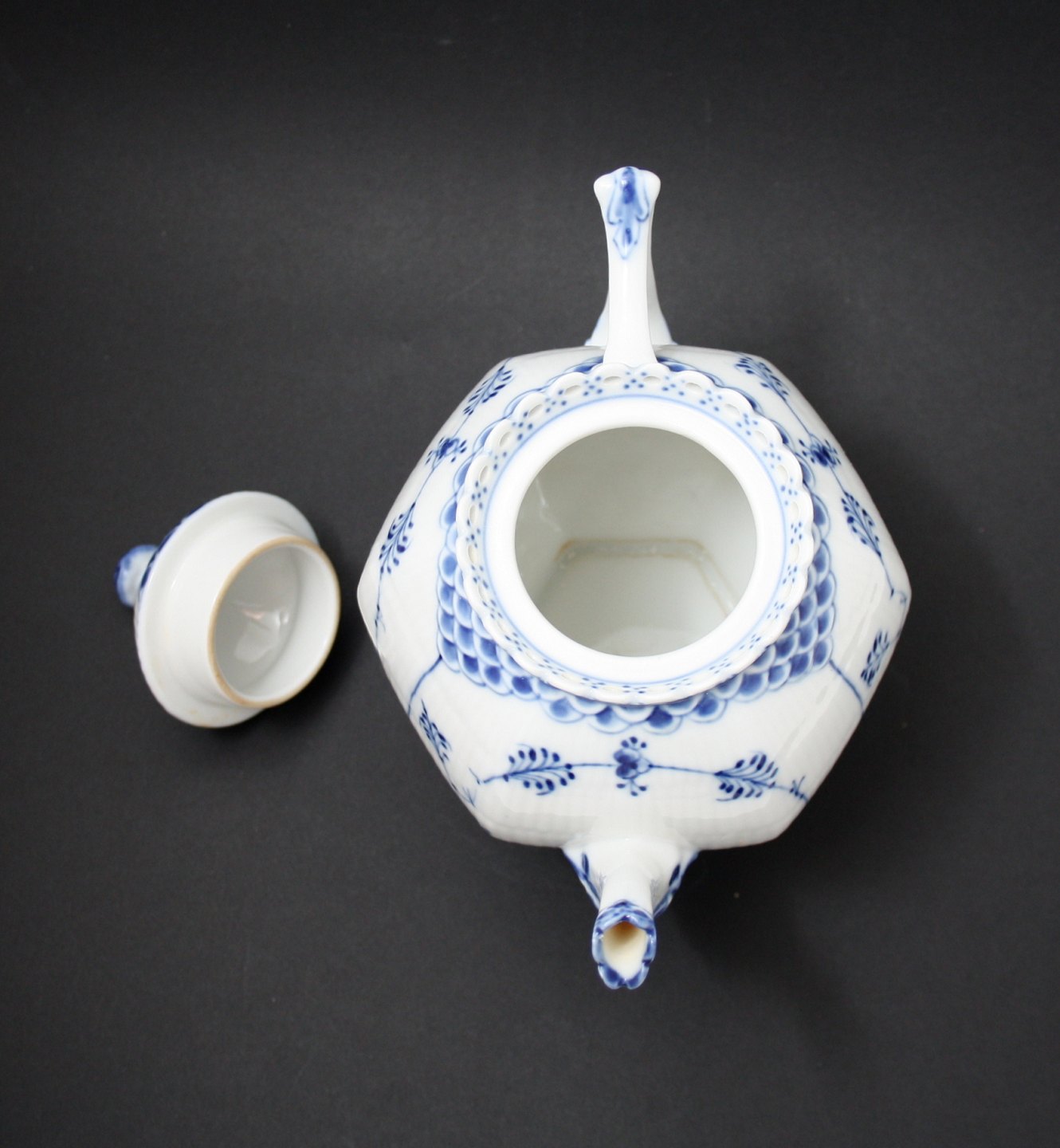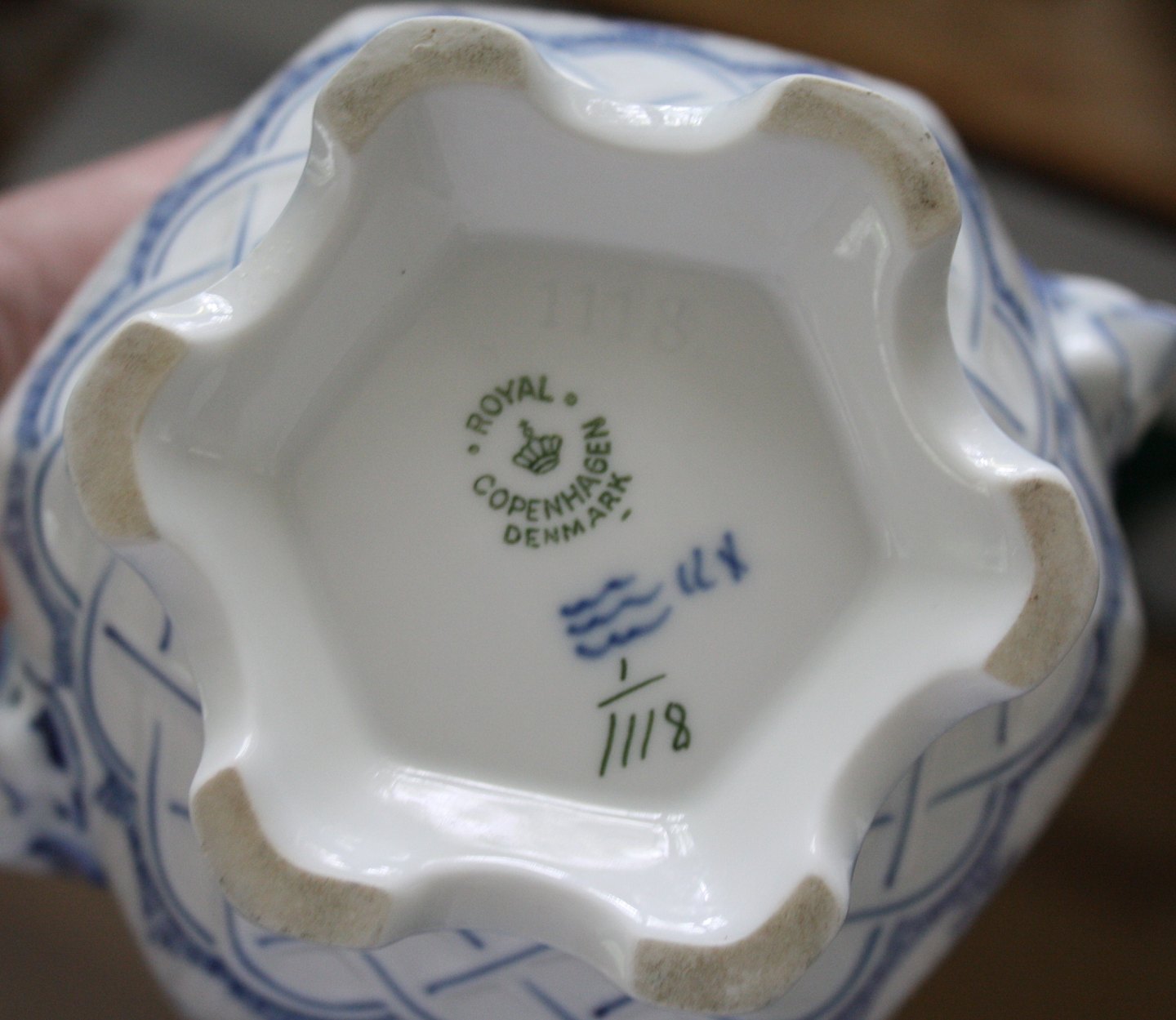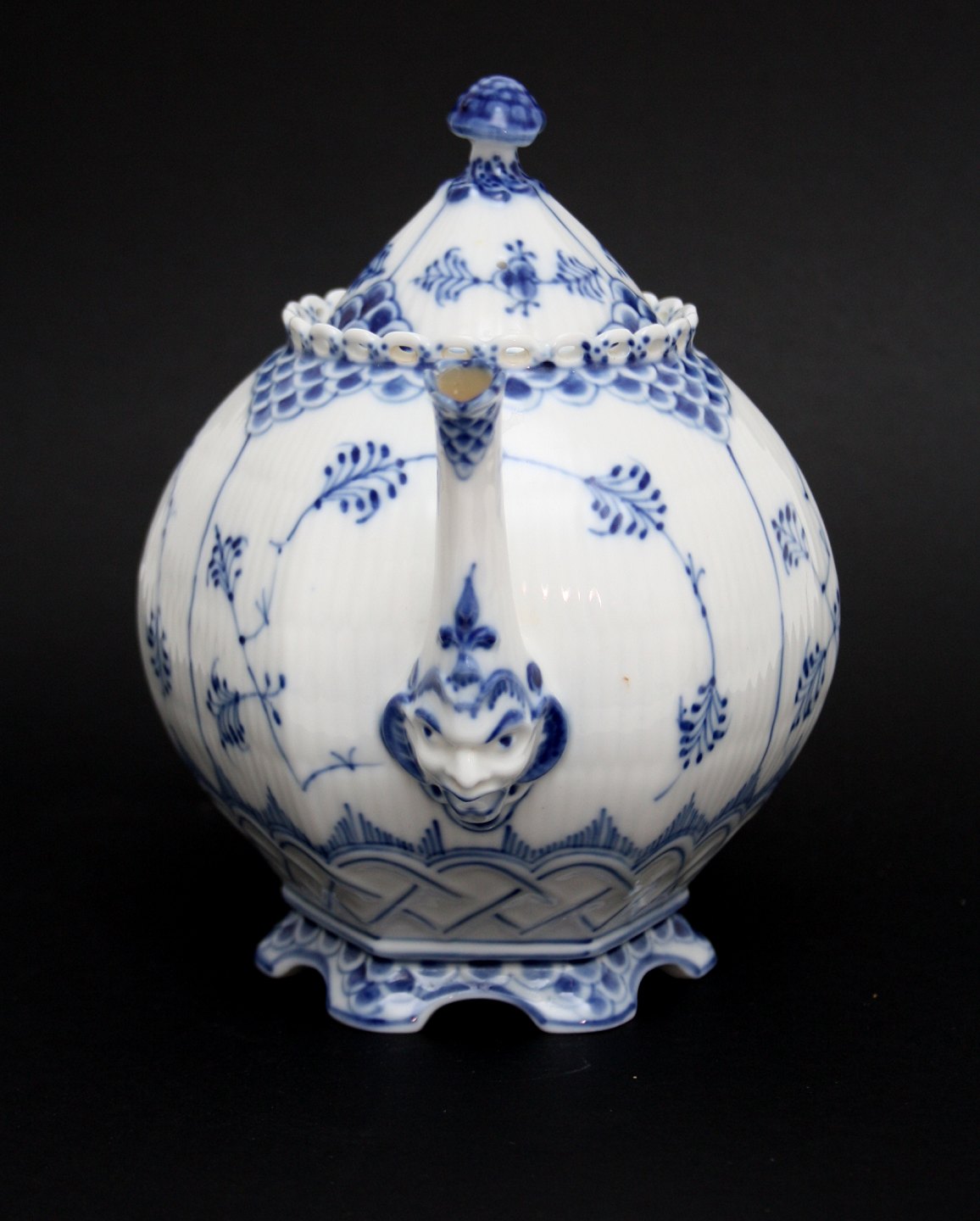 Royal Copenhagen, Musselmalet helblonde, Tekande med låg. Formnr. 1-1118. Dateret 1950. Højde 17,5 cm. Længde 18 cm. I. sortering. Perfekt stand. Pris: SOLGT