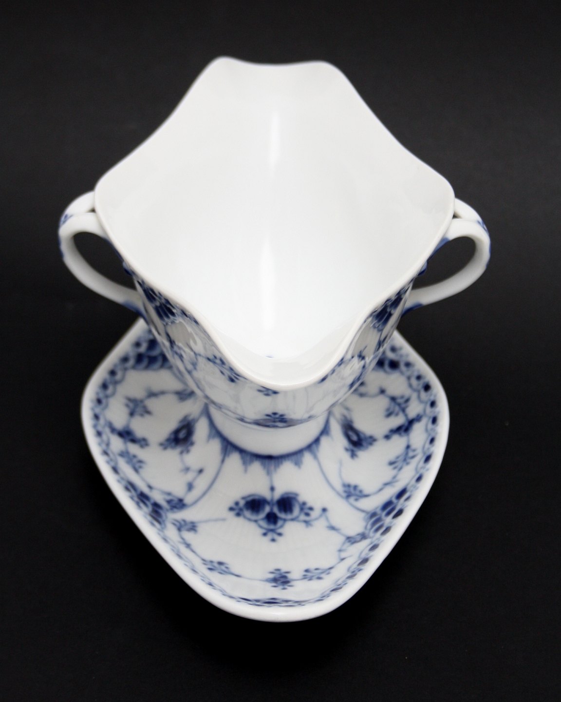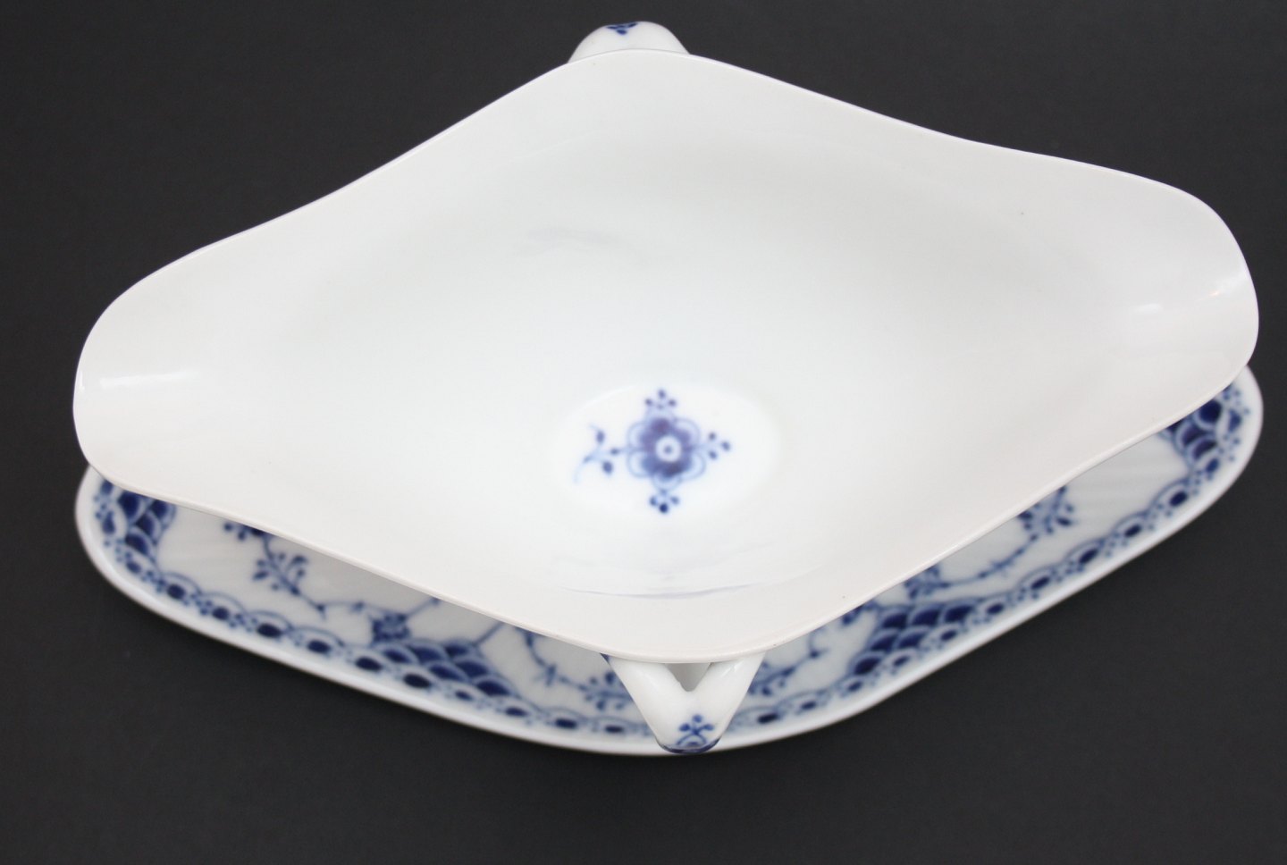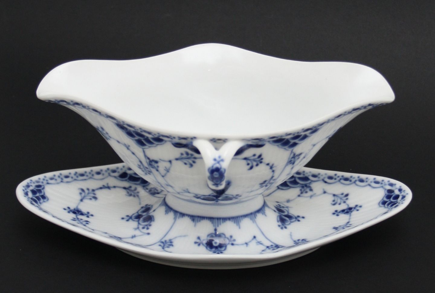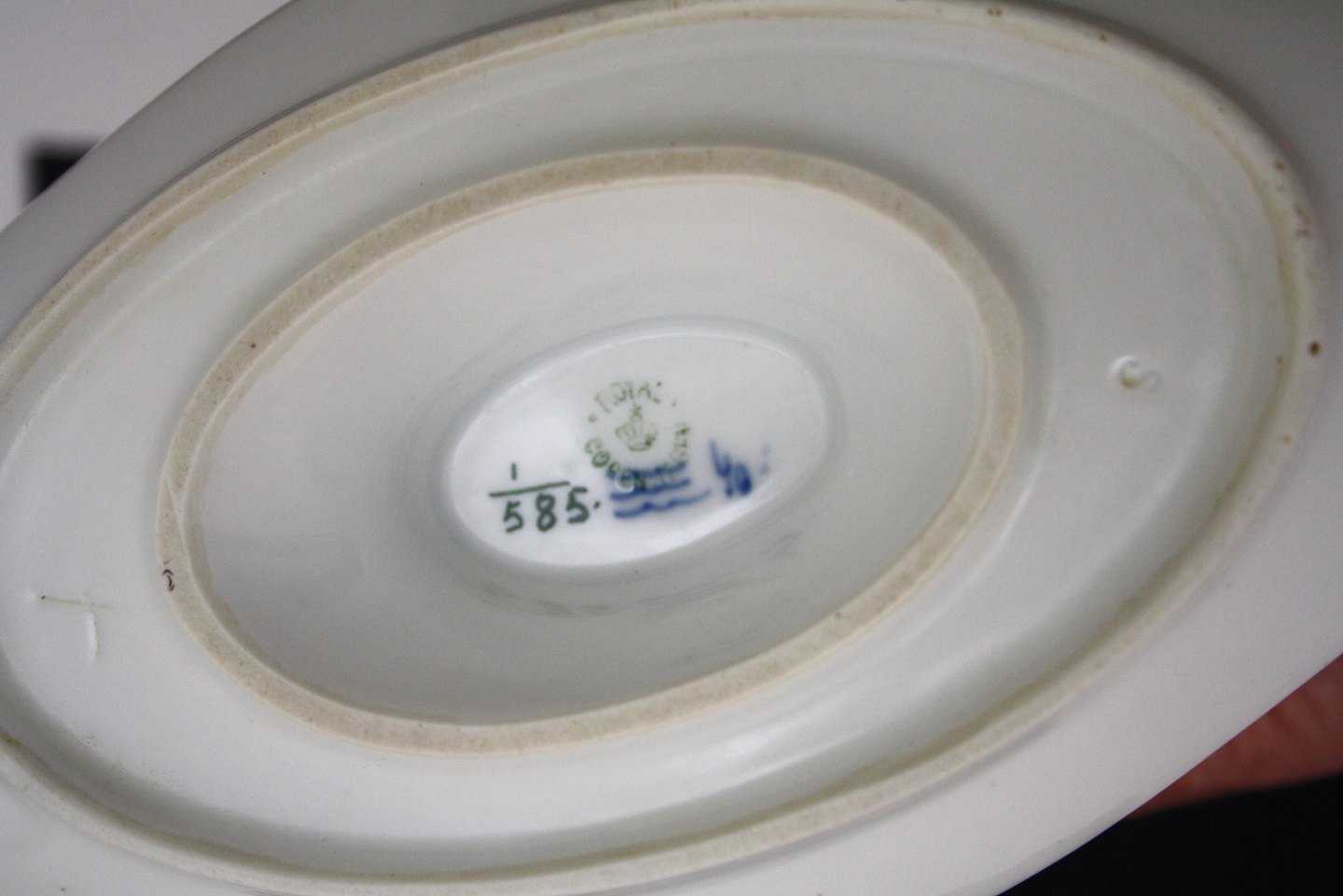 Royal Copenhagen, Musselmalet halvblonde, Sovsekande. Formnr. 1-585. Stempel fra 1889 til 1922. Højde 10 cm. Længde 25 cm. Bredde 14 cm. I. sortering. Flot stand med mikroskopiske brændingsprikker. Pris: SOLGT