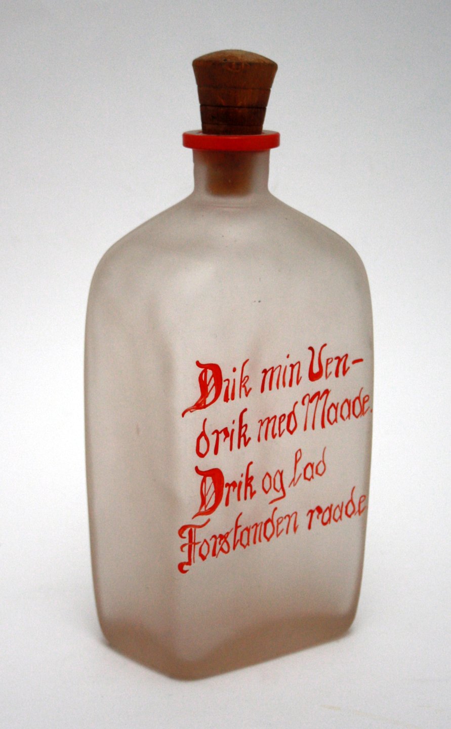 Holmegaard, Emalje dekoreret matteret kantineflaske med træprop og teksten "Drik min Ven - drik med Maade! drik! men lad Forstanden raade!". Designer Jacob Bang i 1930'erne. Pris: SOLGT