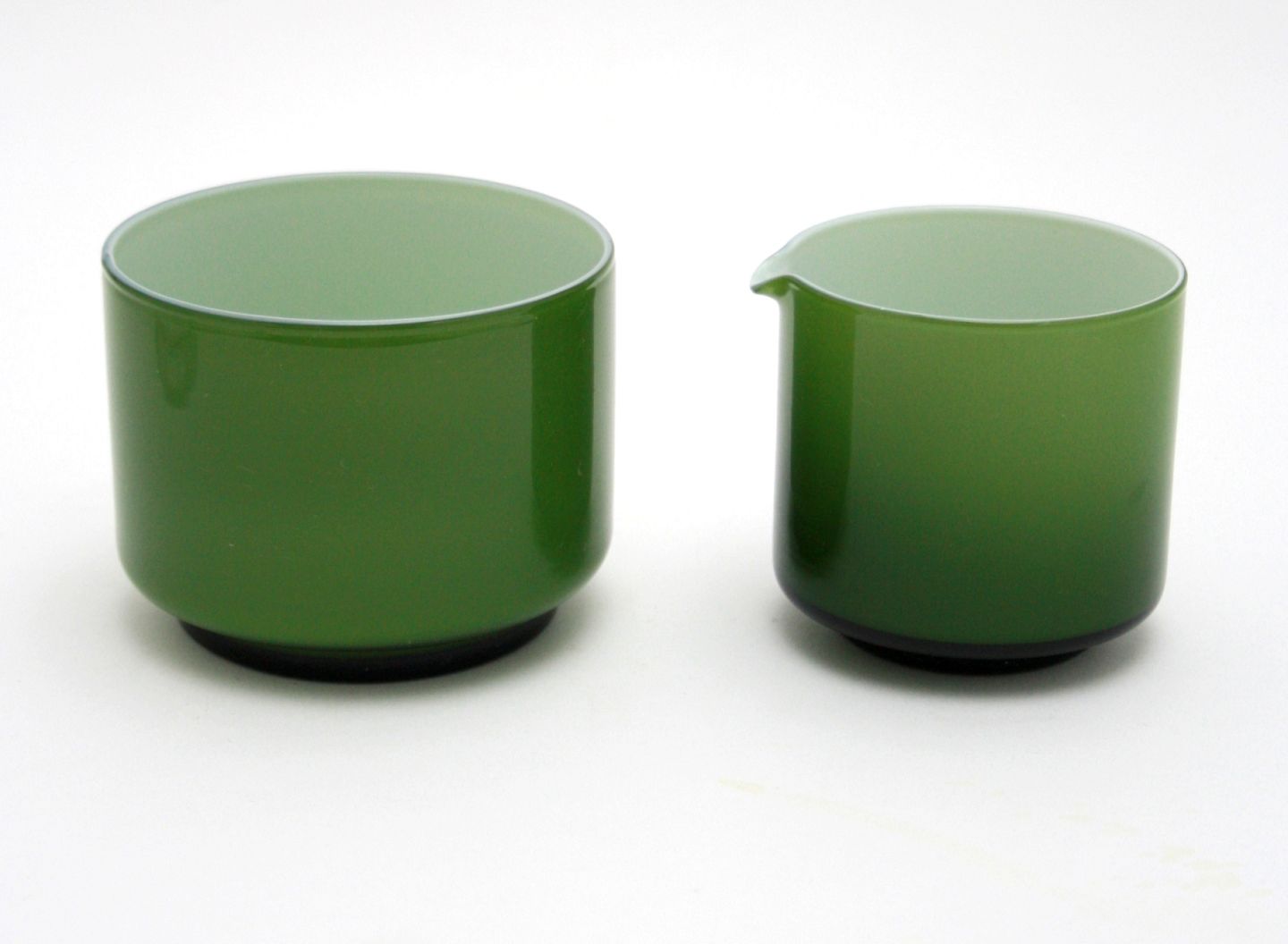 Holmegaard, Palet, Grøn sukker og fløde sæt. Designet af Michael Bang. Sukker, højde 6,5 cm. Diameter 8 cm. Fløde, højde 6,5 cm. Diameter 6,5 cm. Flot stand. Pris: sælges samlet SOLGT