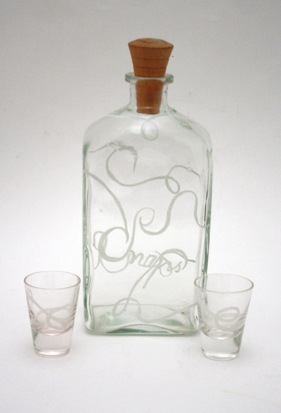 Holmegaard, klar kantineflaske med opalhvid emaljedekoration med teksten "Snaps" med original træprop. Designet af Jacob E Bang, i 1937. Flaske. Højde 21,5 cm. Pris: SOLGT Små glas. Højde 5,5 cm. Pris: SOLGT