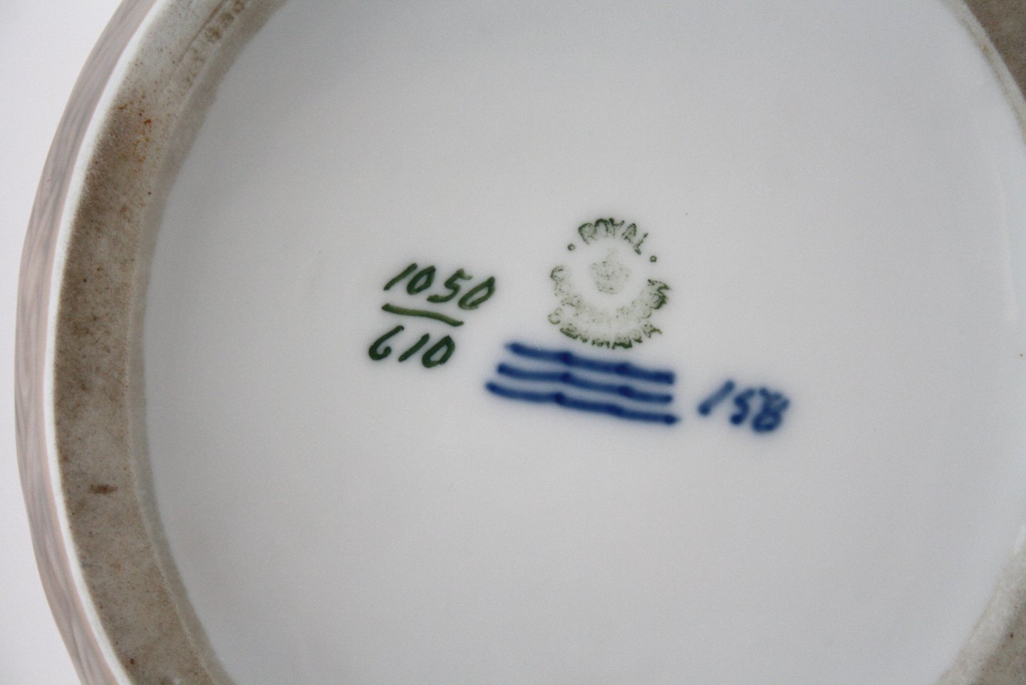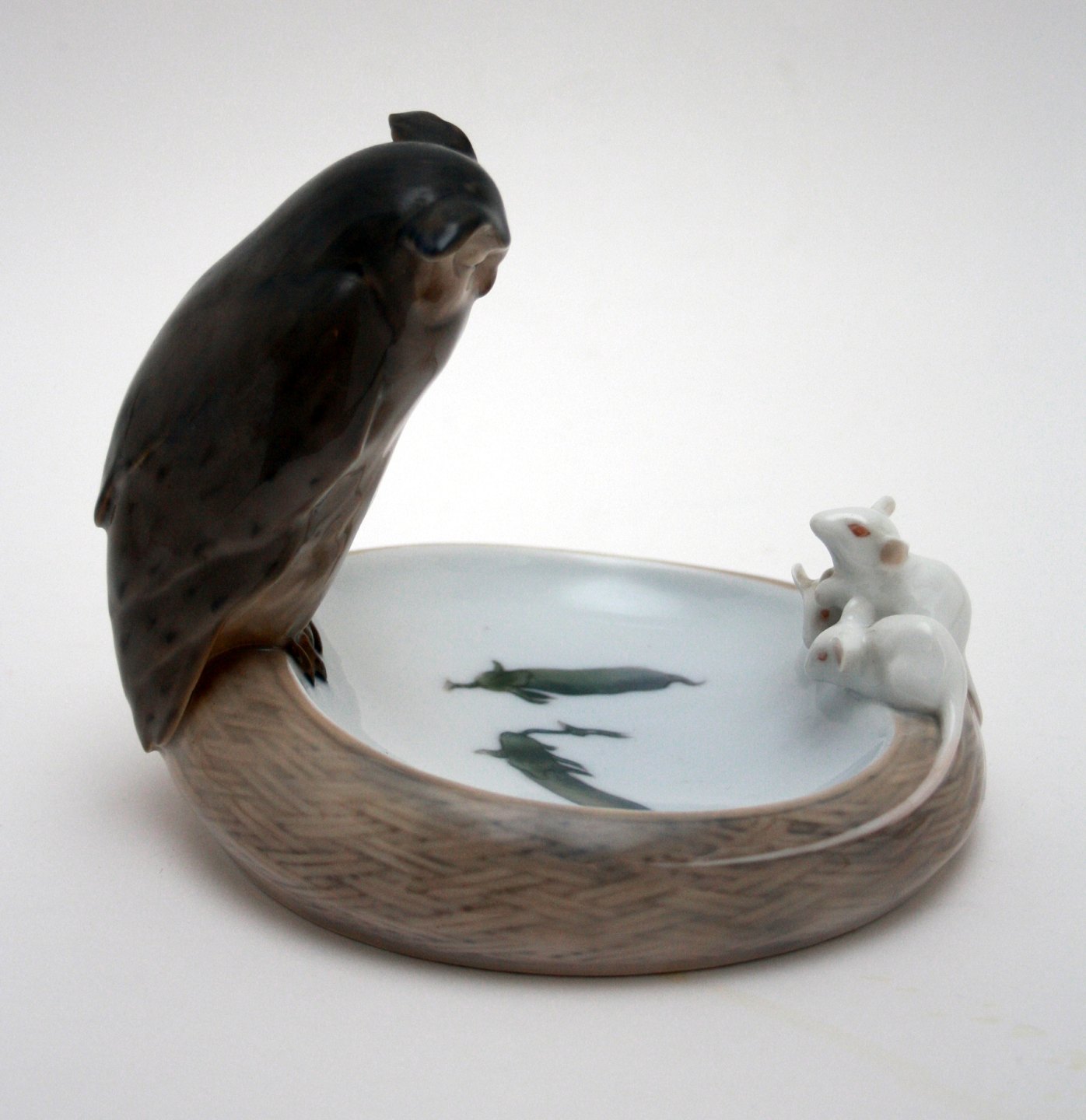 Royal Copenhagen, Ugle og tre mus på fad/skål. Designet af Chr. Thomsen i 1904. Højde 13 cm. Længde 14,5 cm. Der er afslag på det ene museøre. I. sortering. Pris: SOLGT