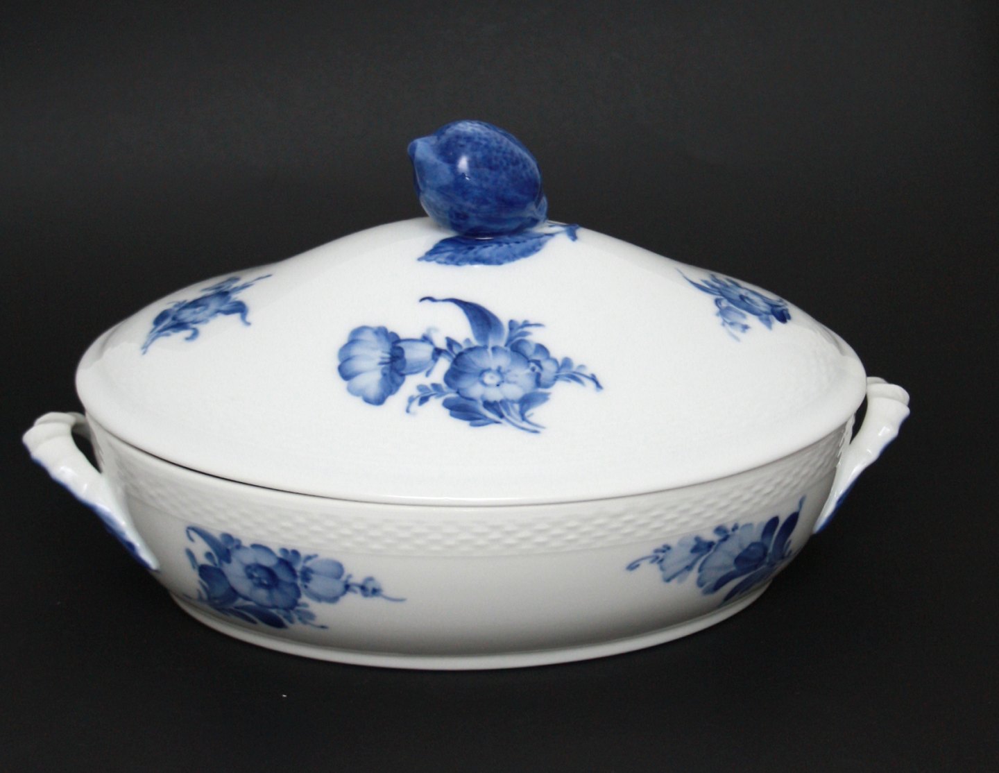 Royal Copenhagen, Blå Blomst flettet, Oval terrin med låg. Formnr. 10/8172. Højde 15,5 cm. Længde 27,5 cm. Bredde 18 cm. II. sortering. Pris: SOLGT