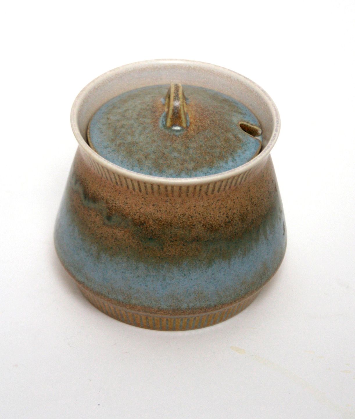 Knabstrup stoneware Knapstrupstellet i azur farve Marmeladeskål med låg. Højde 9 cm. Øverste diameter 9,5 cm. God stand. Pris: SOLGT