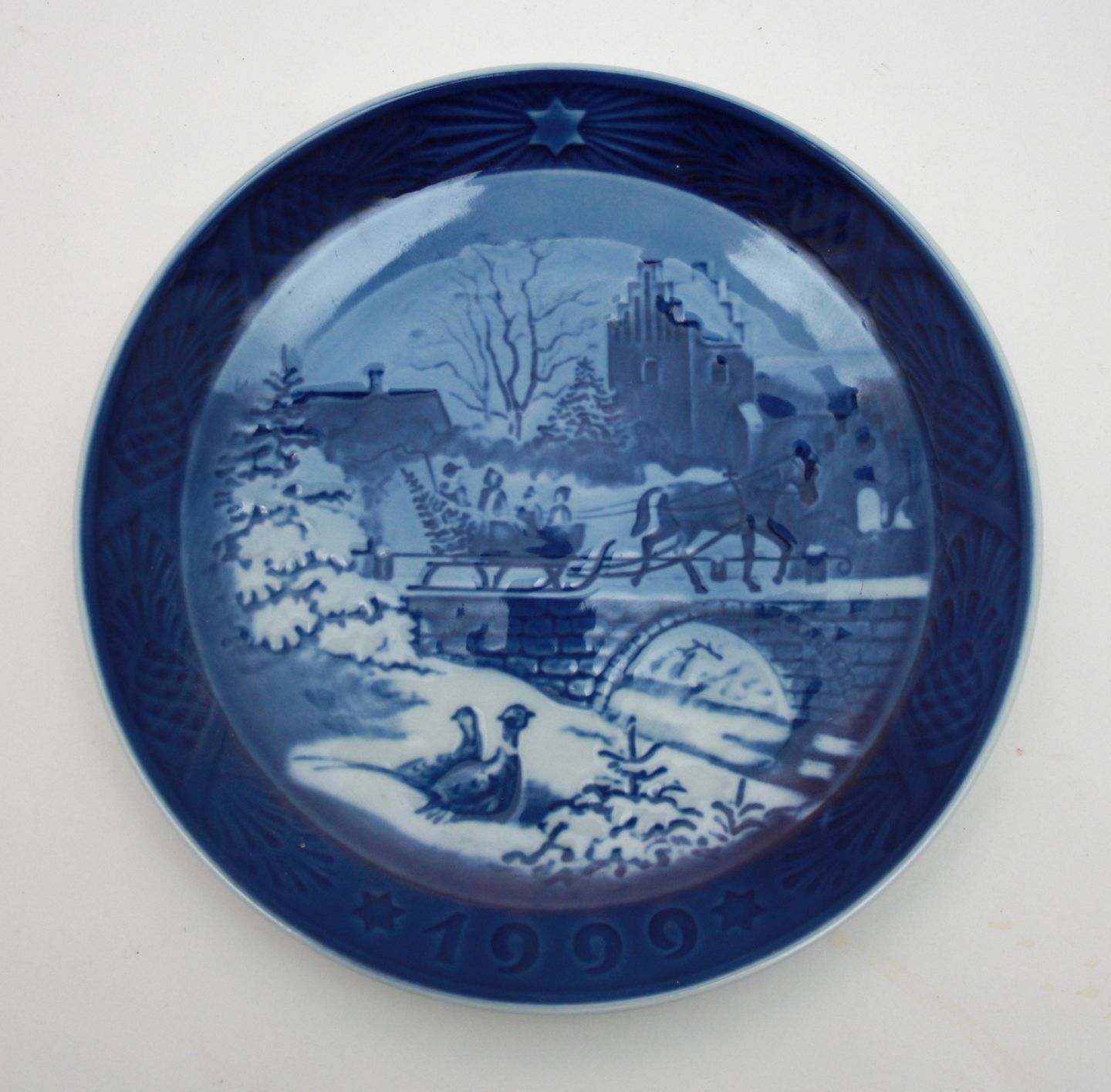Royal Copenhagen, Juleplatten 1999 "Hjem med træet" af Sven Vestergaard. Diameter 18 cm. 1. sortering. Pris: SOLGT