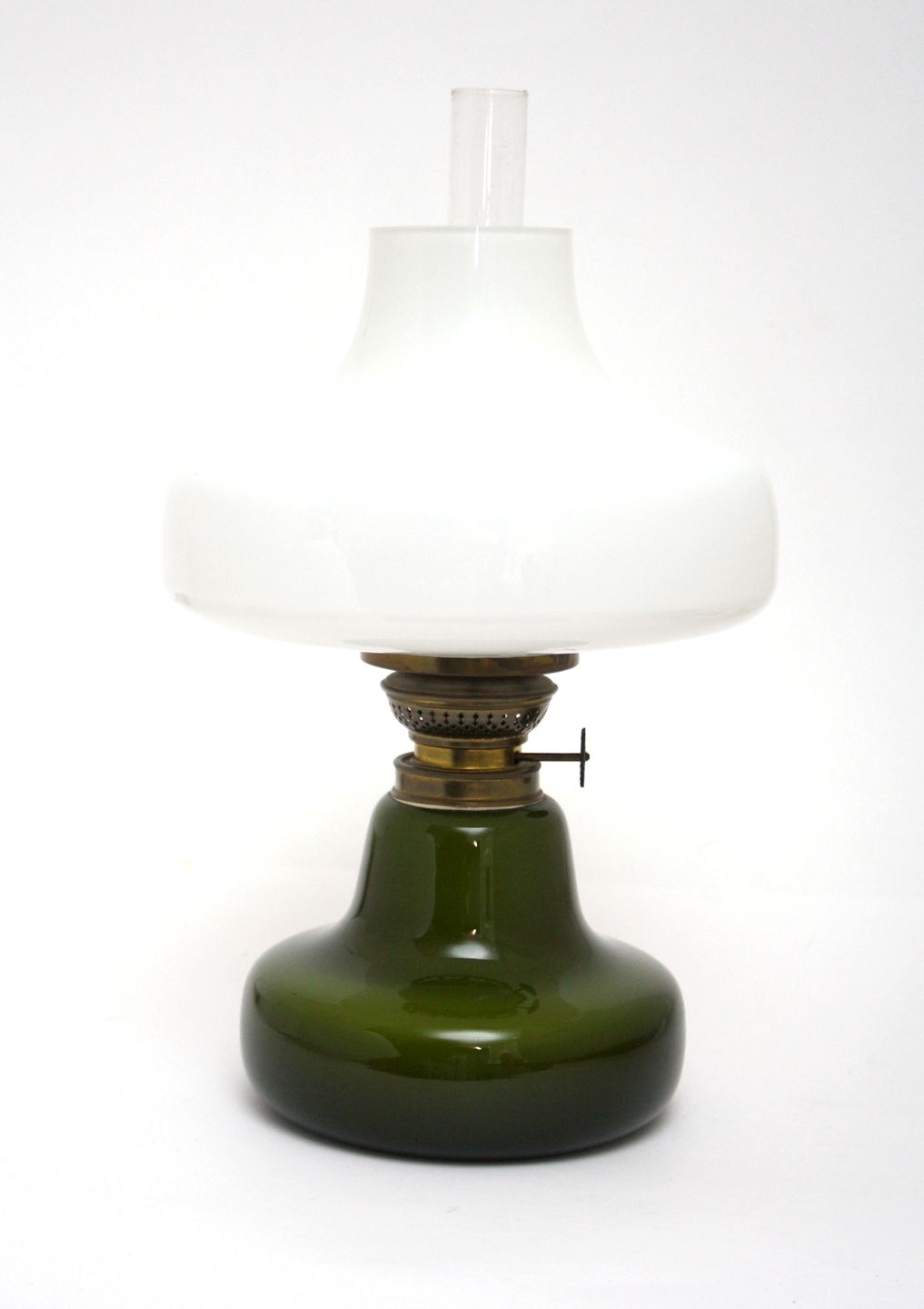 Fyens glasværk, Oline petroleumslampe i jadegrøn og hvid opaline skærm, produceret for Fog og Mørup i 1970. Højde 30 cm. Diameter bund 15 cm. Pris: SOLGT