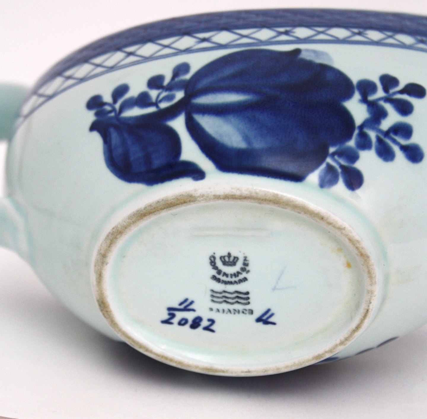 Saucekande. Dekorationsnr. 11/2082. Længde 20 cm. Bredde 8,5 cm. Højde 10,5 cm. Pris: SOLGT