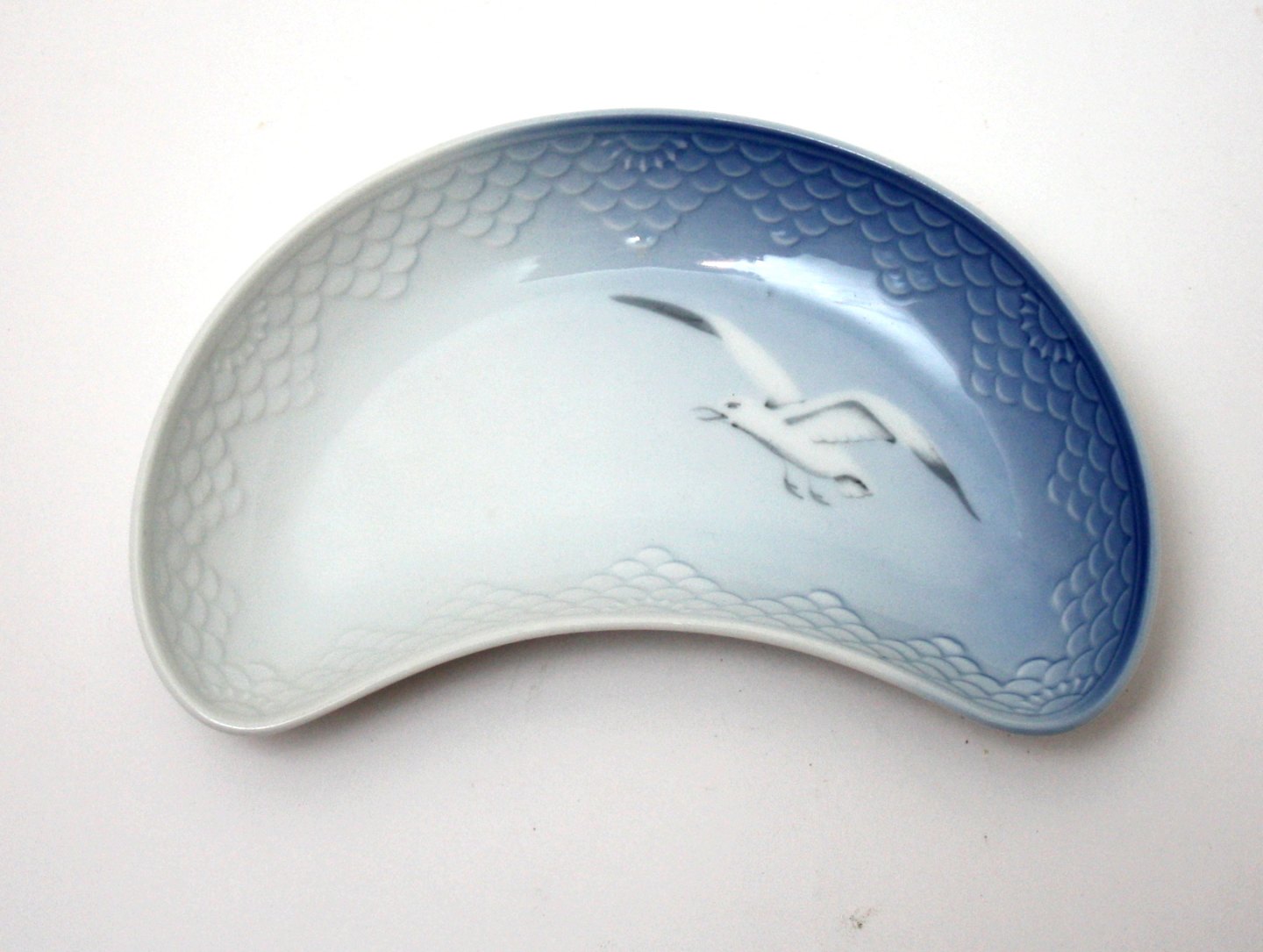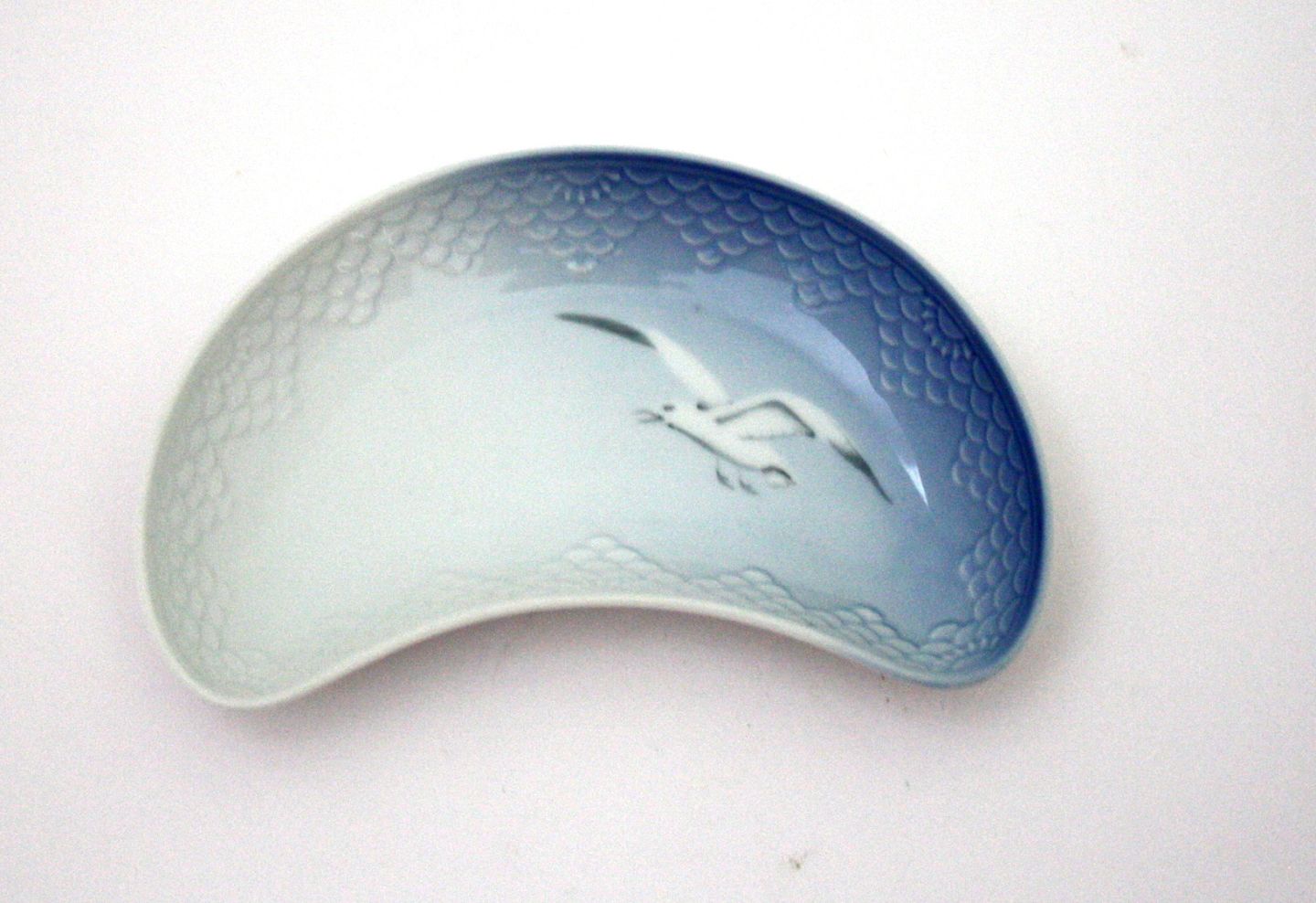Bing & Grøndahl, Mågestel uden guld, Halvmåneformet. Formnr. 41. 19 x 11,5 cm. II. sortering. Pris: SOLGT