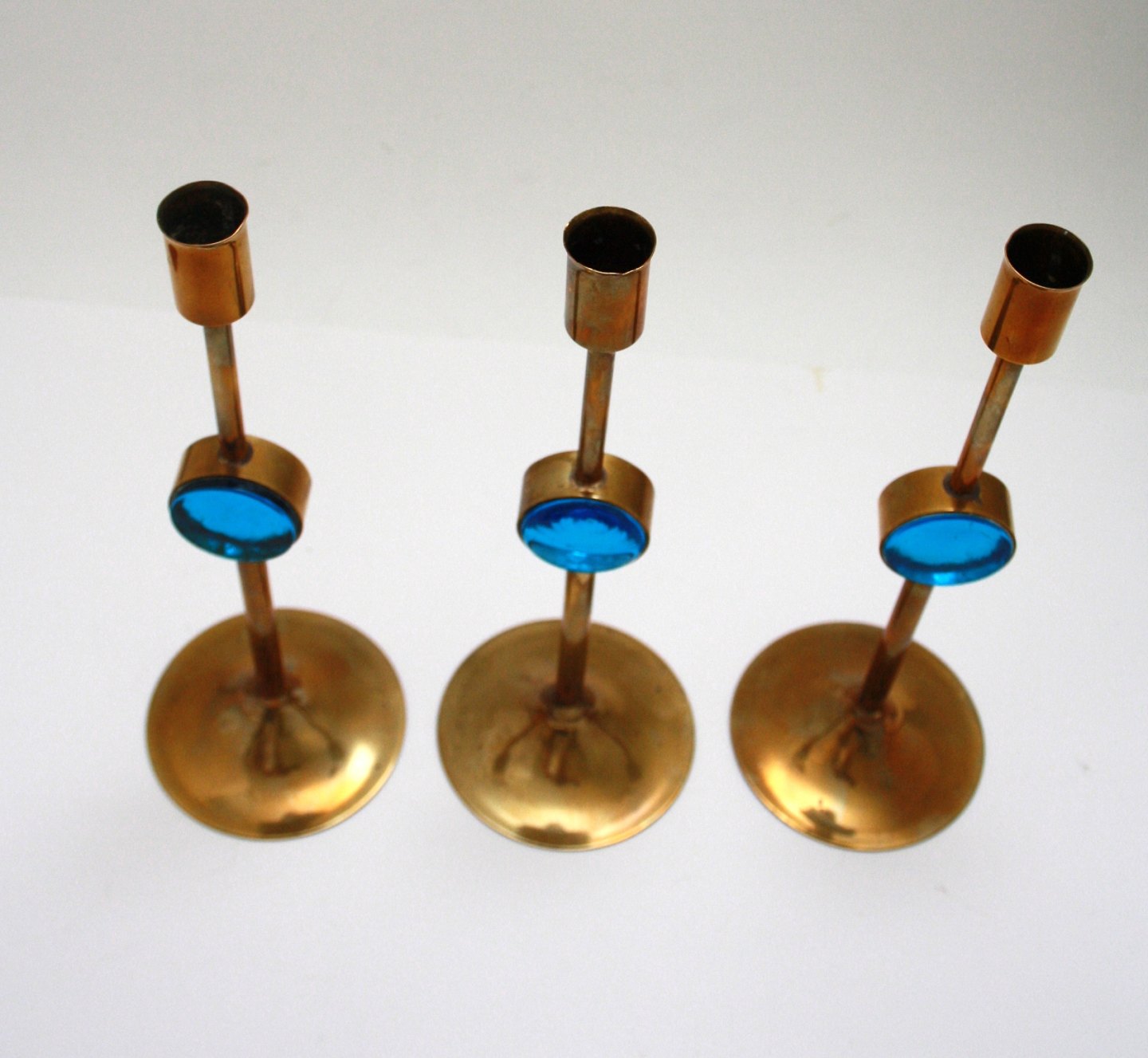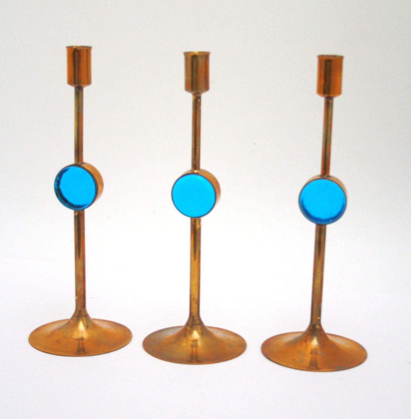 Messing lysestager med indlagt blåt glas. Højde 27,5 cm. Samlet for 3 stk. Pris: SOLGT