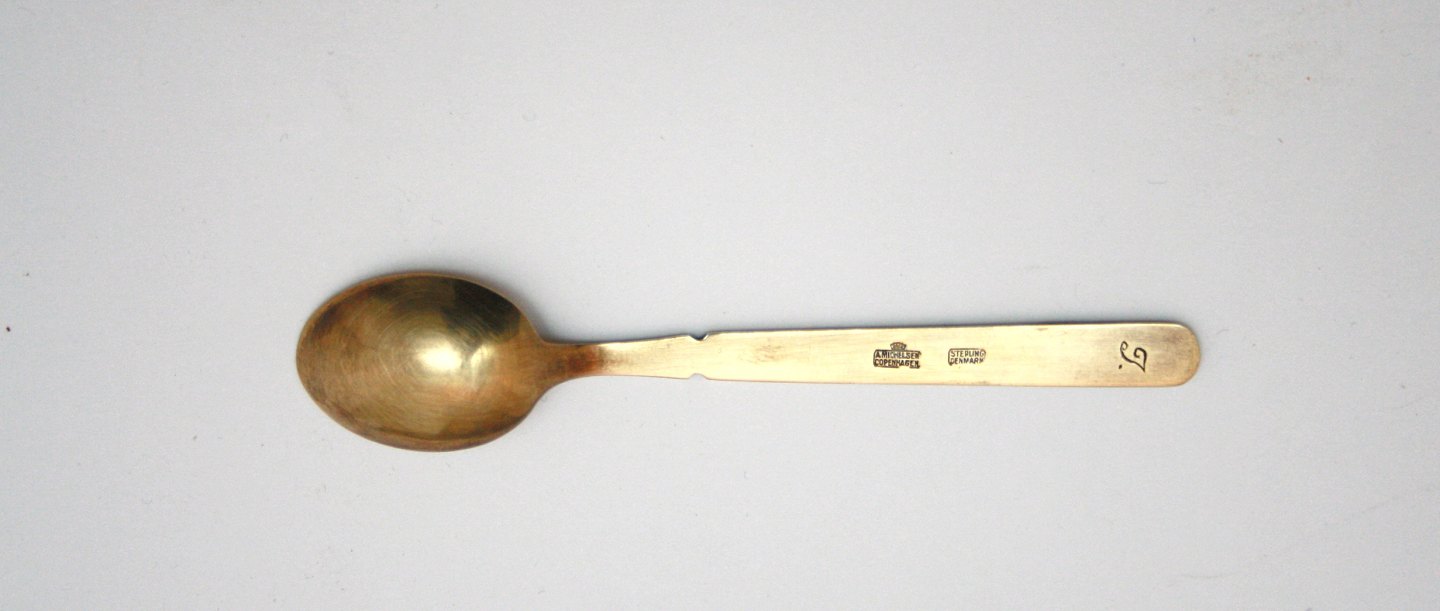 A. Michelsen, kaffeskeer i forgyldt sterlingsølv med emaljeskaft. Indgraveret F. Længde 10 cm. 6 stk. i original æske. SOLGT