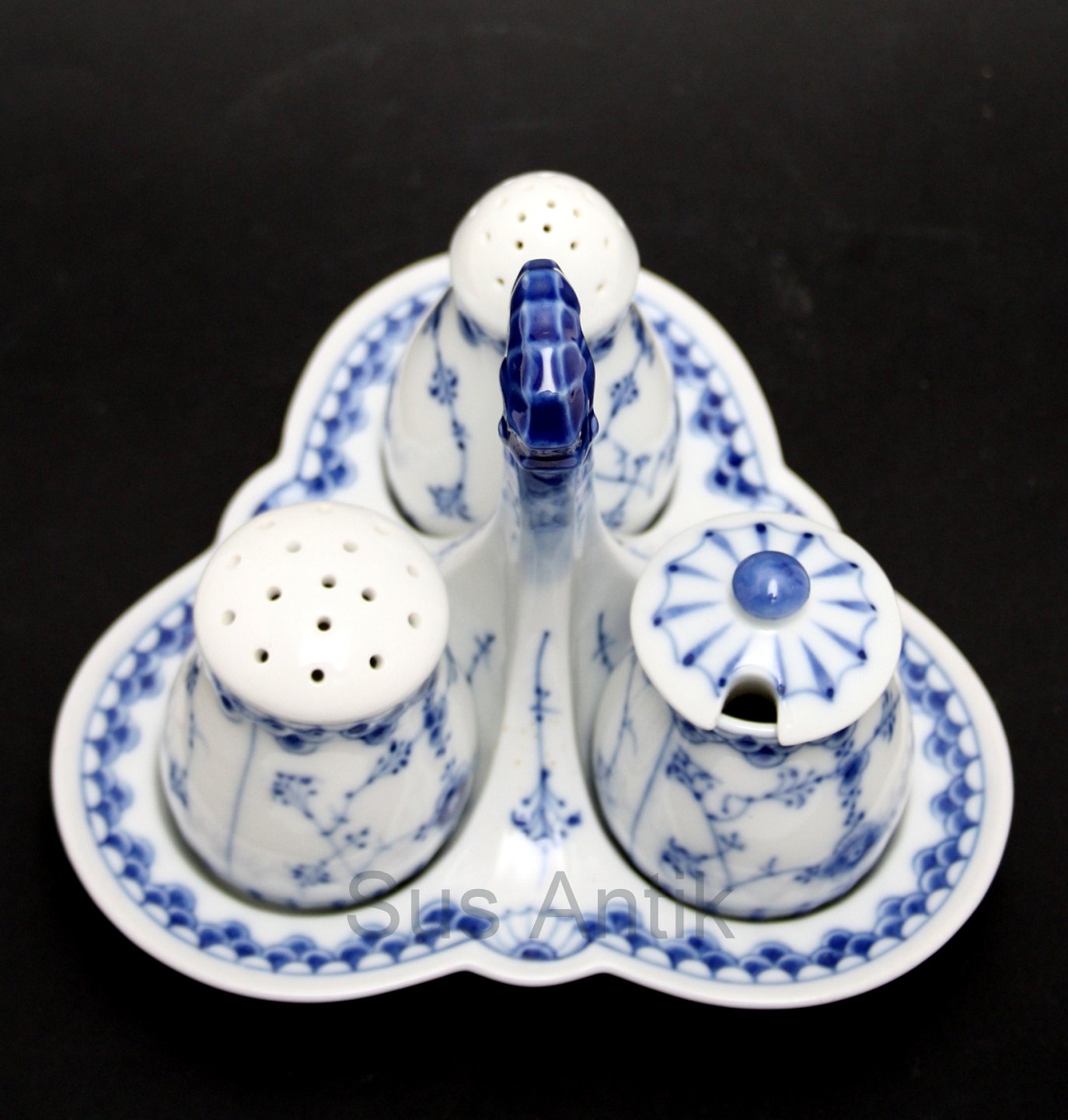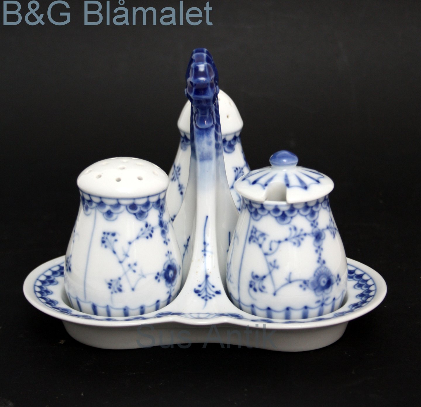 Bing og Grøndahl, Blåmalet (Musselmalet). Plat de menage. Bestående af holder med søhestehank, salt, peber med gummeiprop og sennep med låg. I. sortering. Perfekt stand. Pris: SOLGT