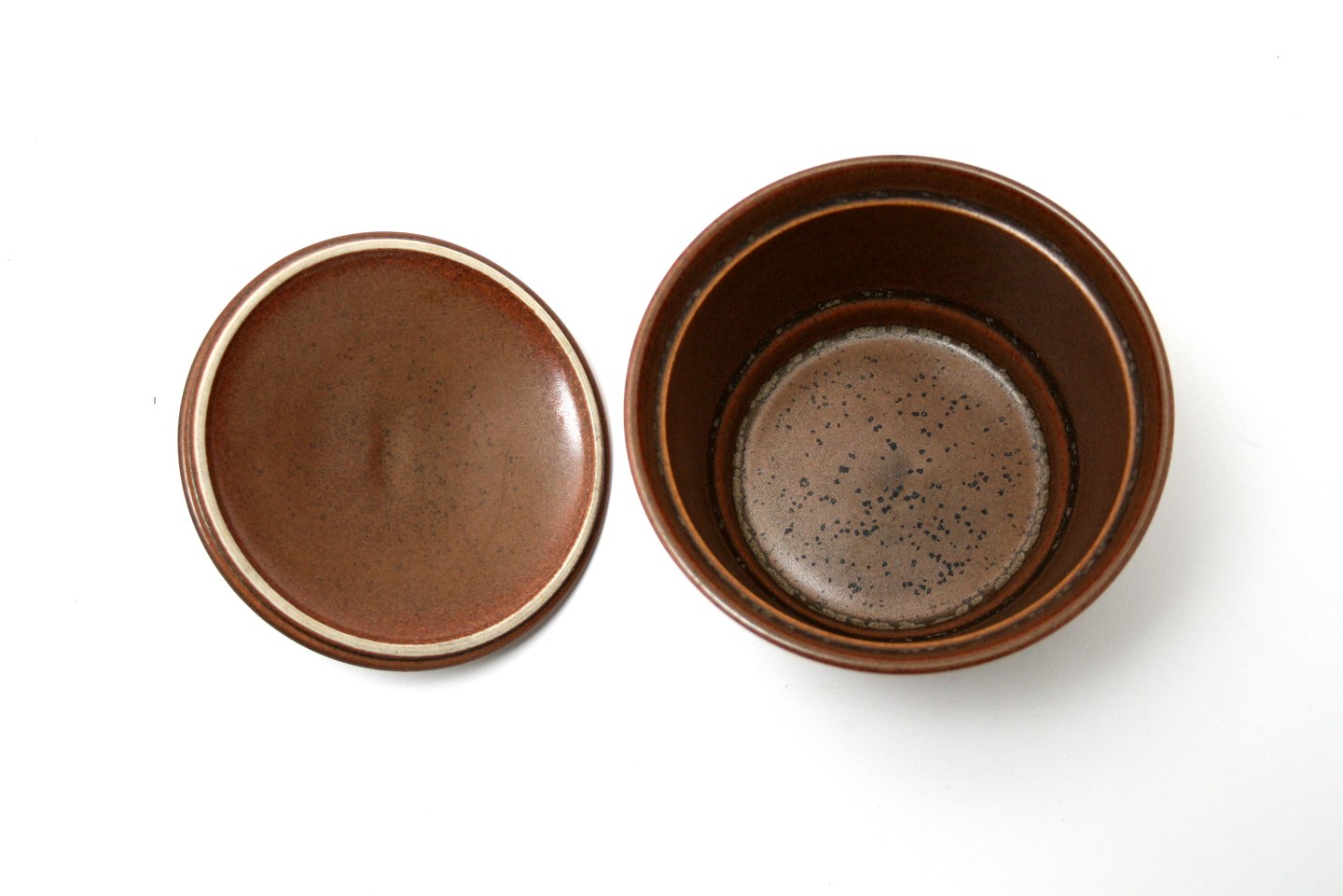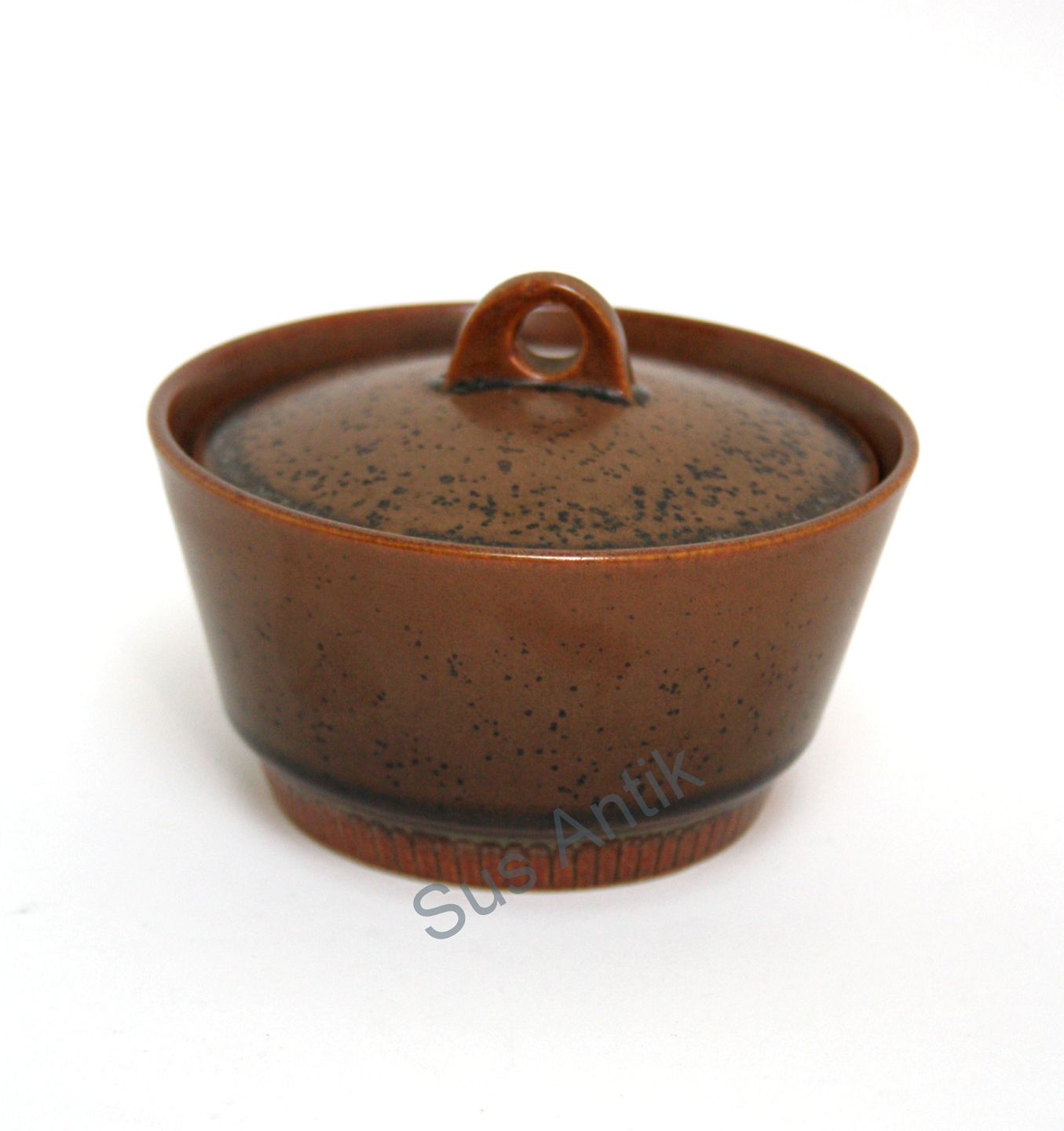 Knabstrup, Knabstrupstellet brun, Nøddebo. Sukkerskål med låg/marmeladeskål. Diameter 11,5 cm. Højde 9 cm. Pris: 150 kr. stk. Lager: 1