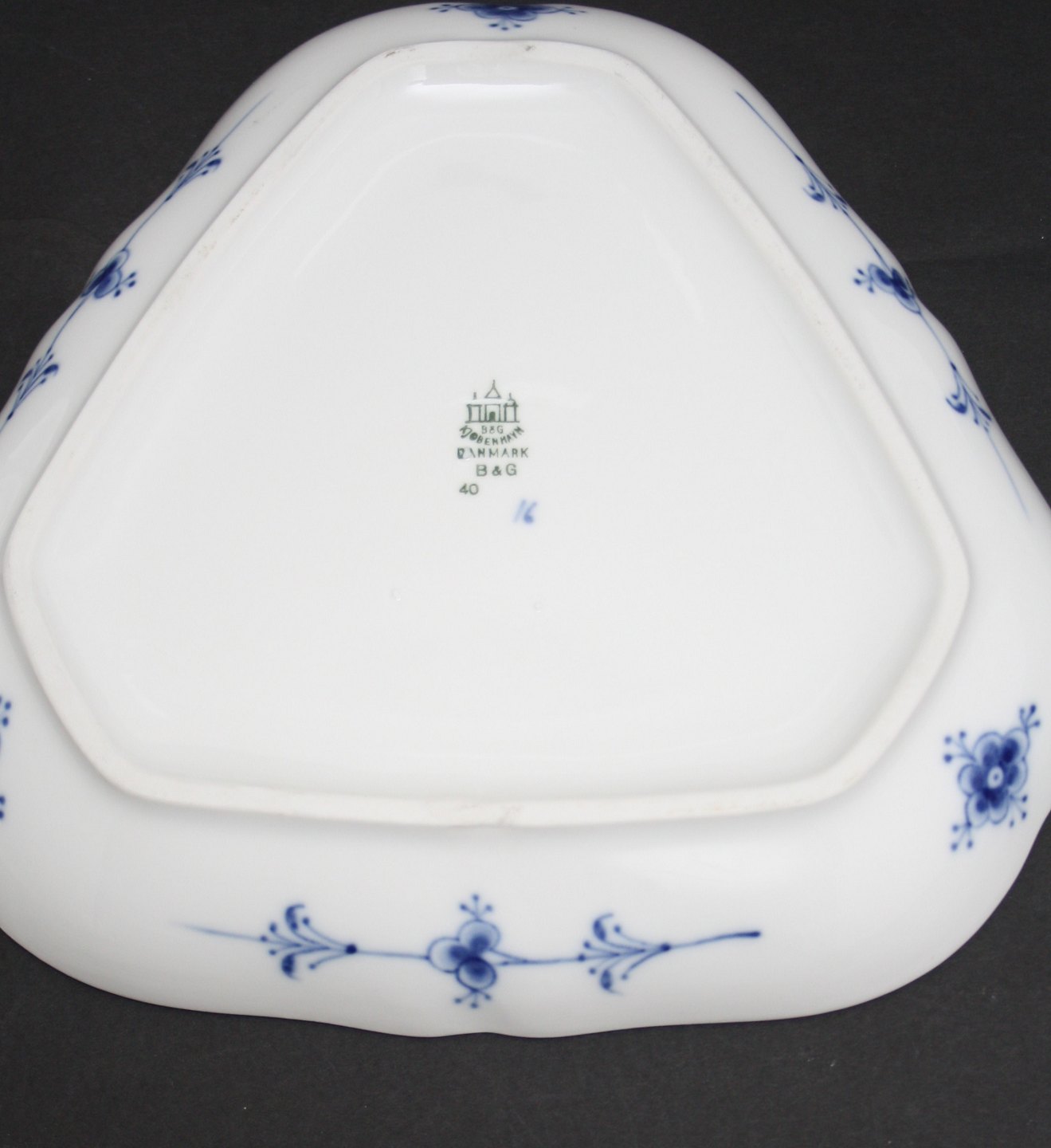 Bing og Grøndahl, Blåmalet (Musselmalet). Trekantet fad. Nr. 40. Produceret 1948-1952. 24 x 23 cm. II. sortering. Fin stand. Pris: SOLGT