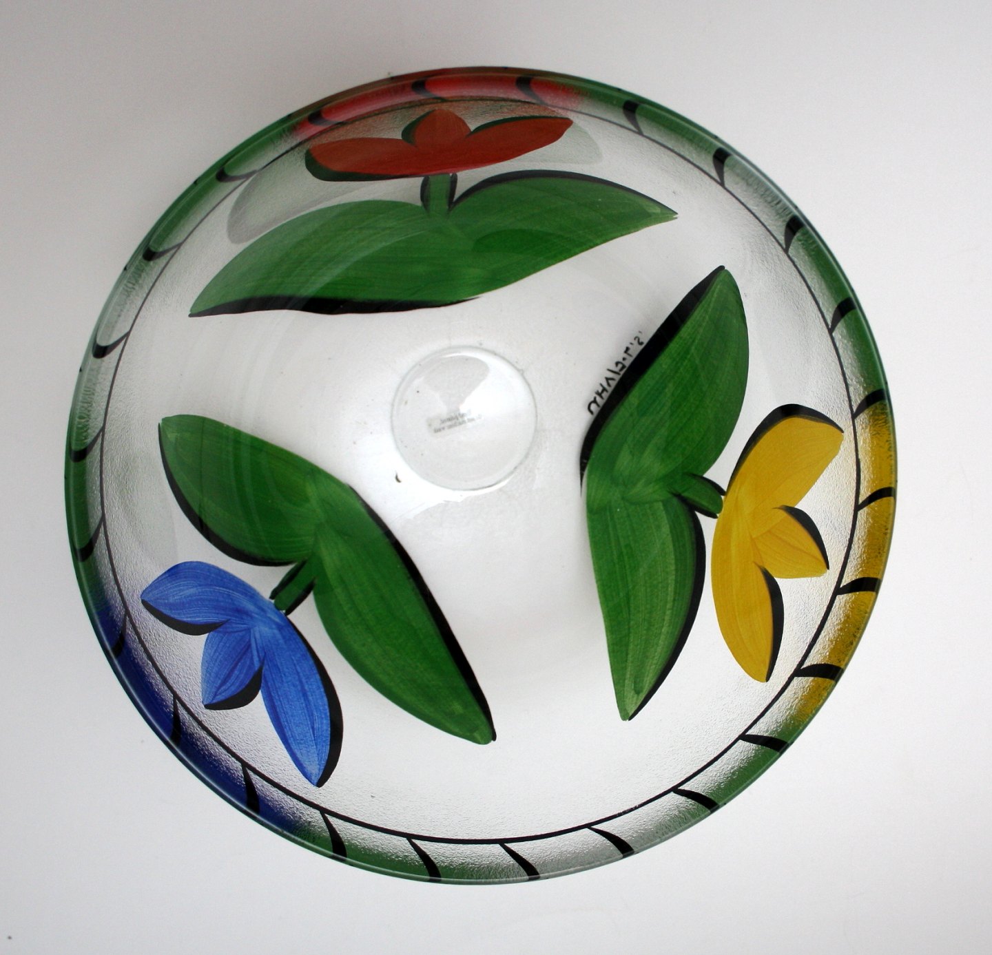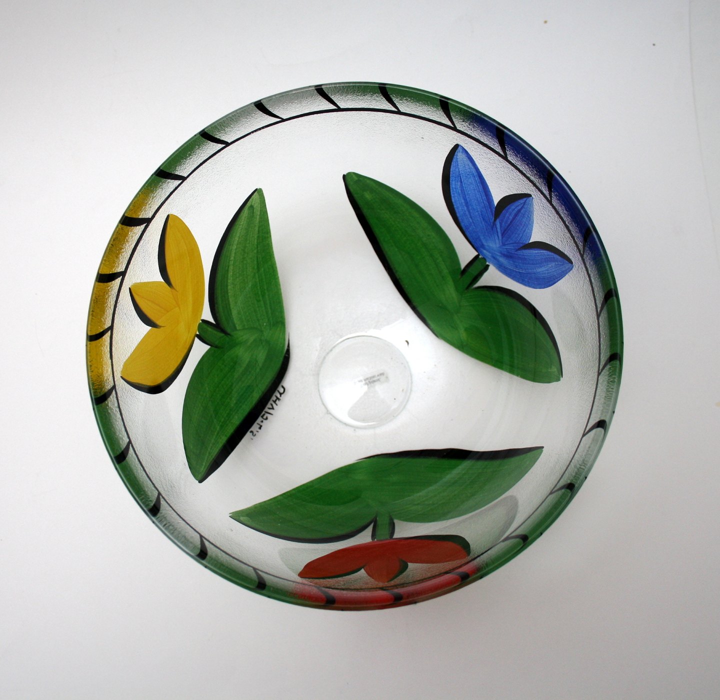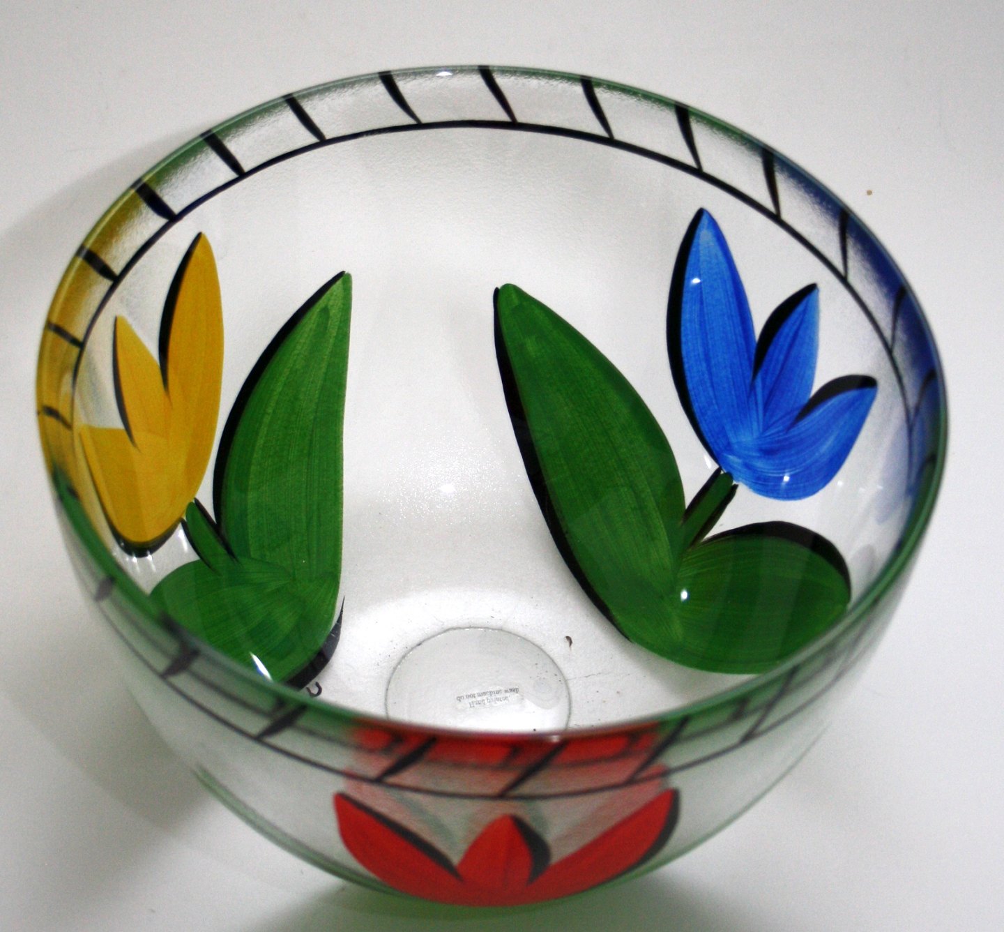 Kosta Boda, Tulipa stor skål med rød, gul og blå tulipan matteret i yderdelen. Designet af Ulrica Hydman-Vallien. højde 14 cm. Diameter 22 cm. Pris: SOLGT