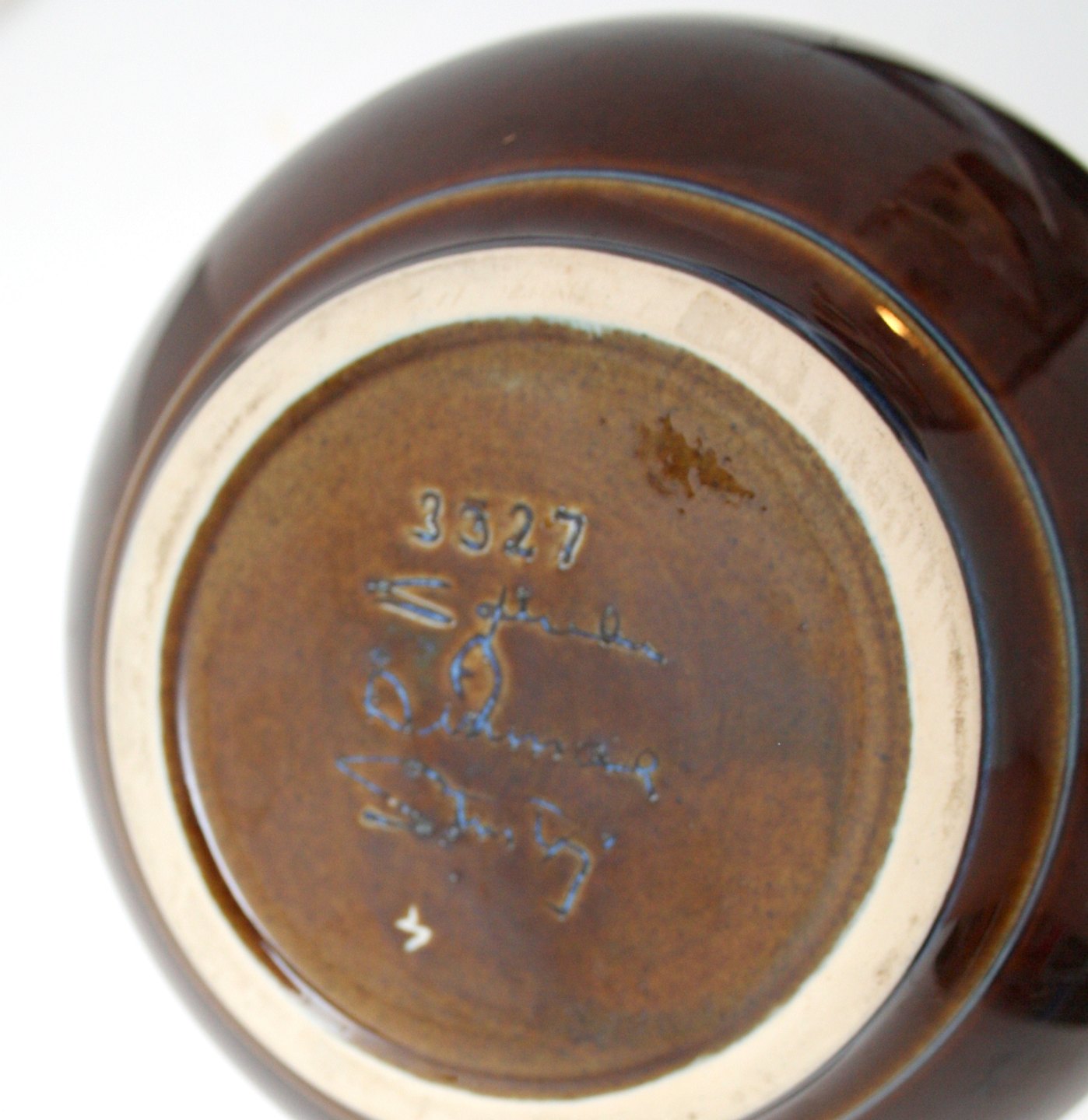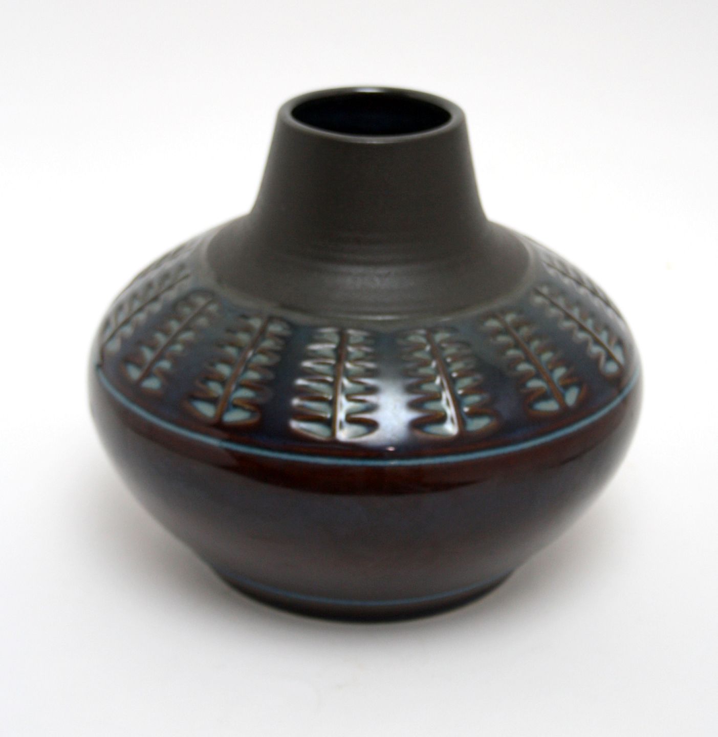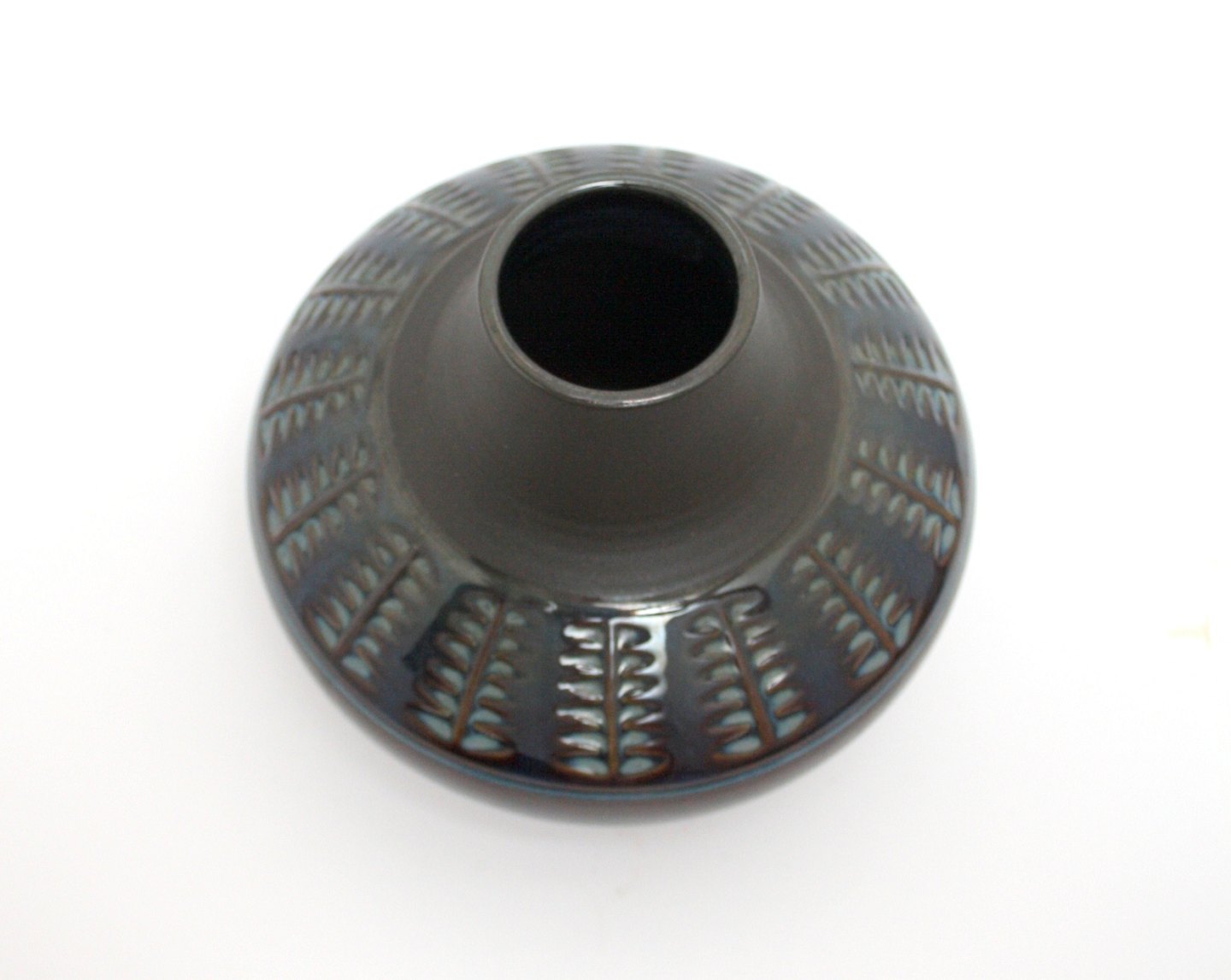 Søholm, Stor vase med reliefdekoration med blå glasur og rå stentøj. Designet af Einar Johansen. Formnr 3327. Højde 17 cm. Største diameter 20 cm. Flot stand. Pris: SOLGT