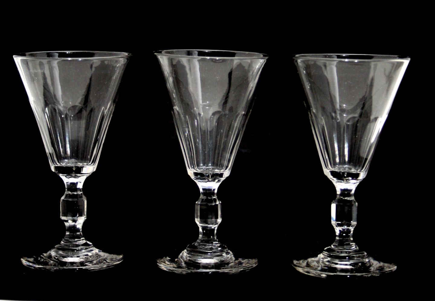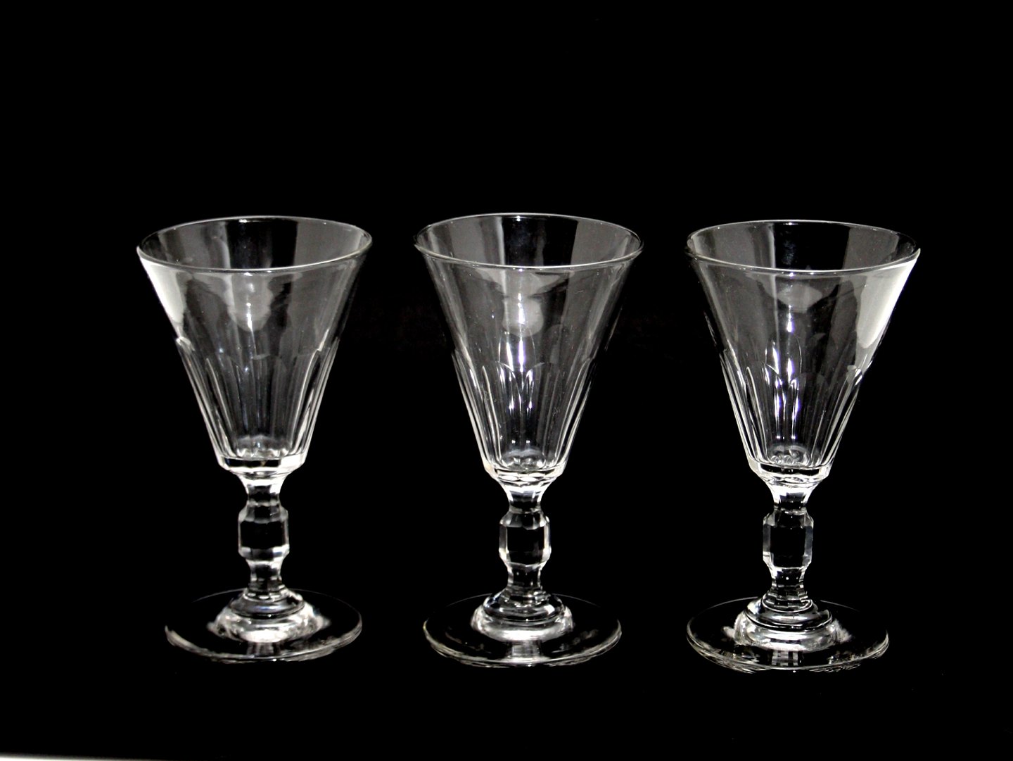 Trompetformede gamle krystalglas med oliveslibninger, facetslebet stilk med lang slebet knap. Rundslebet bund. Før 1900 tallet. Højde 13 cm. Diameter 7 cm. solgt