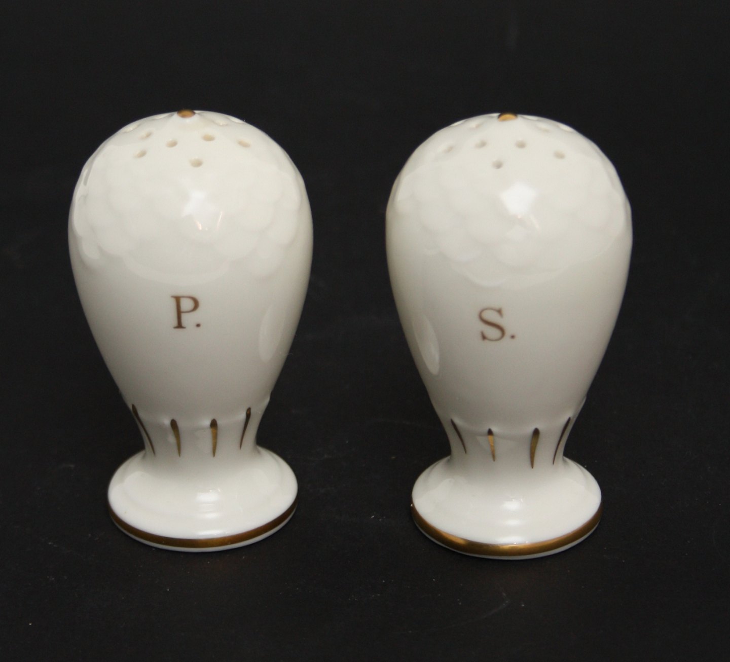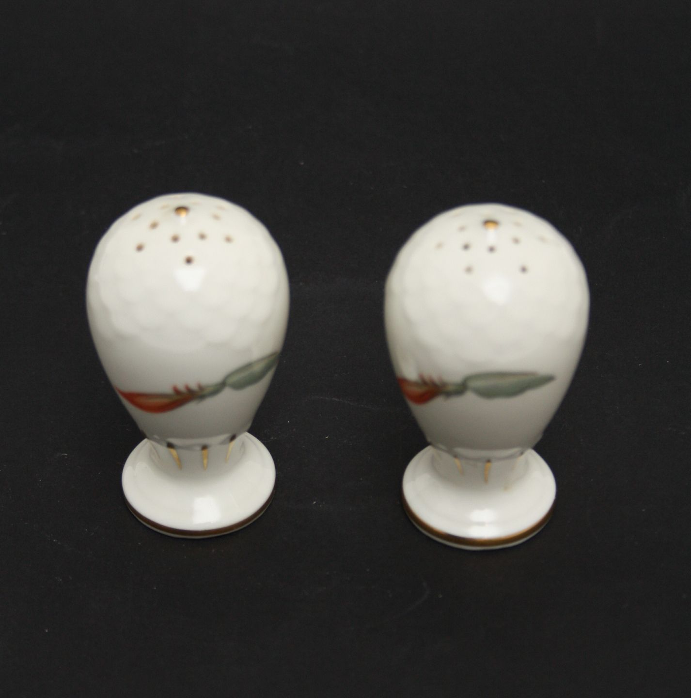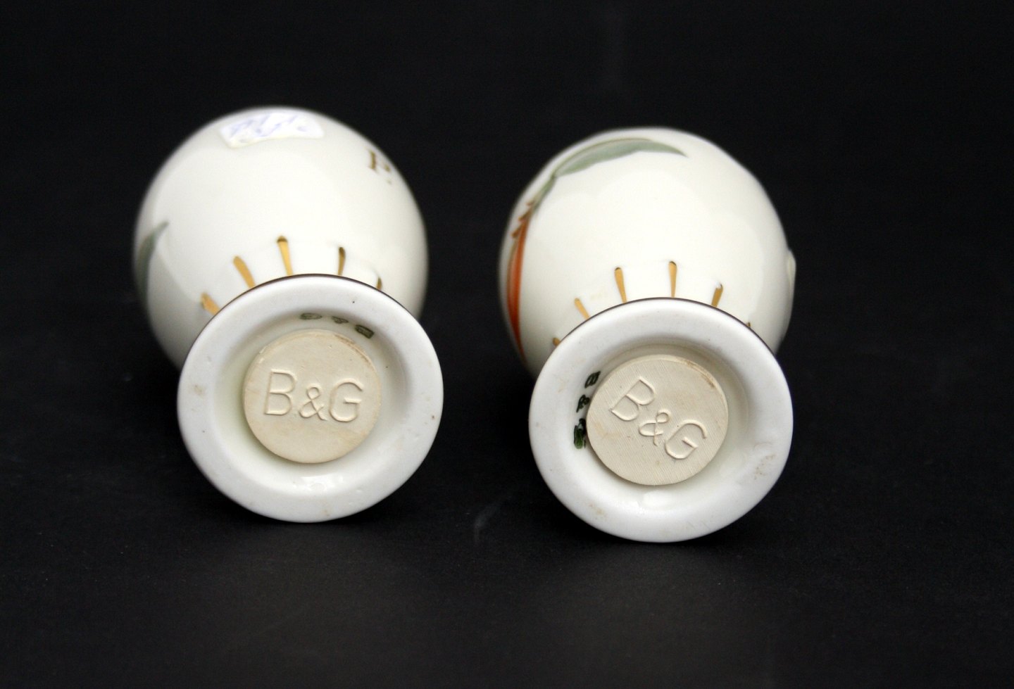 Bing & Grøndahl, Kaktusblomst, cremefarvet stel med guldkant og motiv med kaktusblomst. Salt og Peber. Højde 7,5 cm. Pris: SOLGT