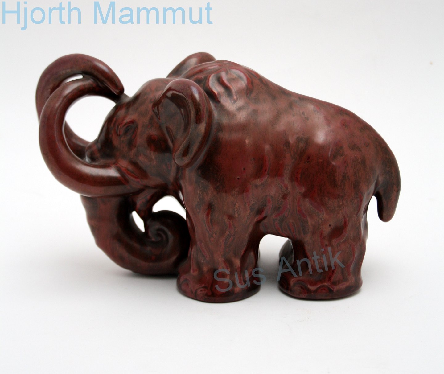 L. Hjorth, Bornholm. Mammut i okseblodsglasur. Designet af Gertrud Kudielka. Formnr. 536. Højde 13 cm. Længde 22,5 cm. Flot stand. Pris: SOLGT