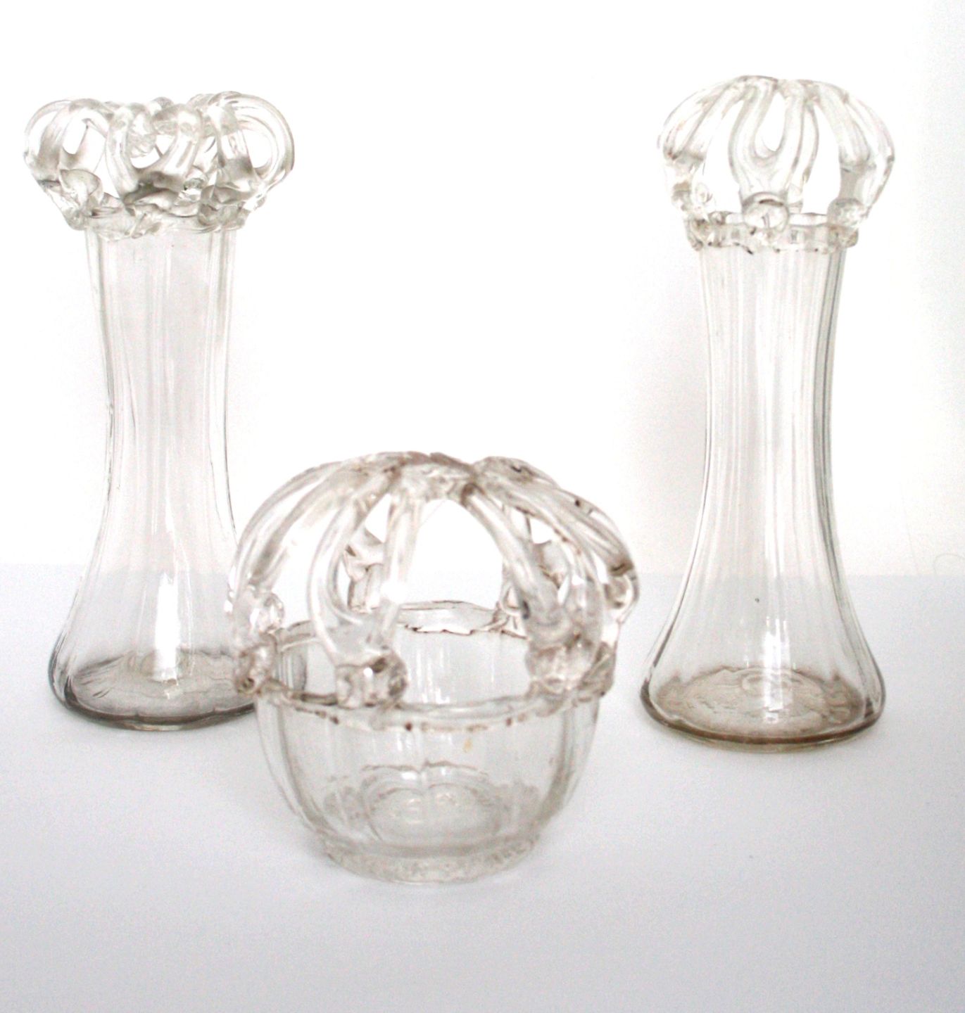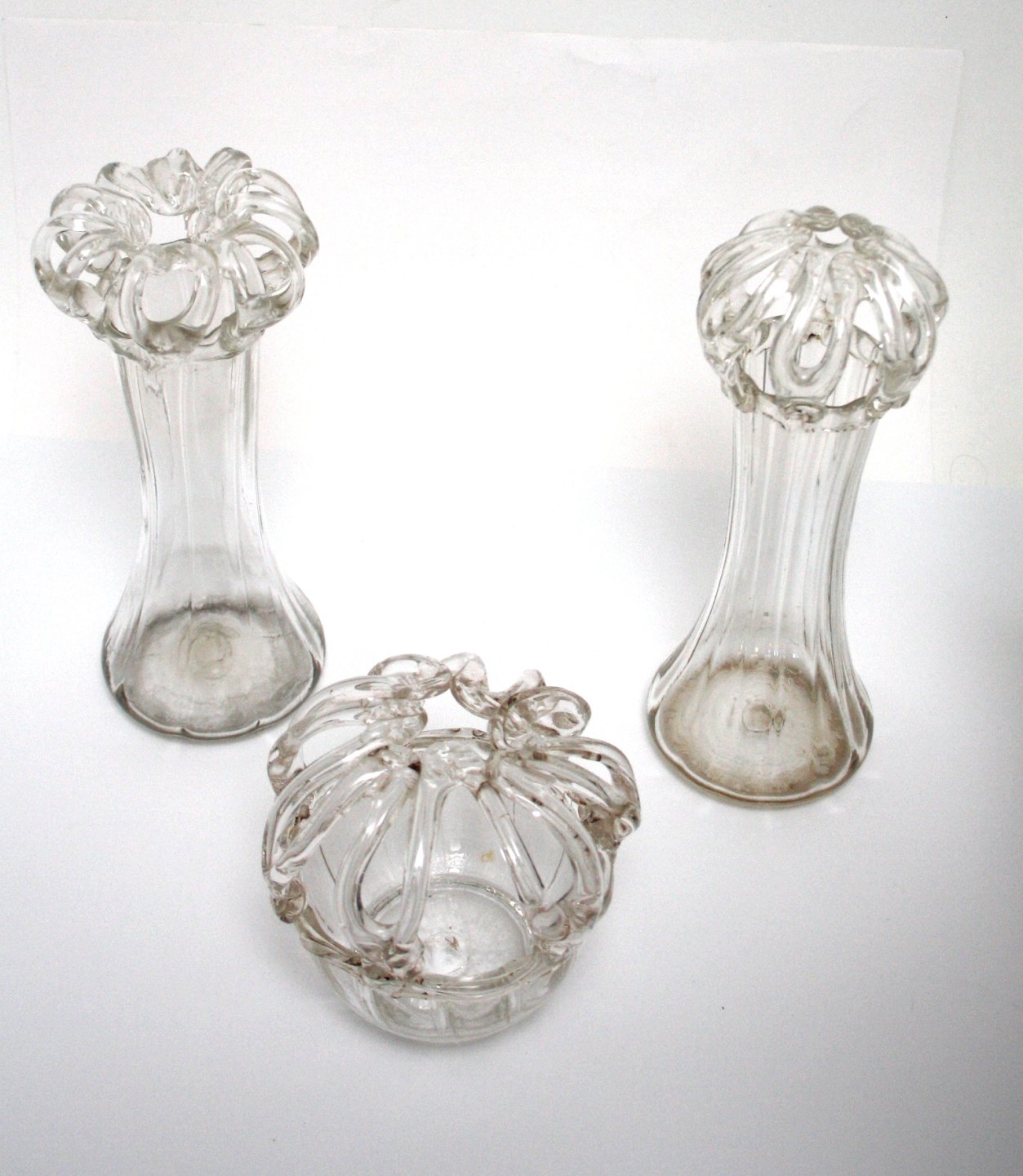 Diverse glasværk, betegnet som fusk, Brudekroner. T.v. Flad top. Højde 23,5 cm. Pris: SOLGT T.v. Rund top. Højde 24,5 cm. Pris: SOLGT Skål. Højde 13 cm. Revne se foto. Pris: SOLGT