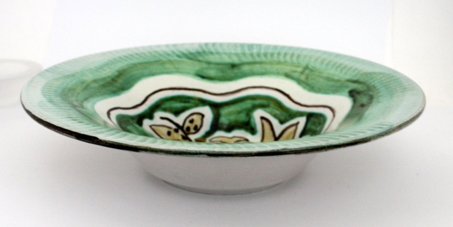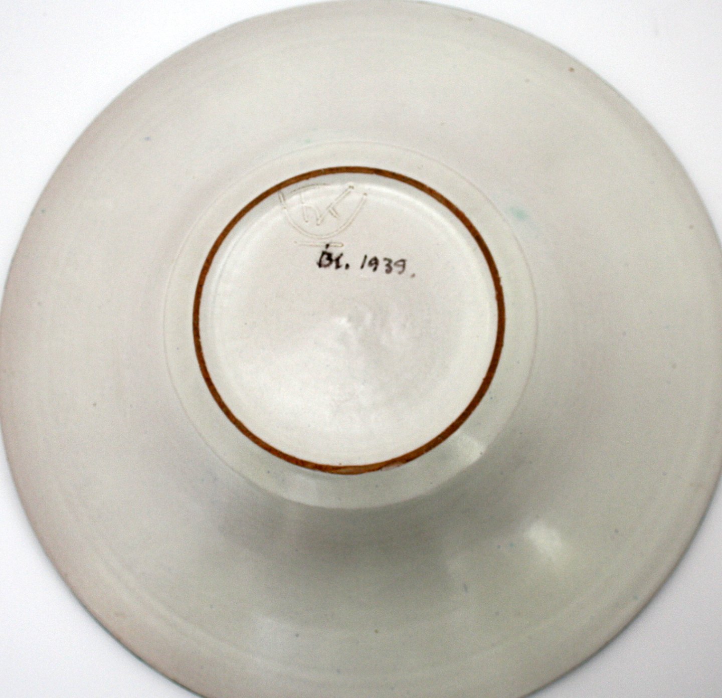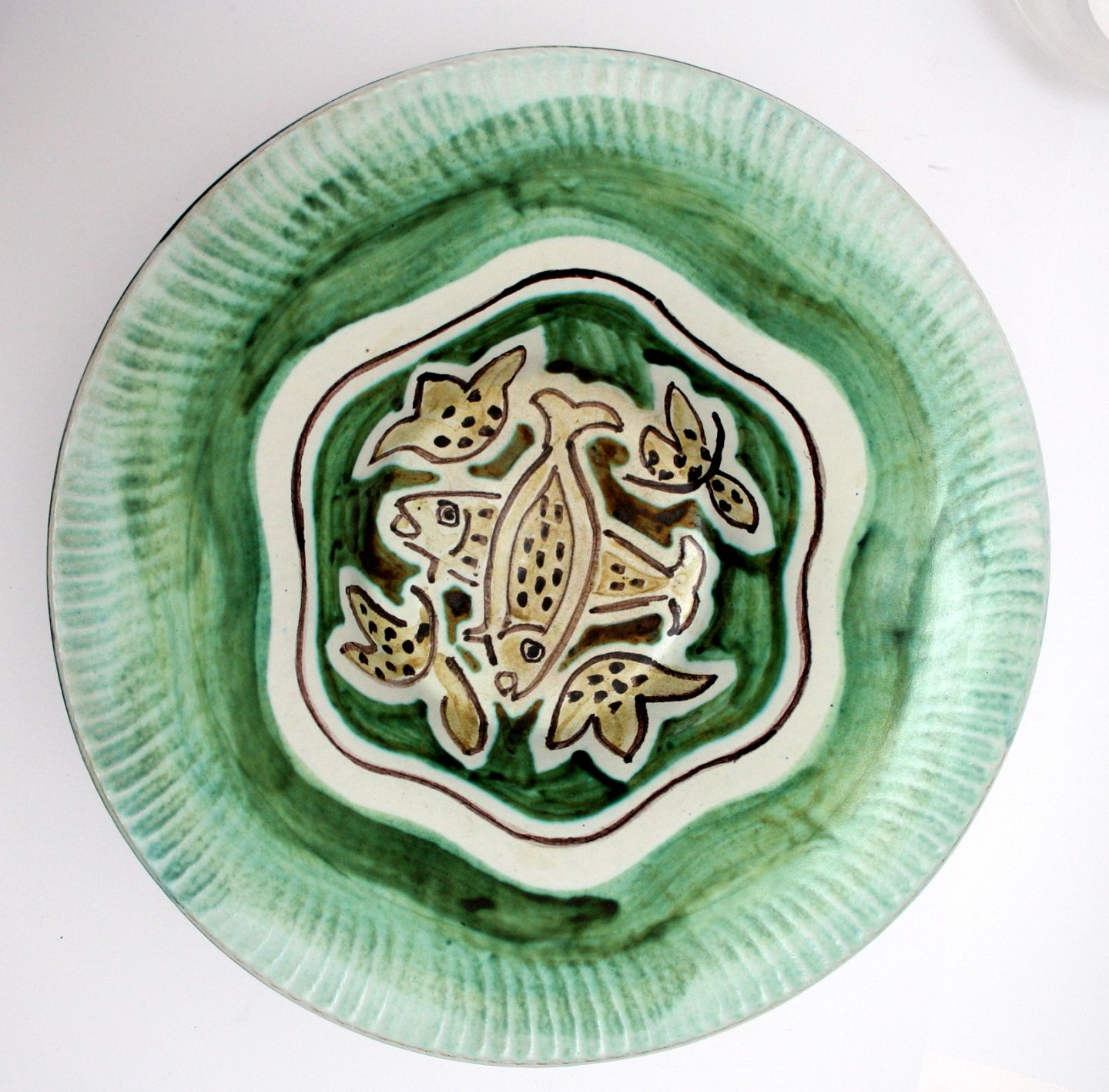Stort fad med fiskemotiv i perfekt stand. Højde 8 cm. Diameter 34 cm. Kunstner Julie Bloch Kyhn, Farum Keramik. Signeret BK 1939 og FK. Farum Keramik var Knud Kyhn og hans kone Julie Bloch Kyhns eget værksted fra 1934 til 1969. Pris: SOLGT
