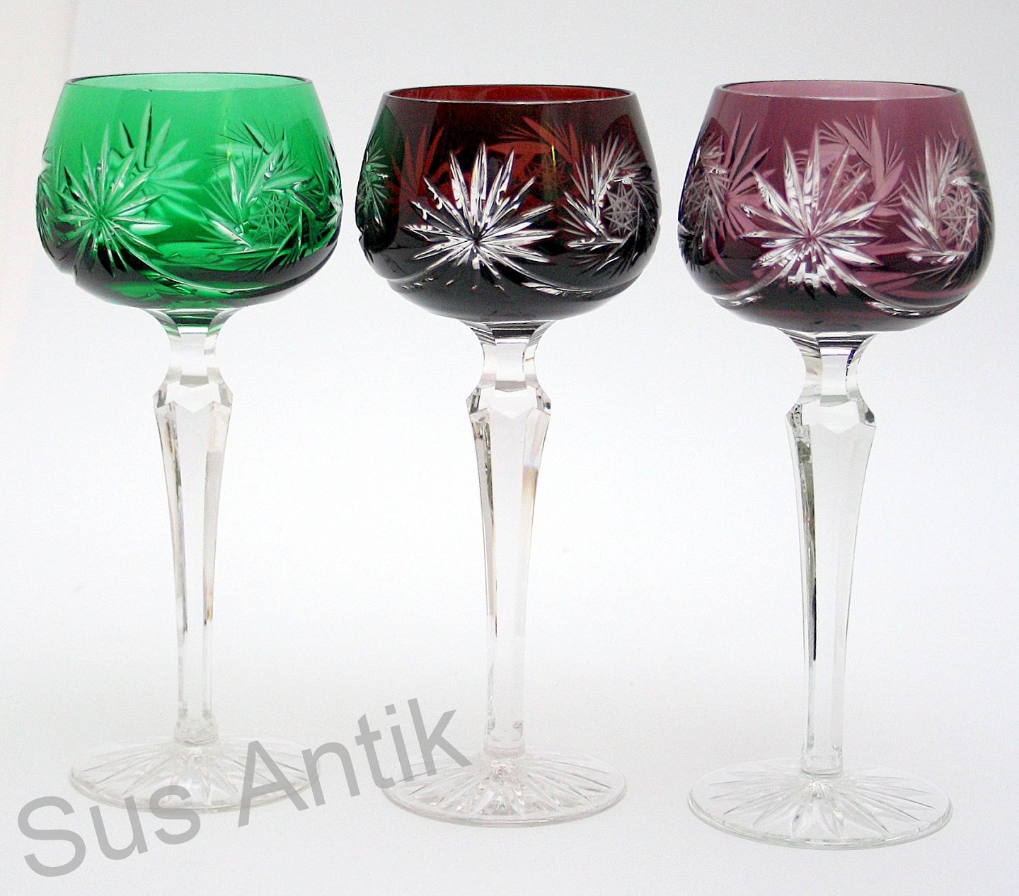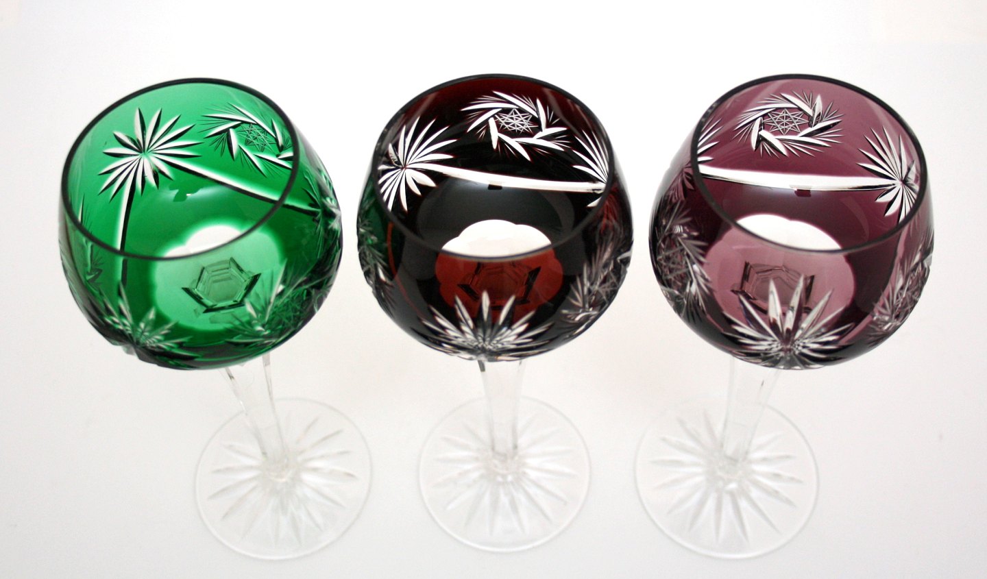 Bøhmisk krystalglas i farver med slebet kumme, stilk og fod. A-5-21. Højde 19 cm. Pris: SOLGT Bordeaux rød. Lager: SOLGT Lilla. Lager: SOLGT Grøn. Lager: SOLGT