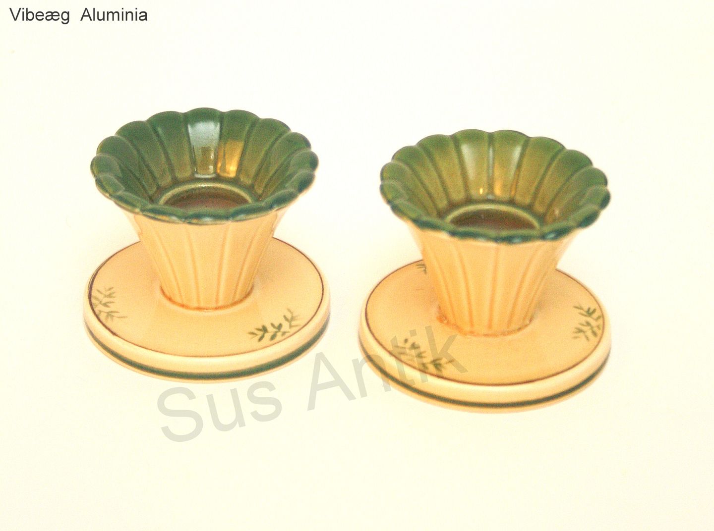 Aluminia fajance, Vibeæg. Motiv violet og grøn vibeæg blomst. Flettet kant. Formgivet af Nils Thorsson. Produceret i perioden 1934-1967. Lysestage. Højde 5 cm. Diameter 7 cm. Flot stand. Pris: SOLGT