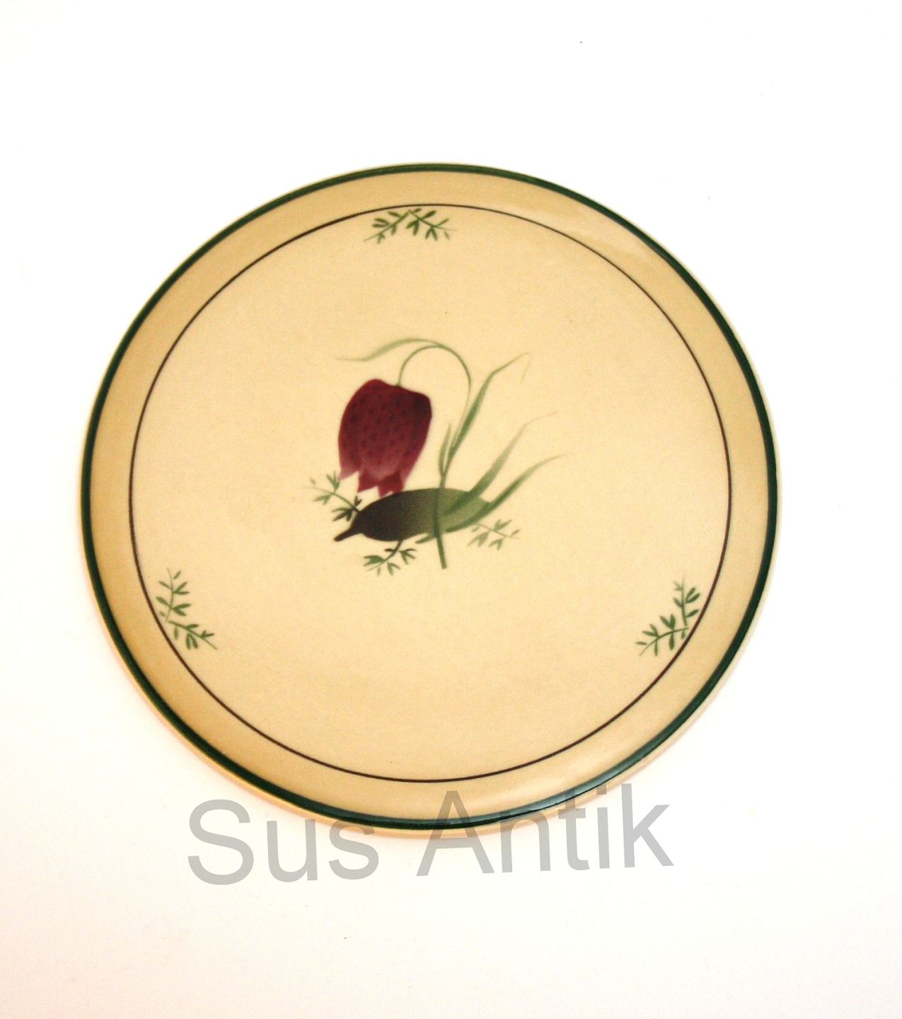 Aluminia fajance, Vibeæg. Motiv violet og grøn vibeæg blomst. Flettet kant. Formgivet af Nils Thorsson. Produceret i perioden 1934-1967. Smørbrik. Diameter ca. 15 cm. God stand med overfladekrakeleringer. Pris: SOLGT
