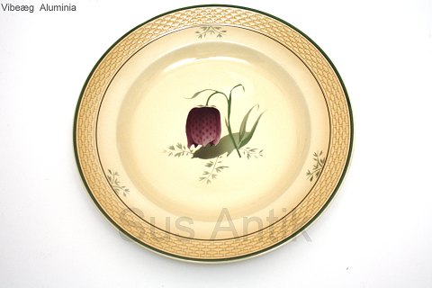 Aluminia fajance, Vibeæg. Motiv violet og grøn vibeæg blomst. Flettet kant. Formgivet af Nils Thorsson. Produceret i perioden 1934-1967. Lågfad grøntsagsterrin. Højde 13 cm. Diameter 21,5 cm. Flot stand. Pris: 300 kr.